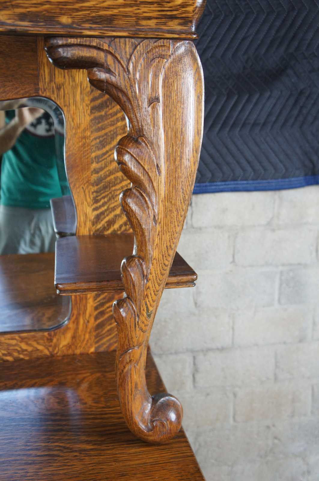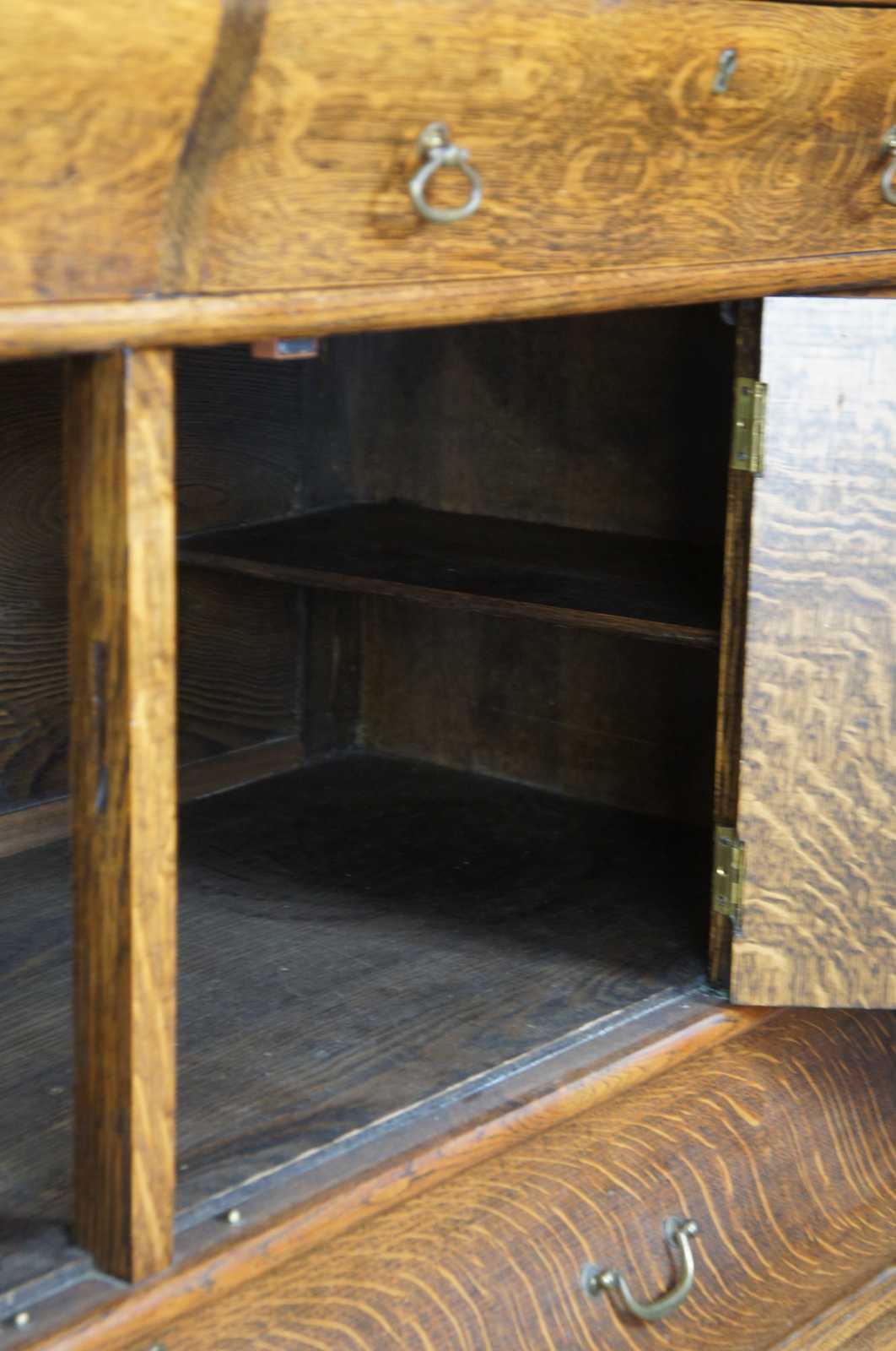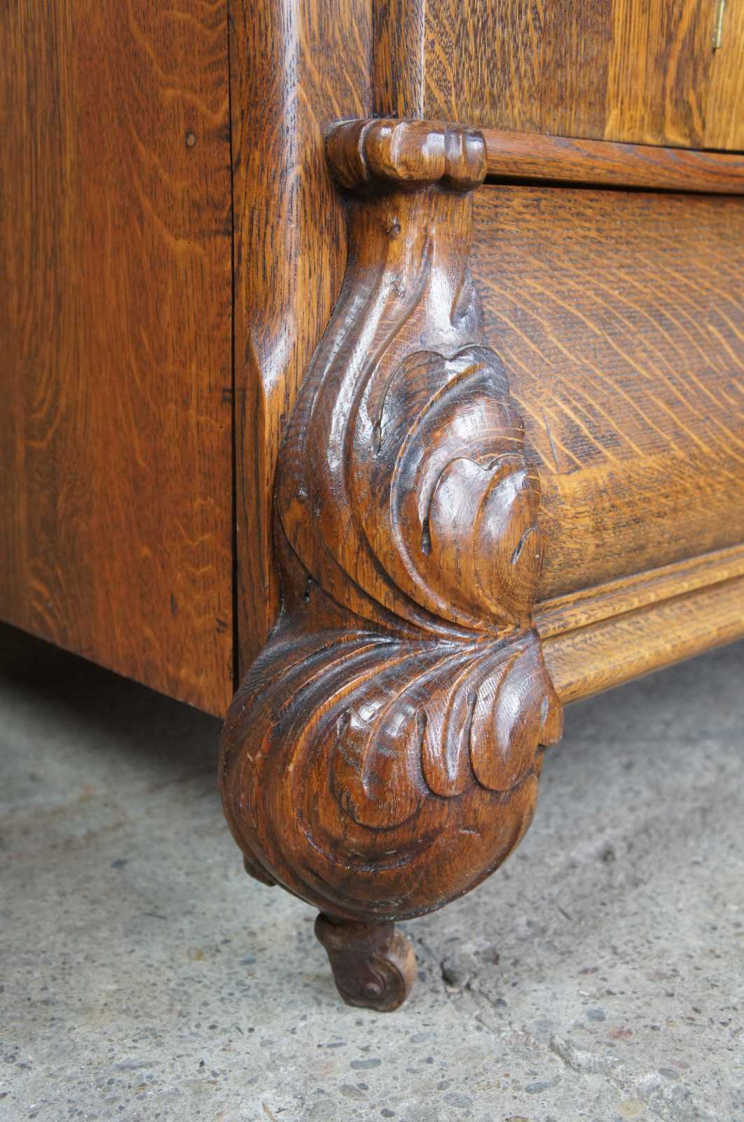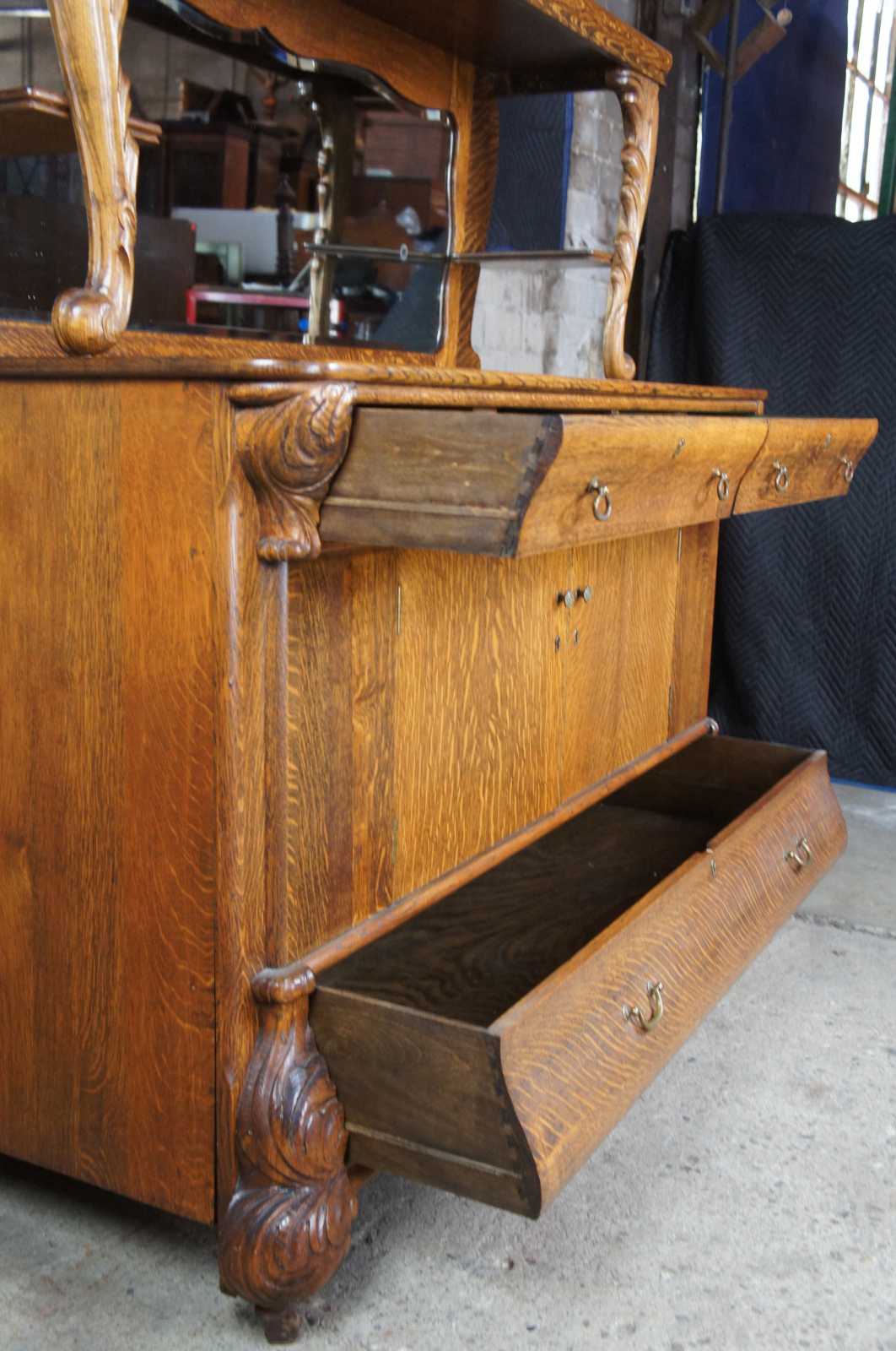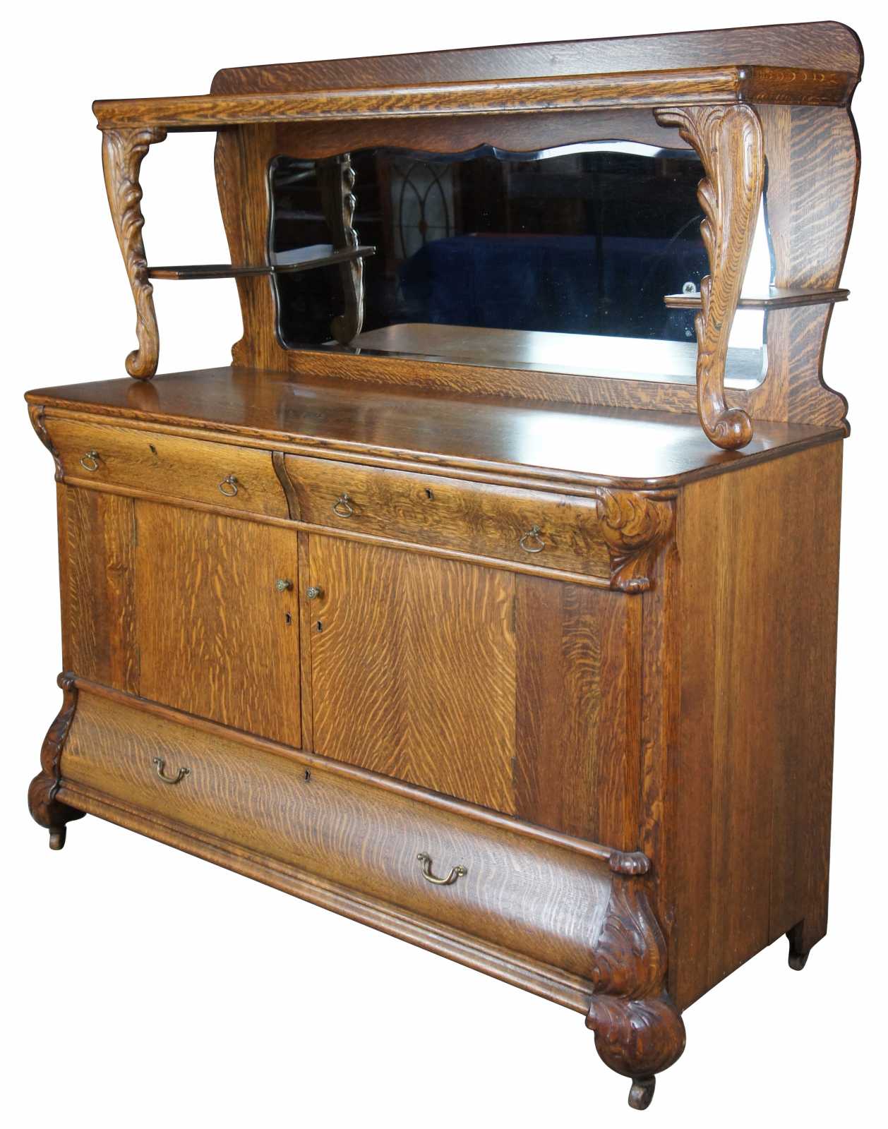 Turn of the 20th century oak sideboard with mirror. Features a large upper surface making it perfect for use as a bar back. Includes three drawers, interior cabinet with shelves and serpentine beveled mirror. On castors for ease of movement.