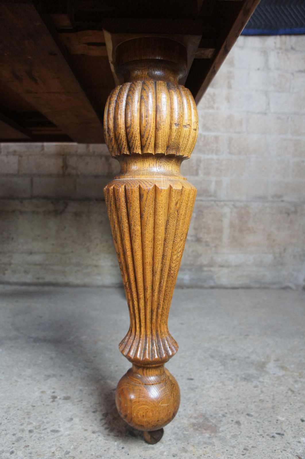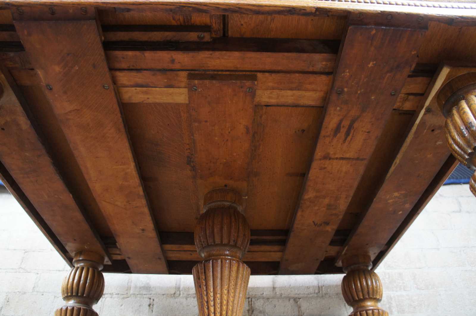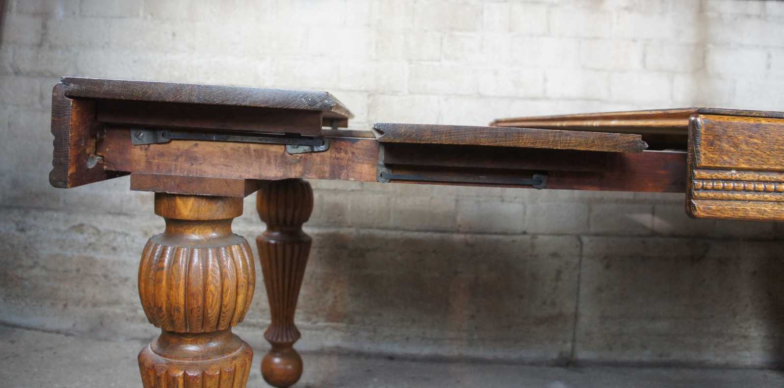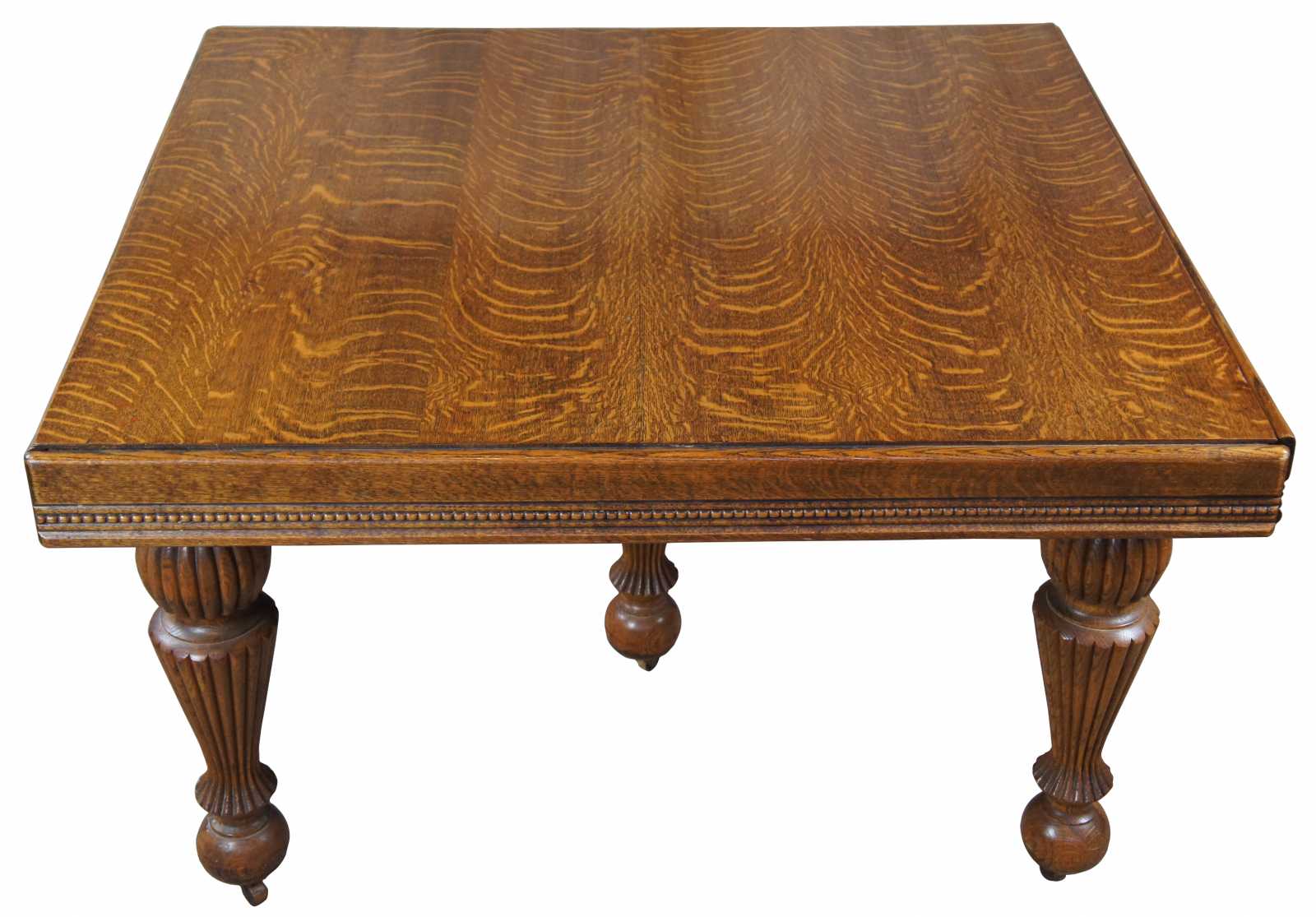 Turn of the 20th century quartersawn tiger oak dining table. Features a beaded apron over five robust reeded baluster legs. Opens with a draw leaf style design to extendable leaves on each side which can be used for variable extendable lengths.