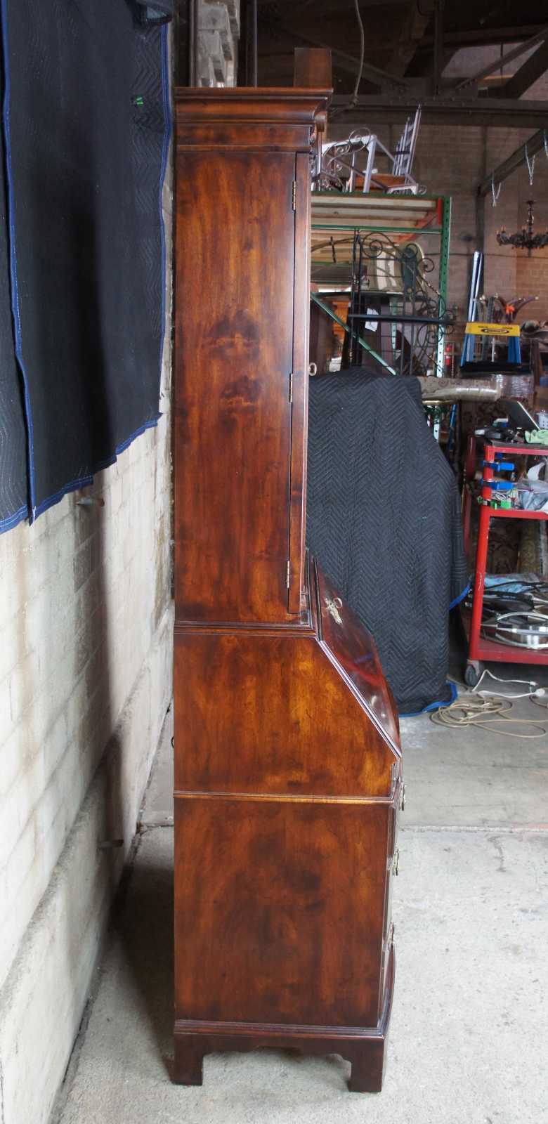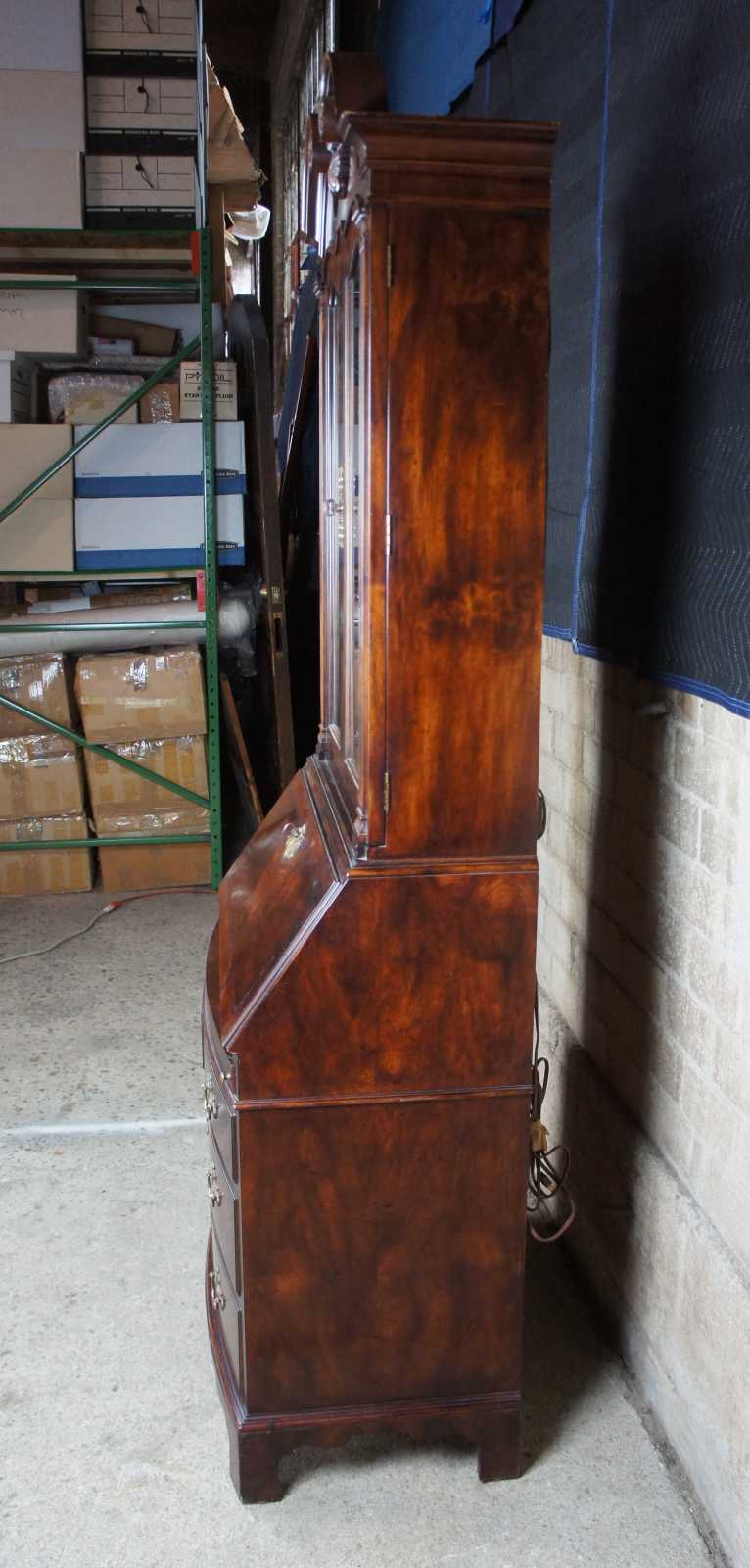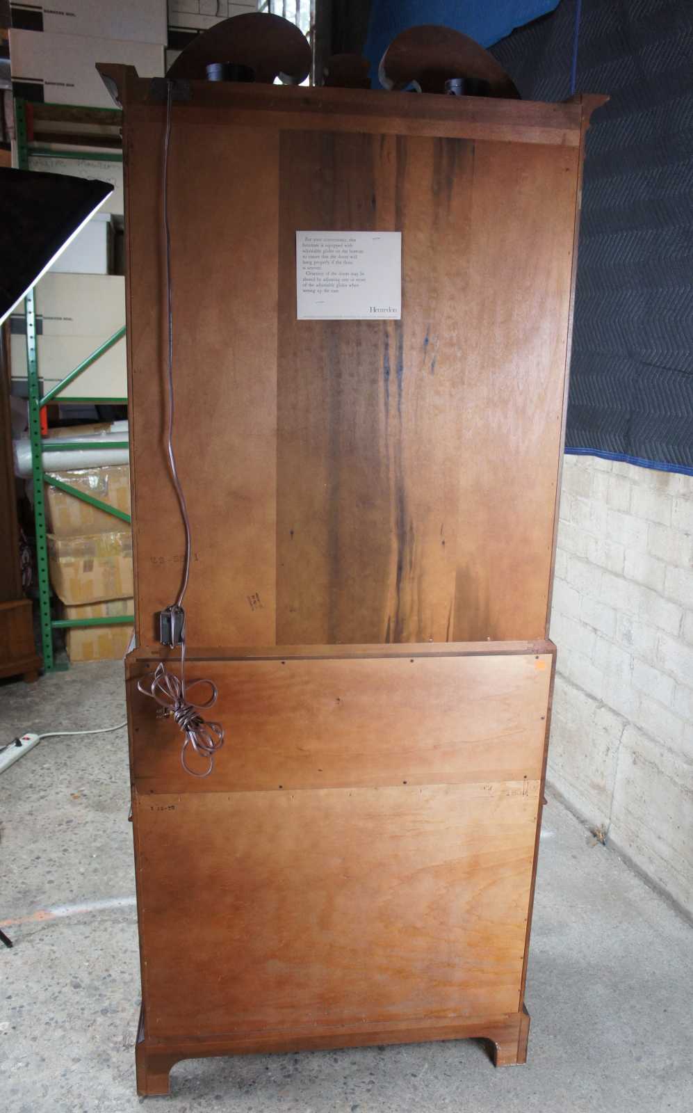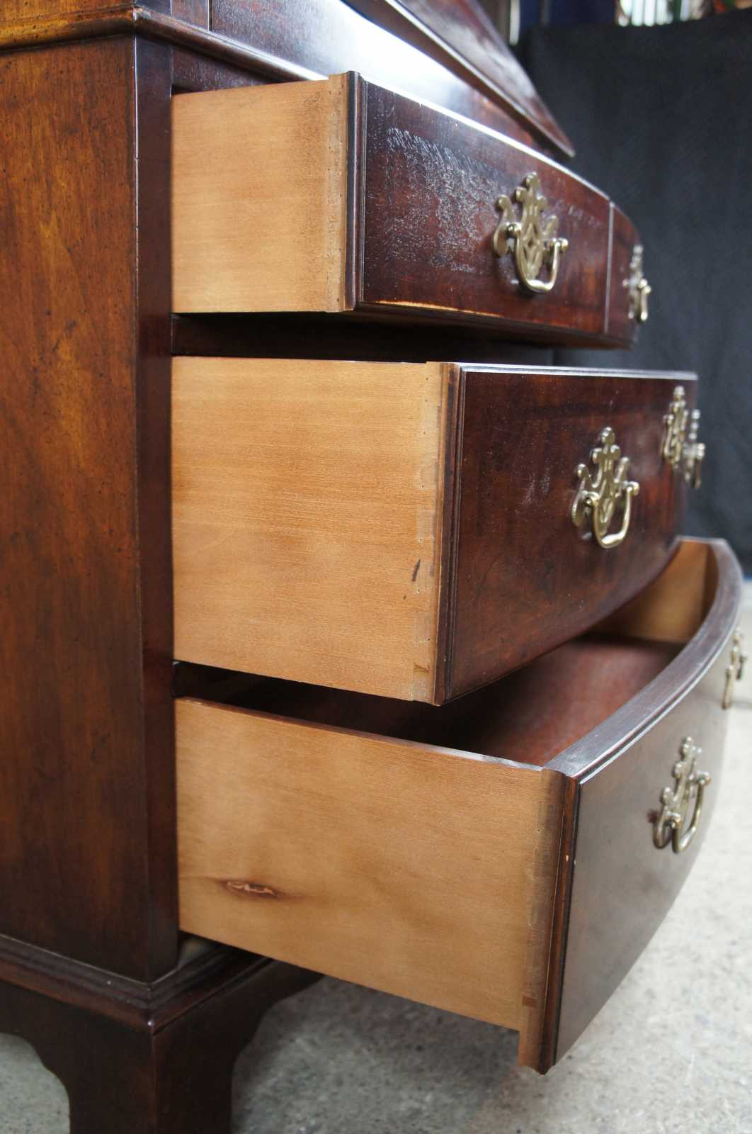 A Chippendale style bow front secretary desk by Henredon from their Folio 10 collection. Made of walnut in the USA in the late 20th Century. Upper cabinet features pediment top, two adjustable glass shelves behind glass doors and is lighted. Bottom features drop front desk concealing small drawers and cubbies as well as two small over two large lower dovetail drawers.