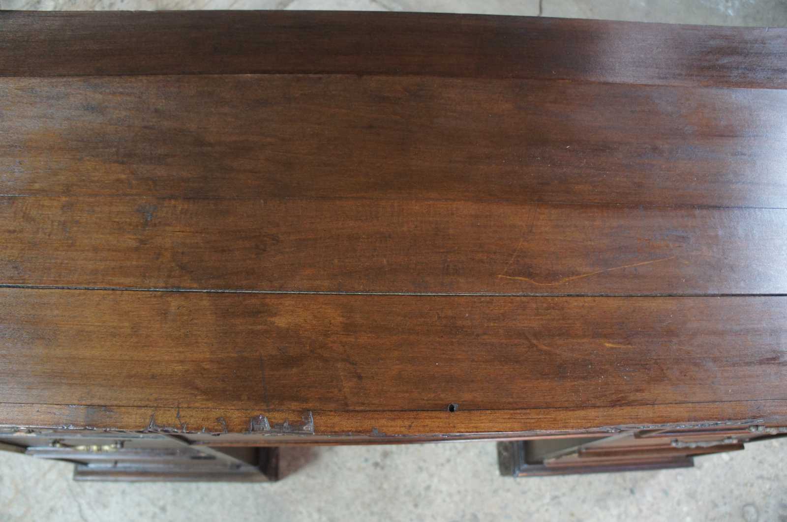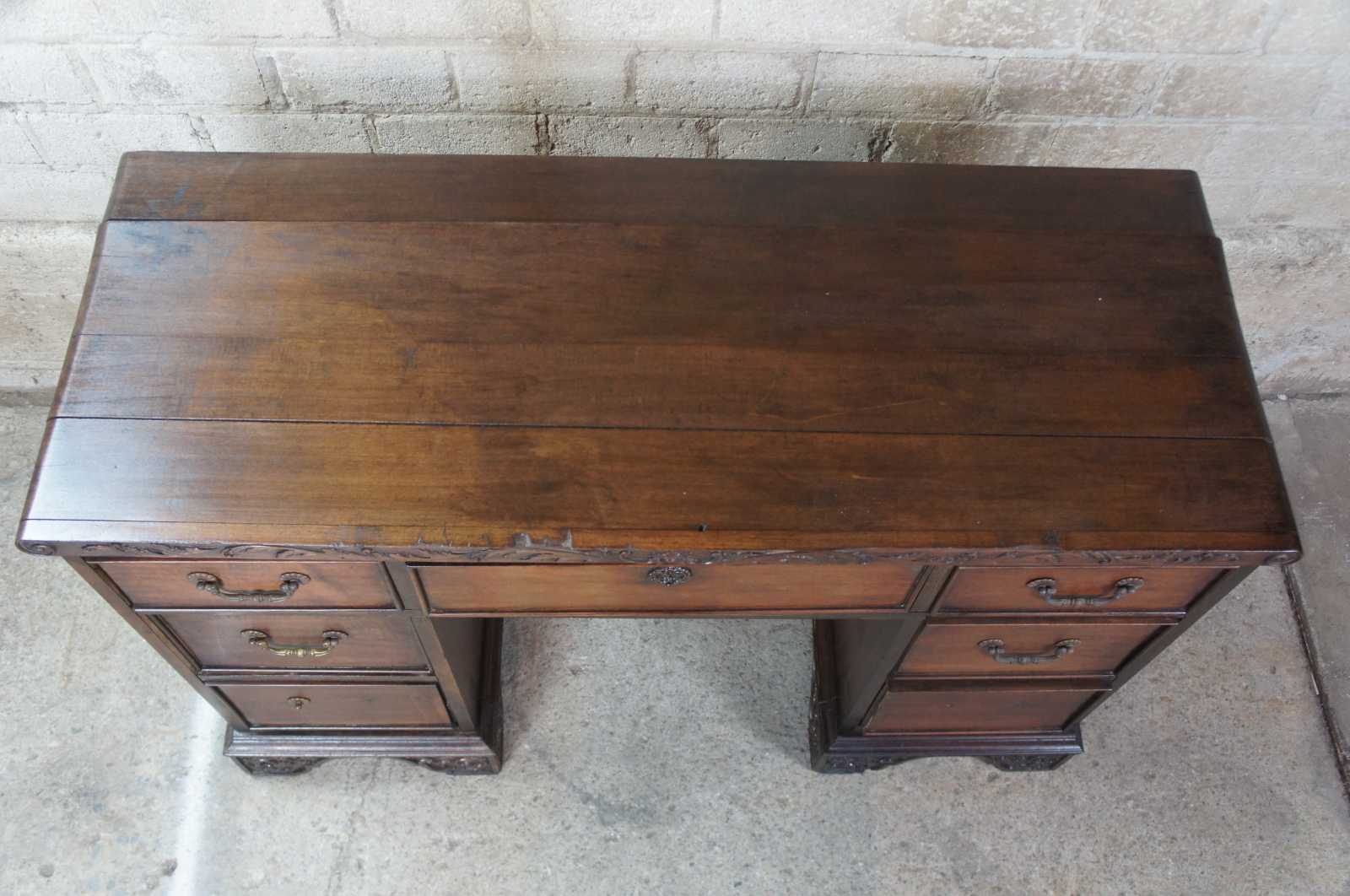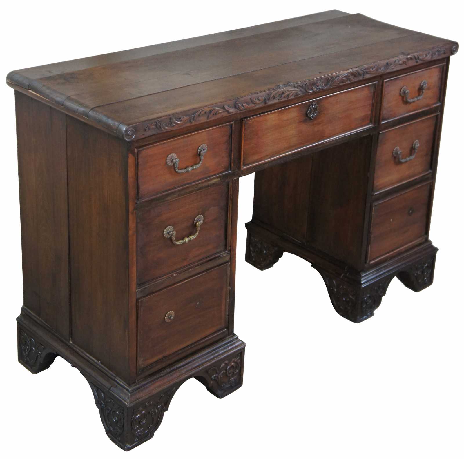 Circa 1940s Rococo Revival desk. Made from walnut with seven drawers and ornately carved detail.
