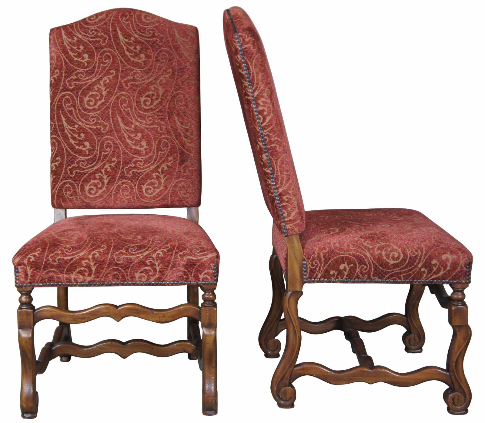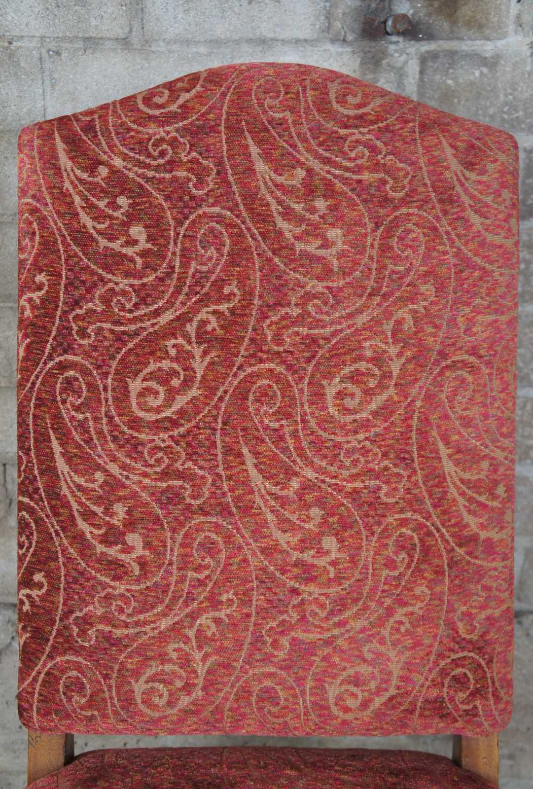 Set of ten Arte De Mexico style oak chairs. Features Tuscan / Spanish Revival or Louis XIII styling with a paisley upholstery accented with nailhead trim. Scrolled feet are connected by serpentine H stretcher.