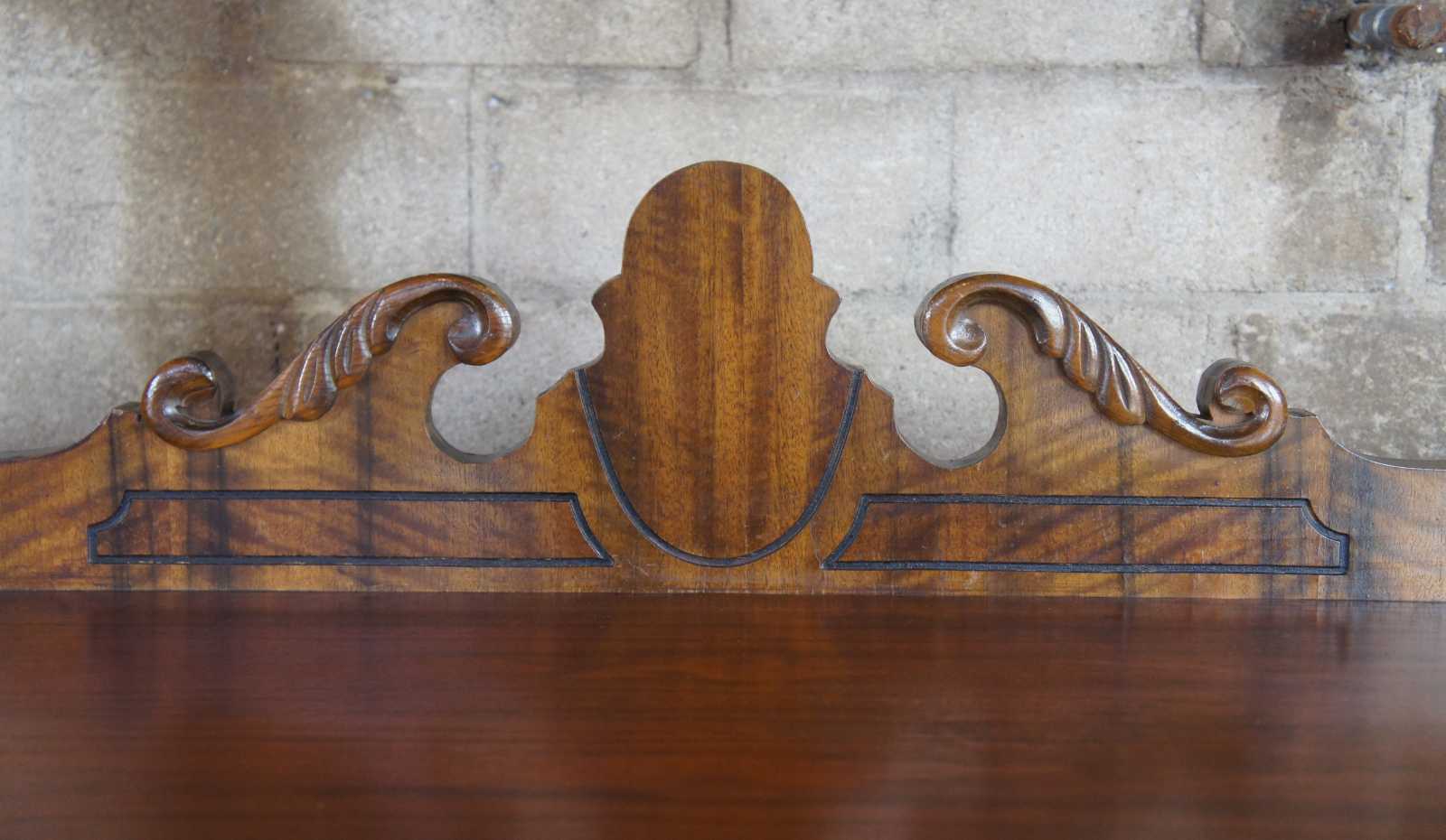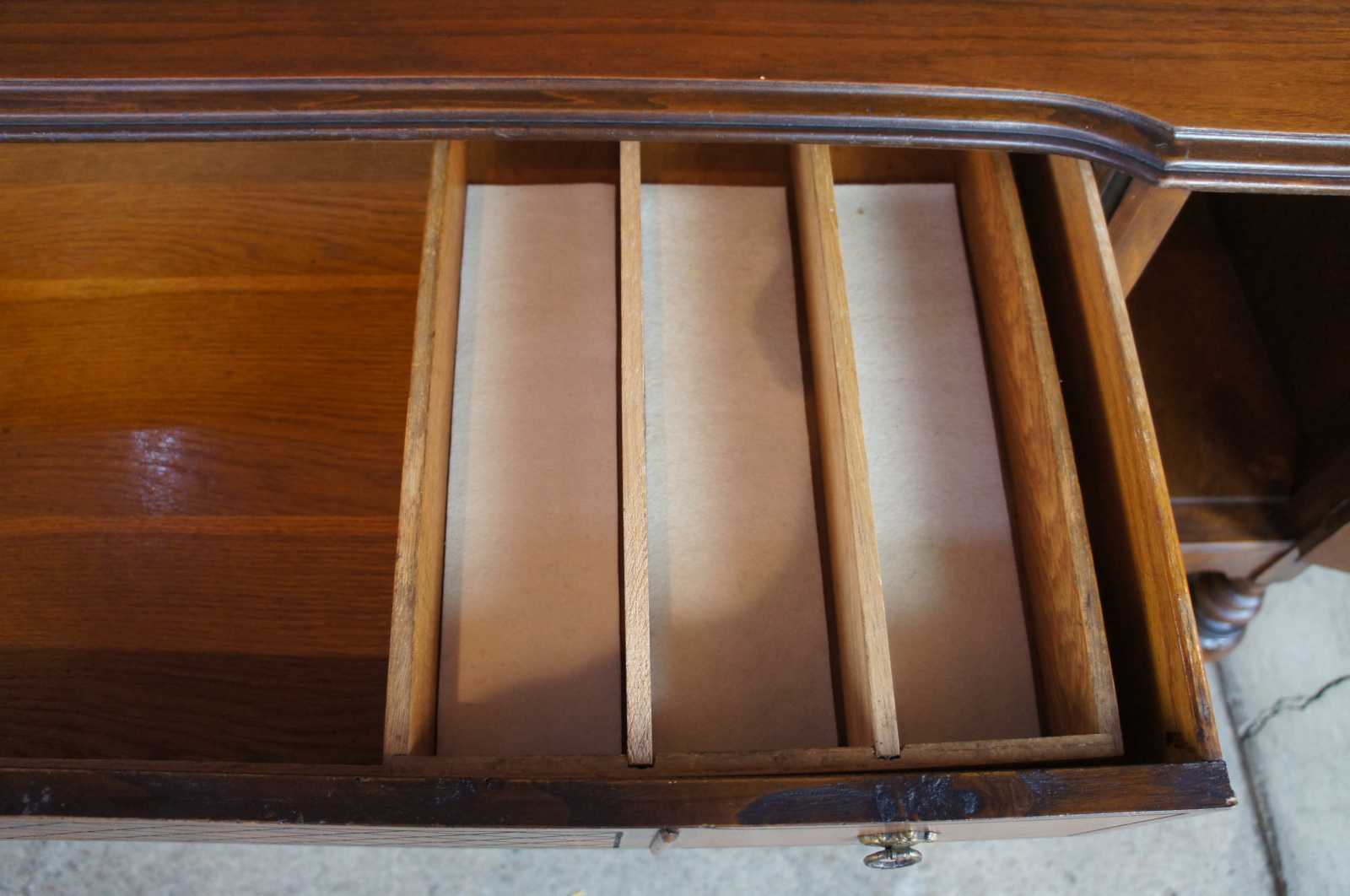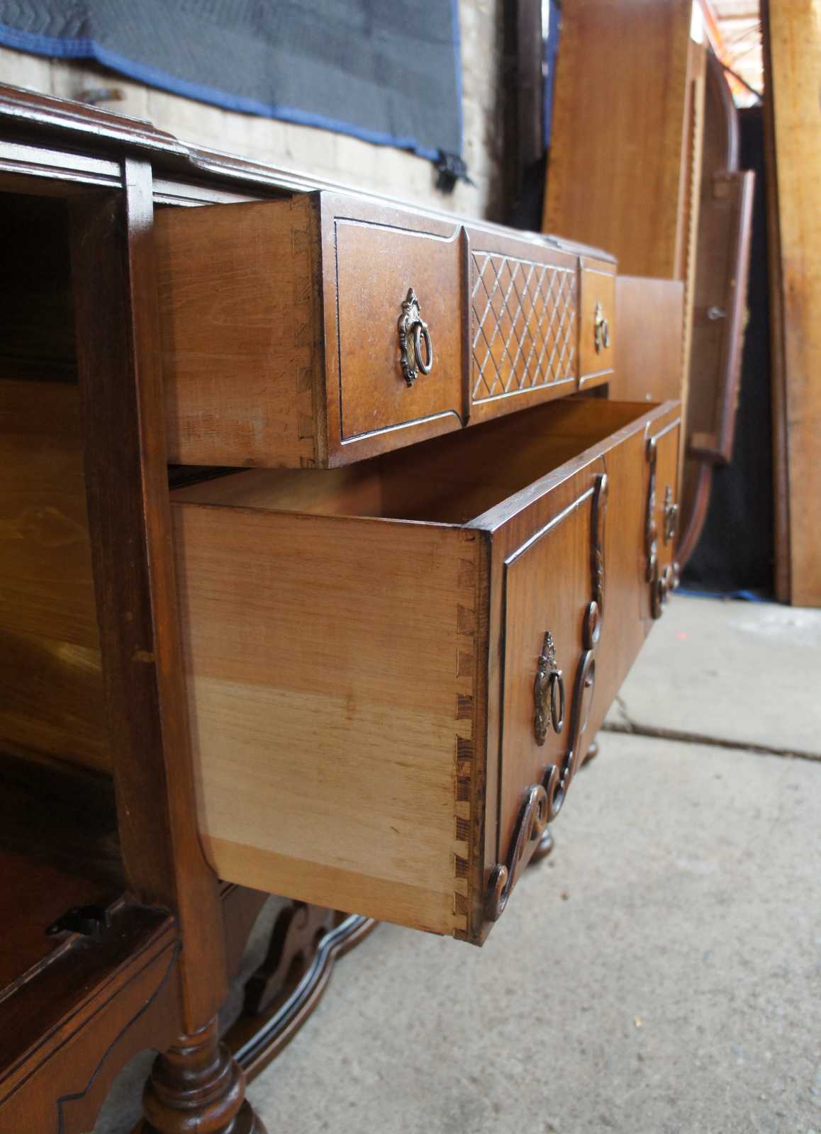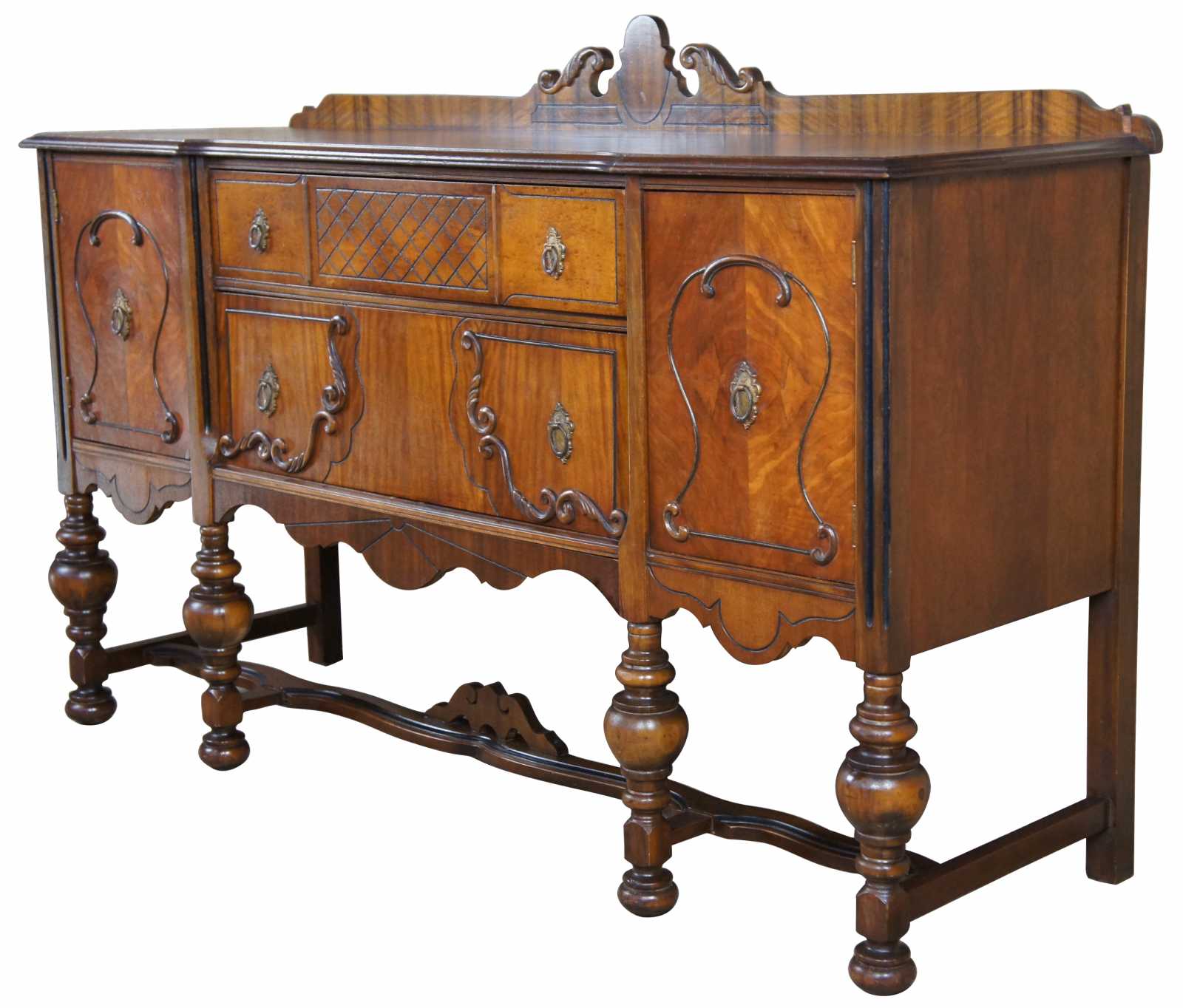 Turn of the century Jacobean or Elizabethan style sideboard. Made from walnut with burled fron, robust turned legs, ornate serpentine trestle base, and scolled accents.. Features two long central drawers flanked by outer cabinets.