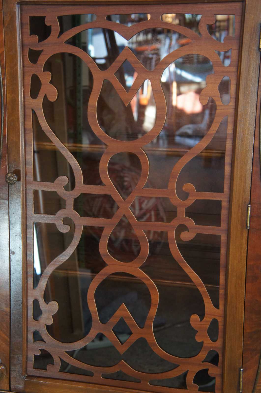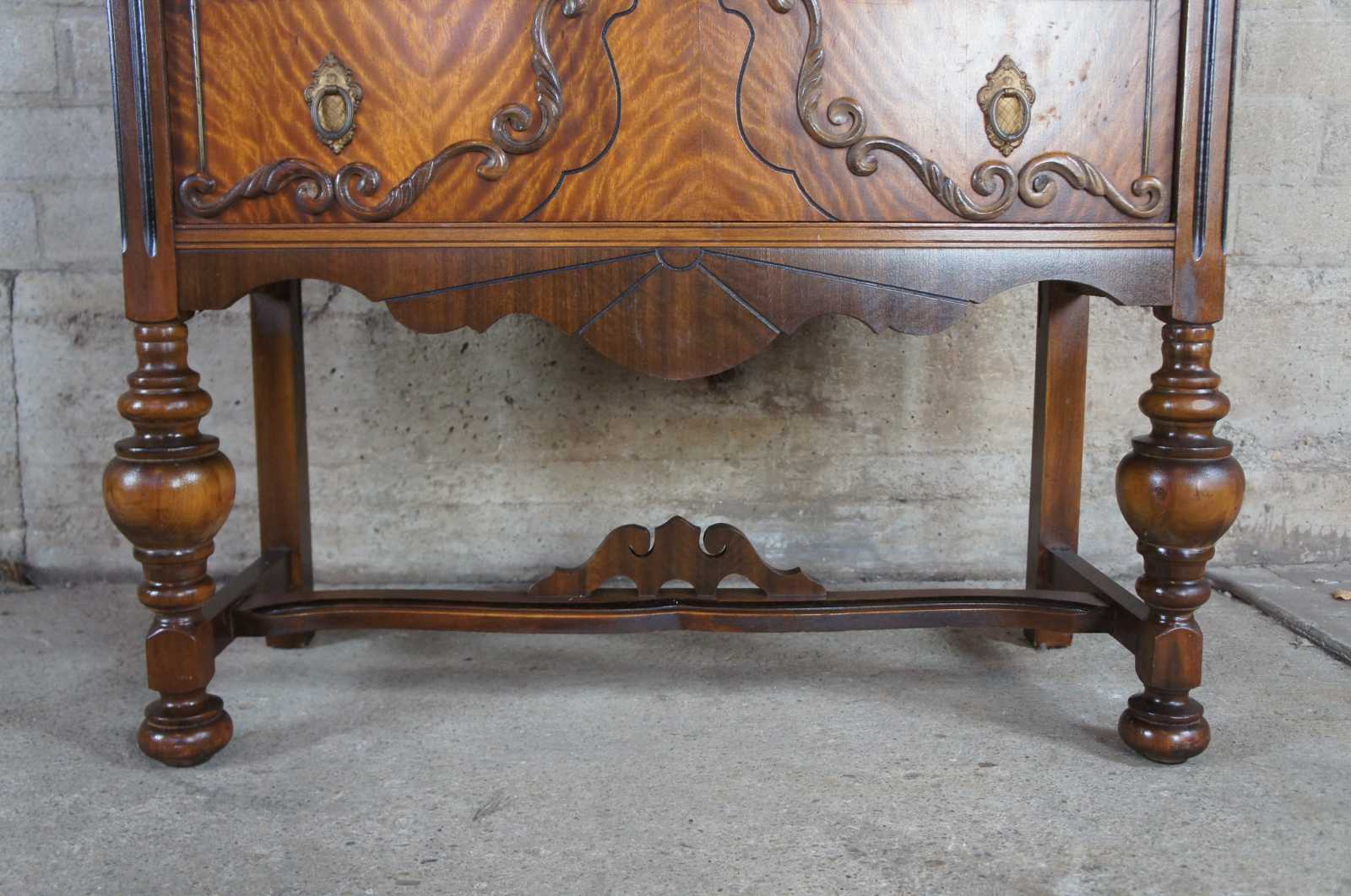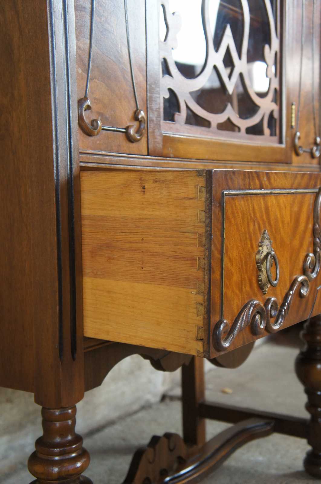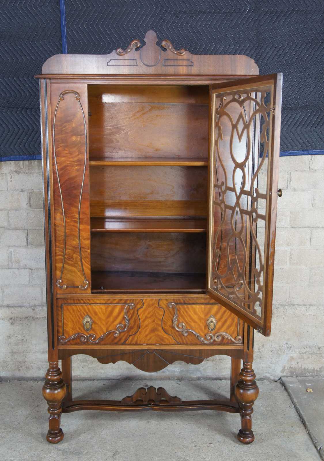 Early 20th century Jacobean style china cabinet. Made from walnut with a burled front. Features two shelves concealed by a large central door lined with fretwork over dovetailed silverware drawer. Includes a serpentine crown and lower apron. The cabinet is supported by turned ballusters leading to bun feet; connected by an H stretcher.