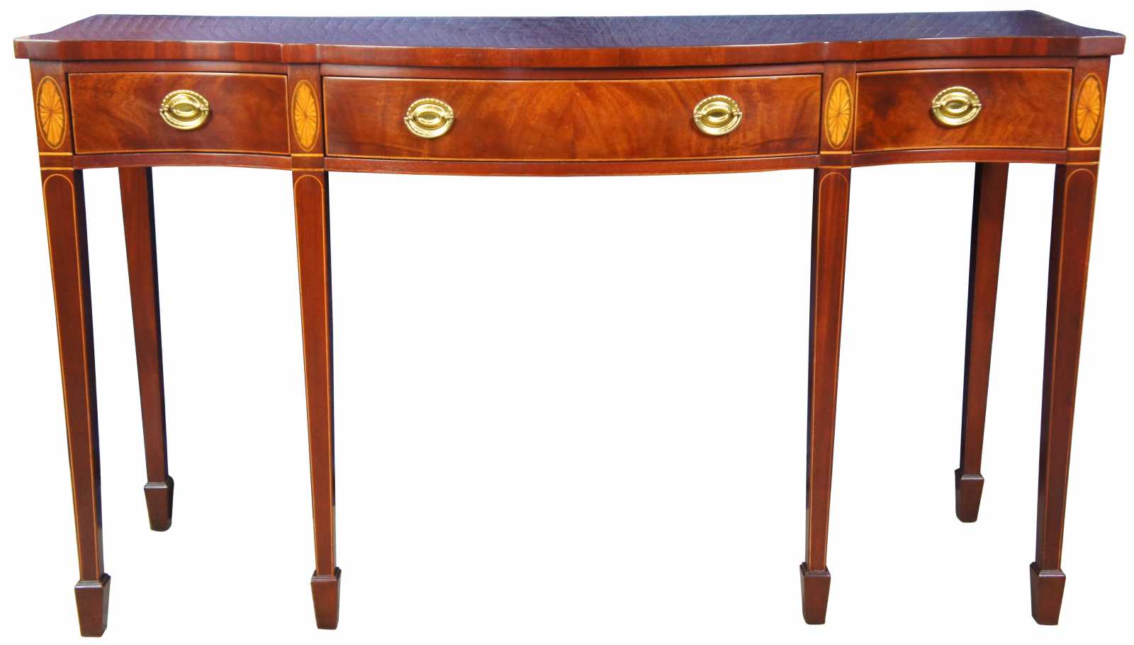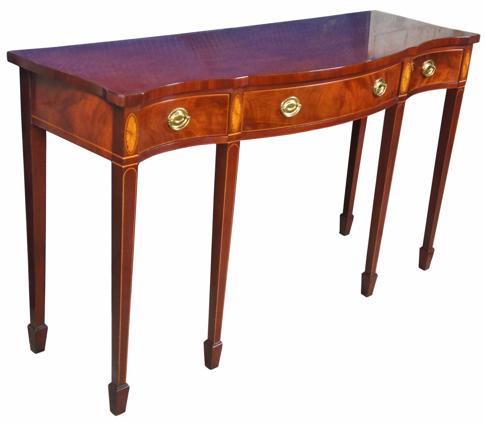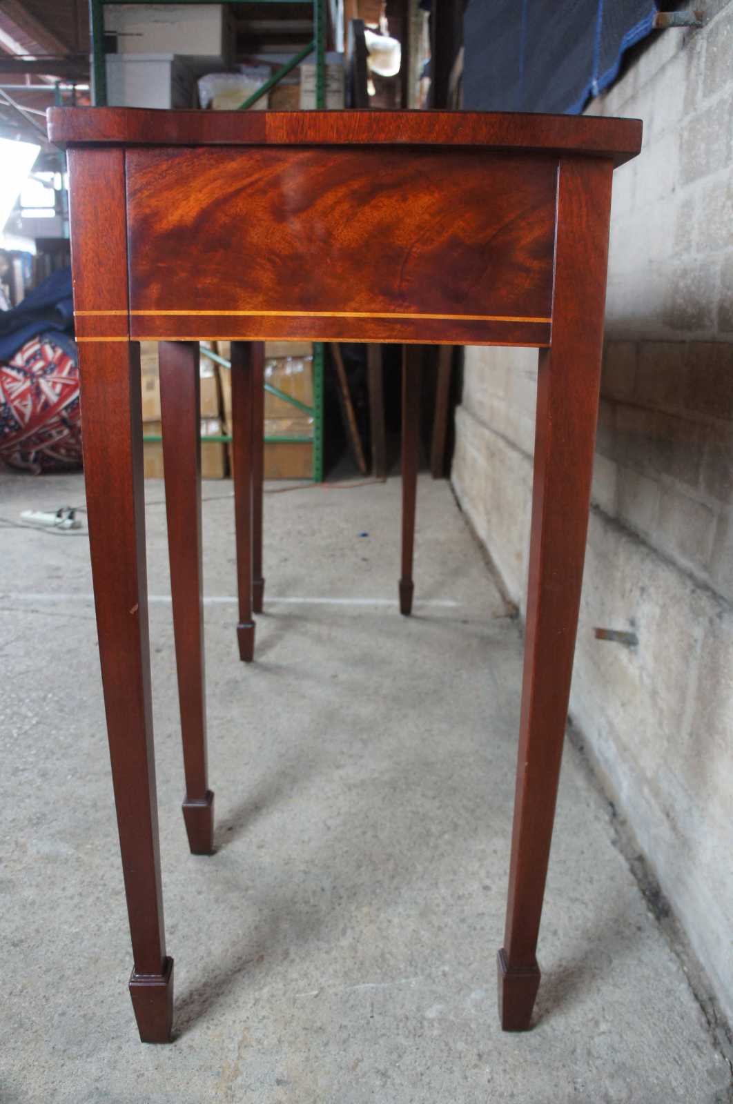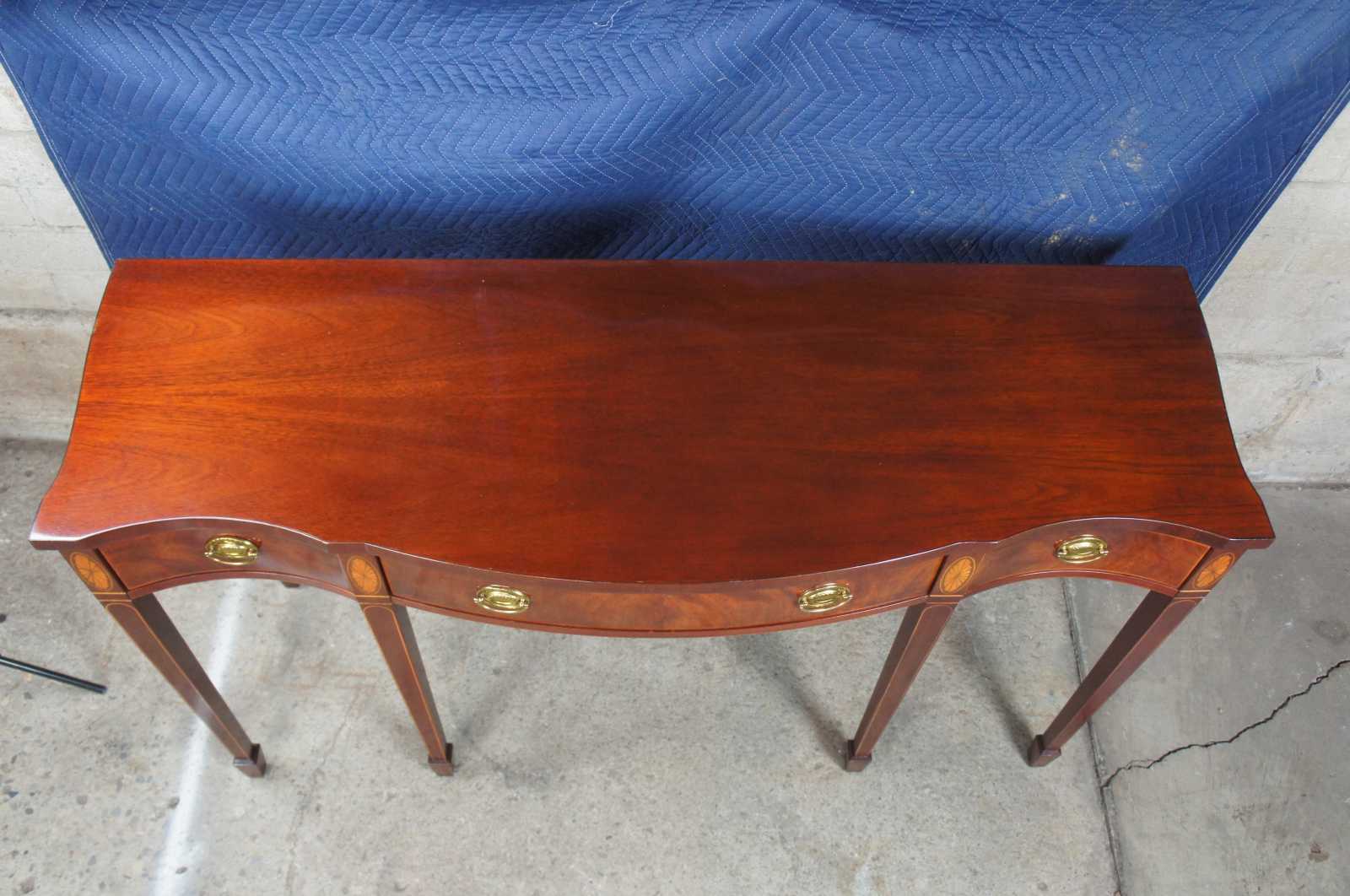 Circa 1990s Baker Historic Charleston three drawer mahogany console table. Features a mixture of Federal and Sheraton styling with a serpentine front leading to book matched mahogany with Satinwood inlay, brass hardware, and long tapered legs leading to spade feet.
