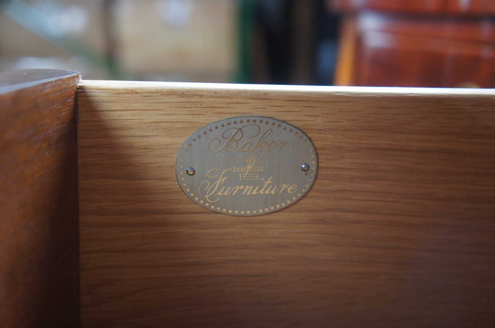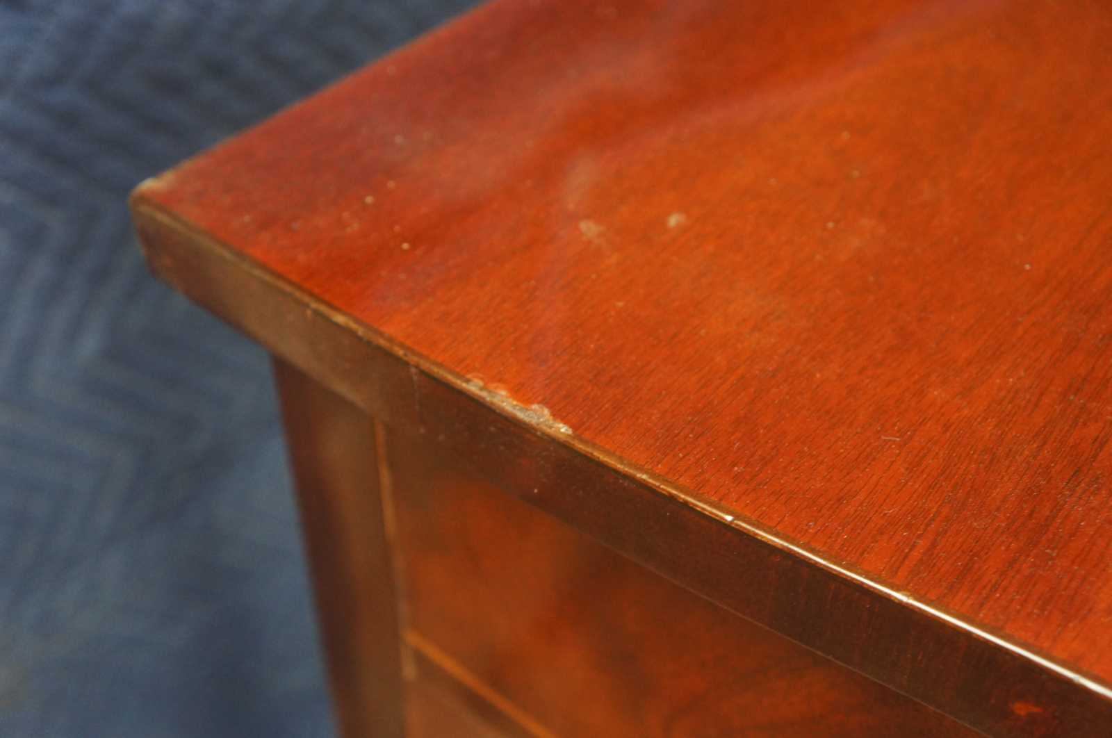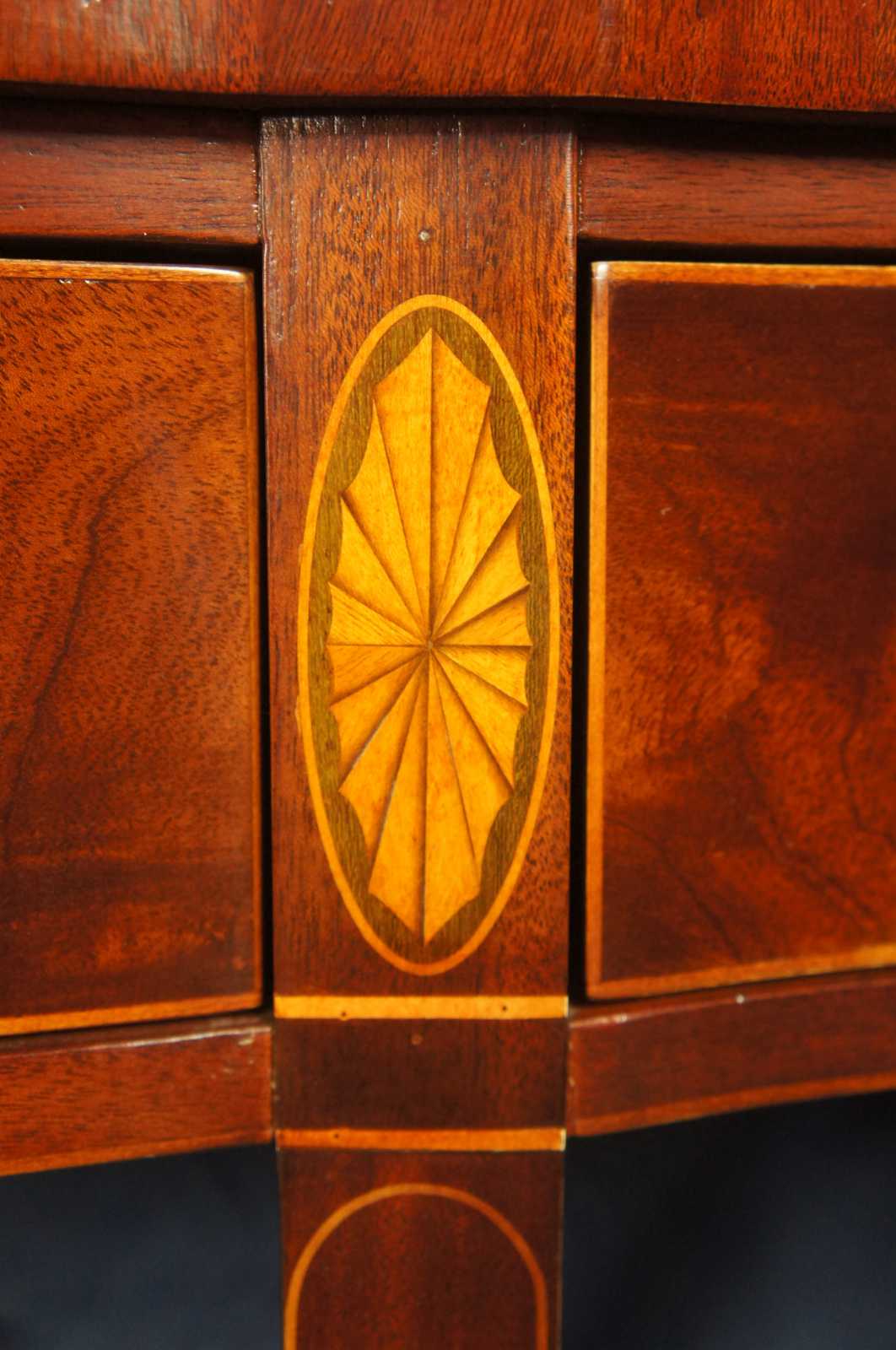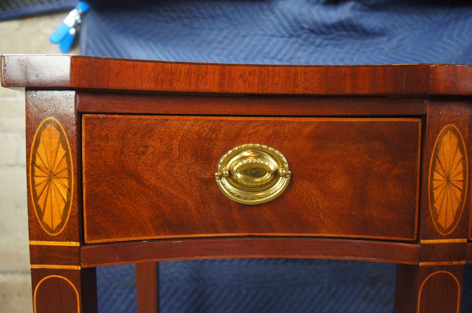 Circa 1990s Baker Historic Charleston three drawer mahogany console table. Features a mixture of Federal and Sheraton styling with a serpentine front leading to book matched mahogany with Satinwood inlay, brass hardware, and long tapered legs leading to spade feet.