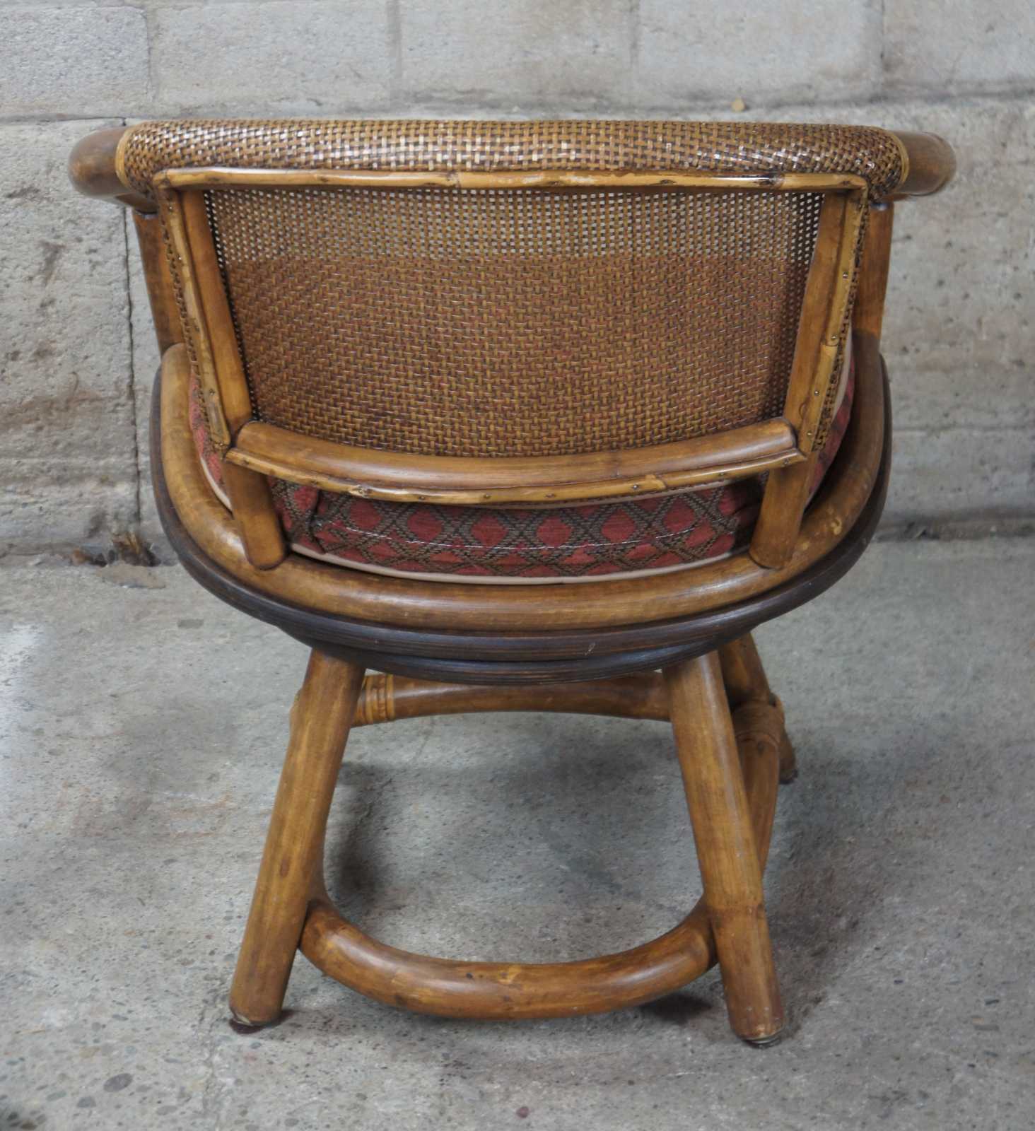 4 Barrel Back 180 Degree Swivel & Return Armchairs With Rattan Backs. A Round walnut Top Table with Bamboo and Rattan Base. Circa 1960's, American