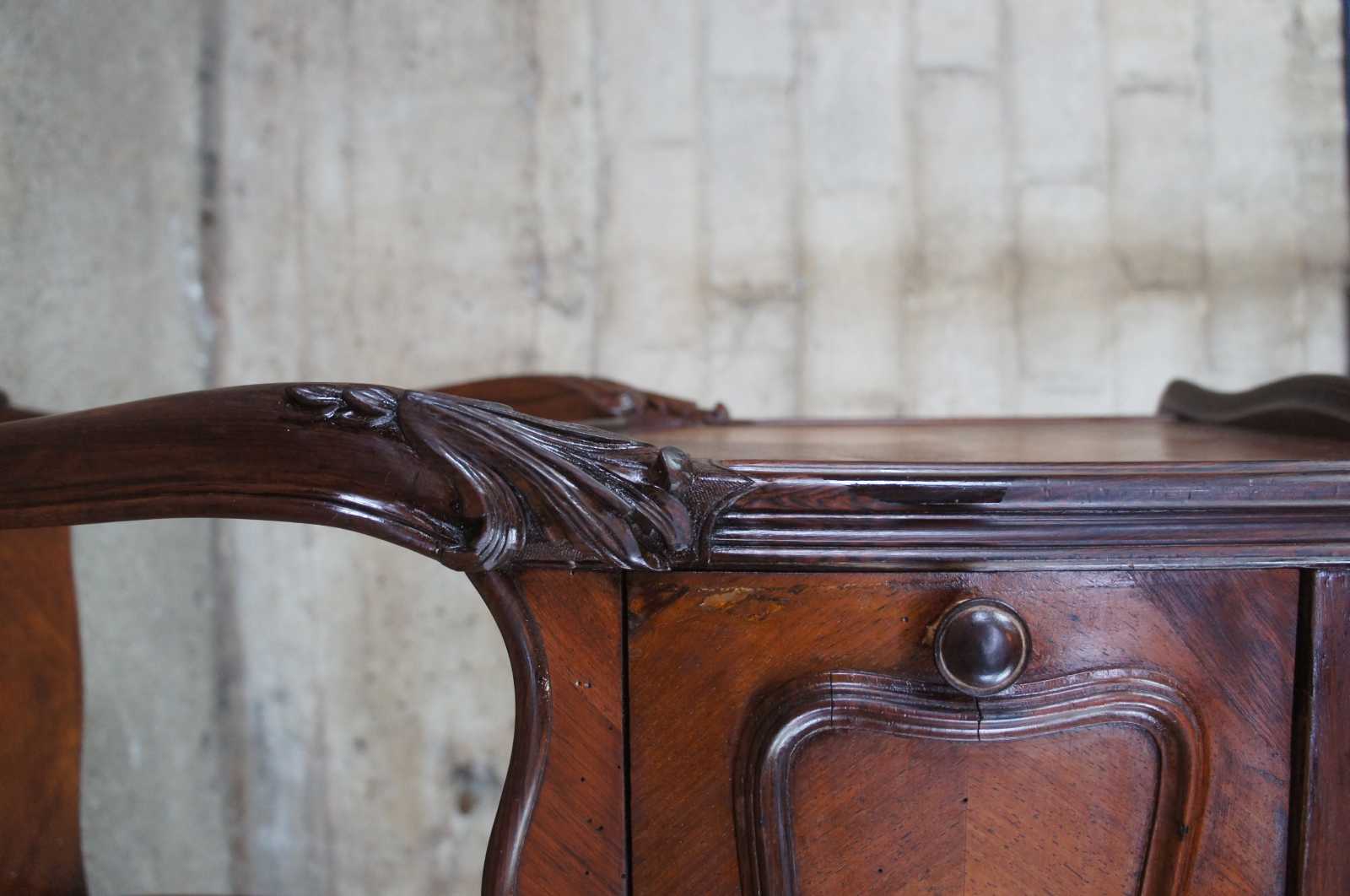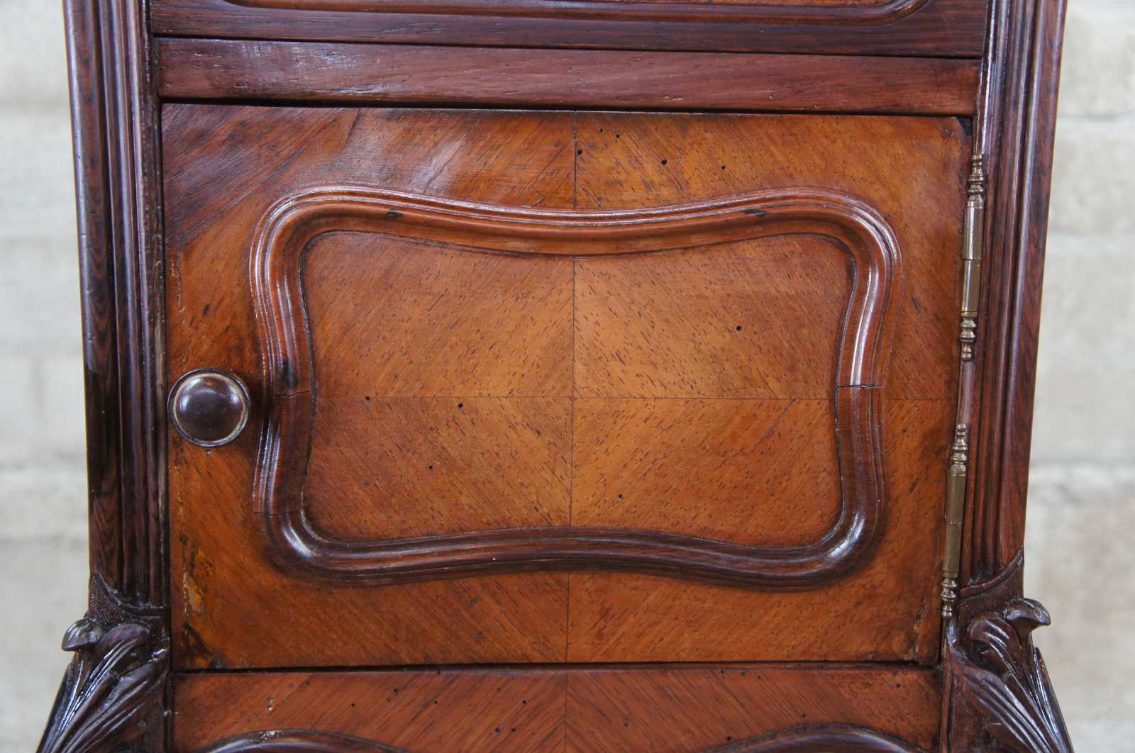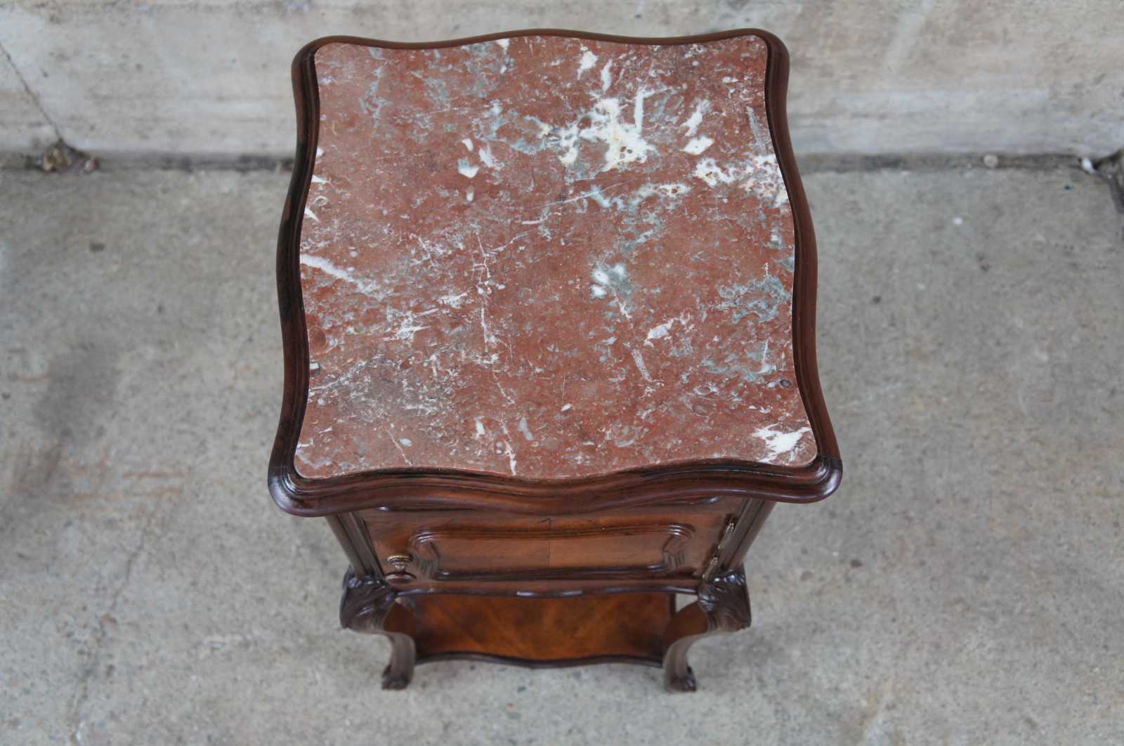 Antique Louis XV French humidor cabinet side table. Made of walnut featuring a serpentine form with two tiers, inset marble top, Matchbook veneered (parquetry) accents, one cabinet (humidor) lined with marble, one dovetailed drawer and scrolled cabriole legs.