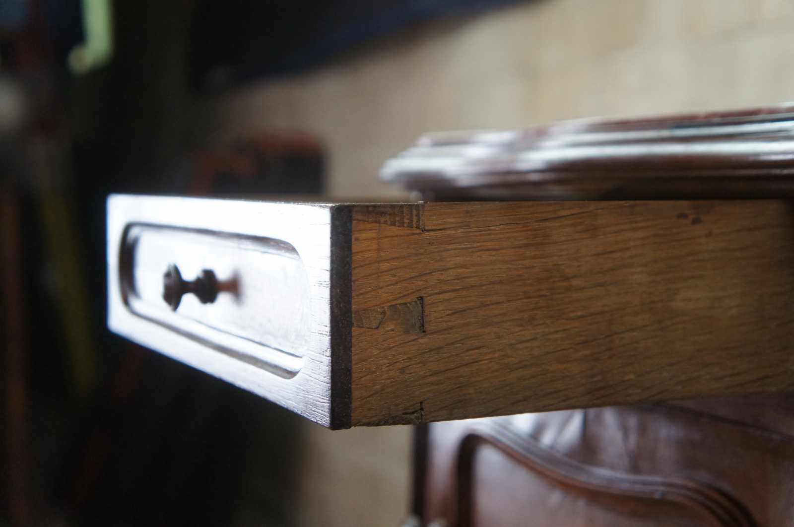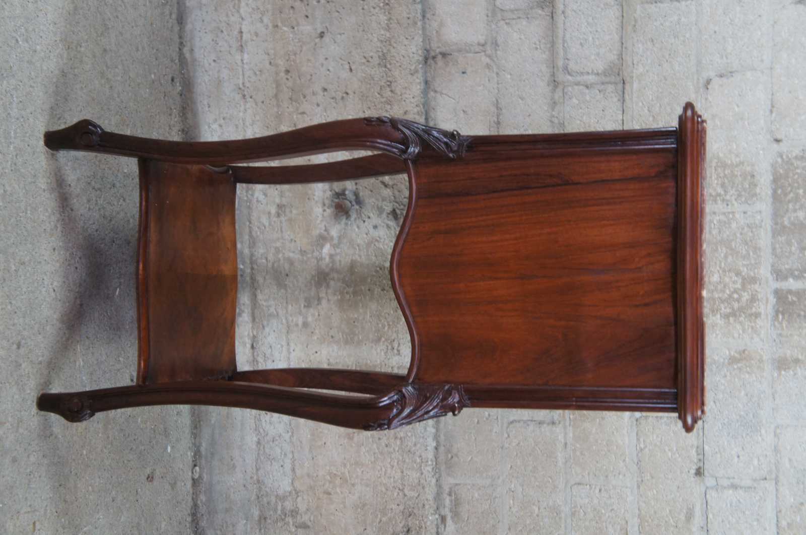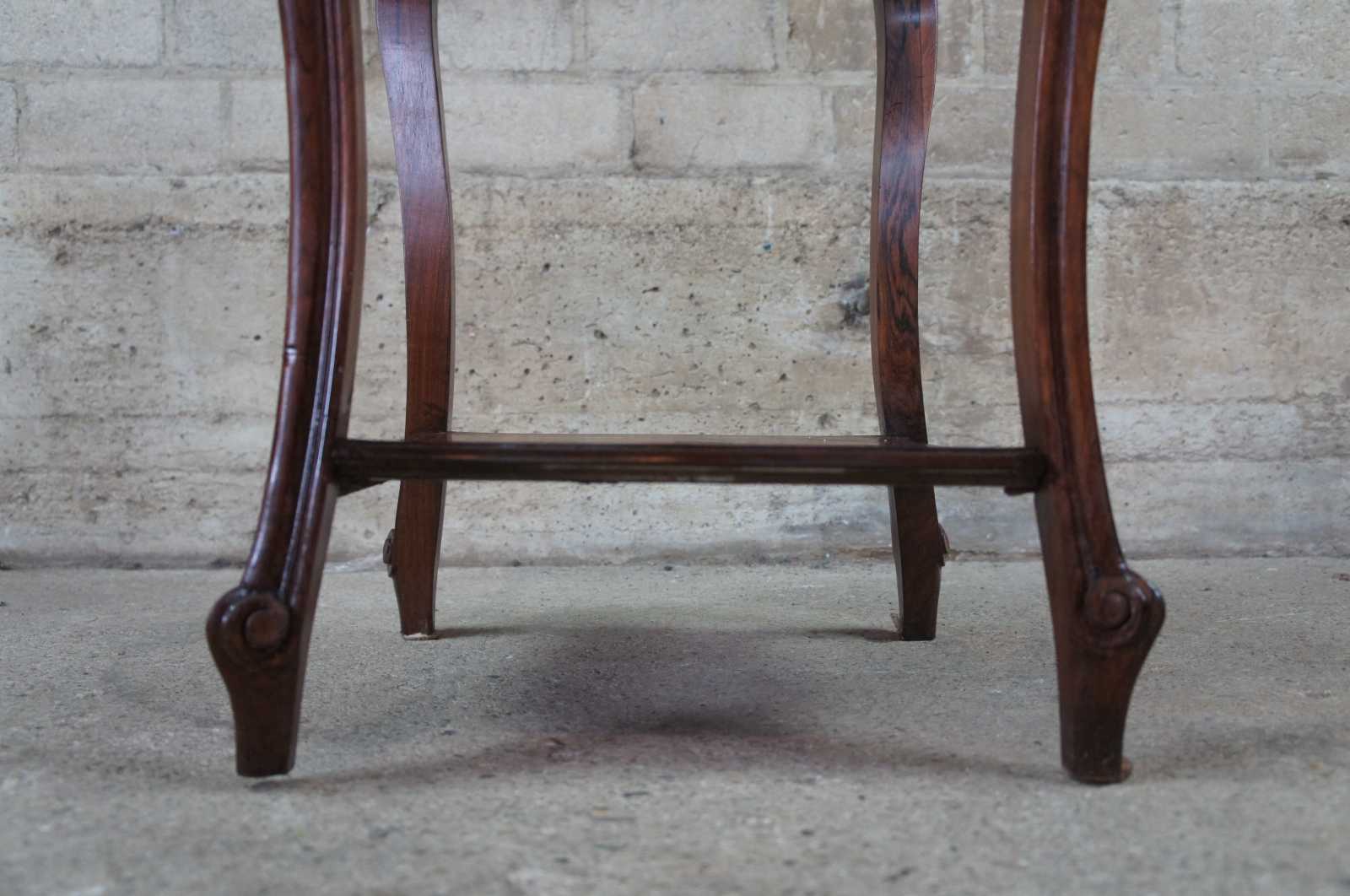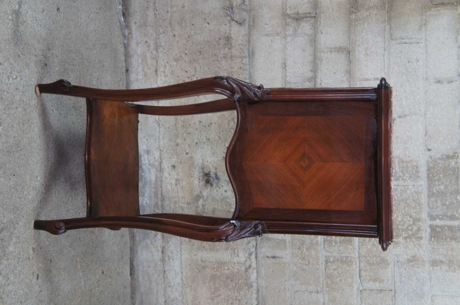 Antique Louis XV French humidor cabinet side table. Made of walnut featuring a serpentine form with two tiers, inset marble top, Matchbook veneered (parquetry) accents, one cabinet (humidor) lined with marble, one dovetailed drawer and scrolled cabriole legs.