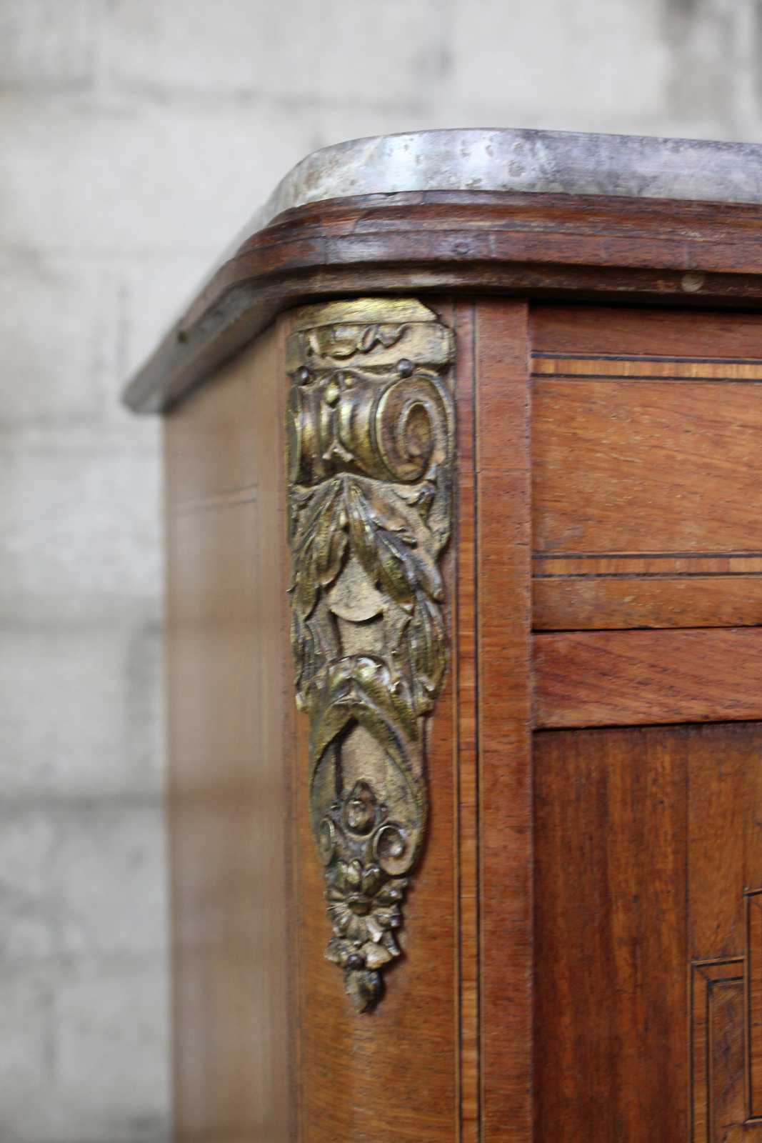 Antique 19th century French humidor table. Features a hand dovetailed drawer and lower marble lined tobacco cabinet. Made from walnut with an inset marble top, ormolu mounts, inlay and burled cabinet front.