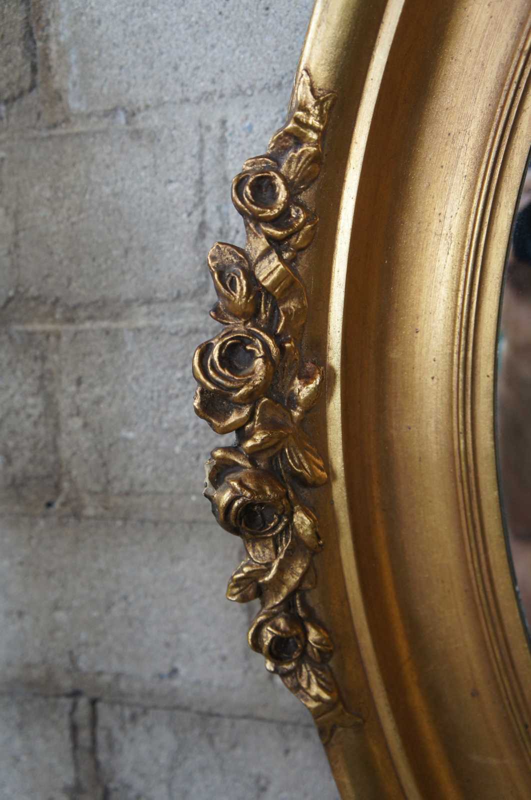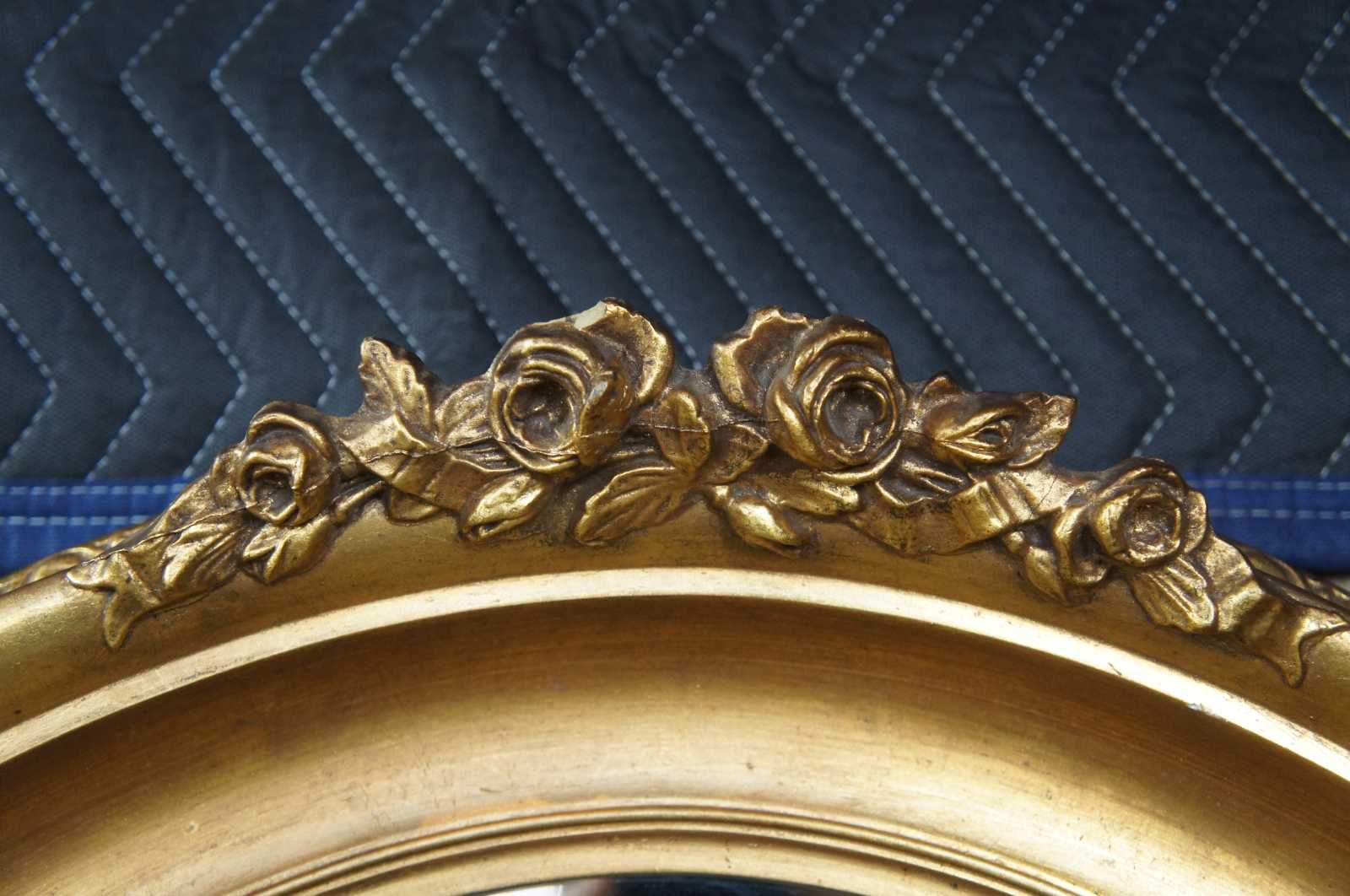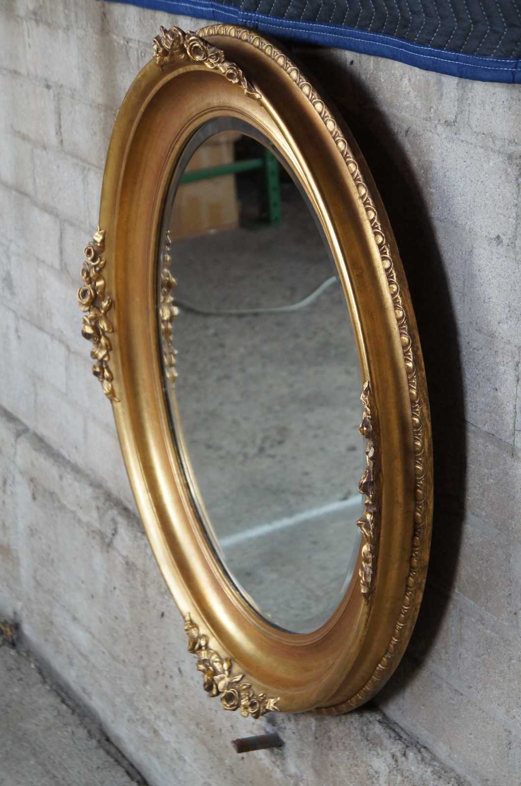 A mid 20th century Victorian inspired mirror. The oval frame features gadrooning trim along the back edge and floral roses and ribbons accents carved along the front edge in gesso.