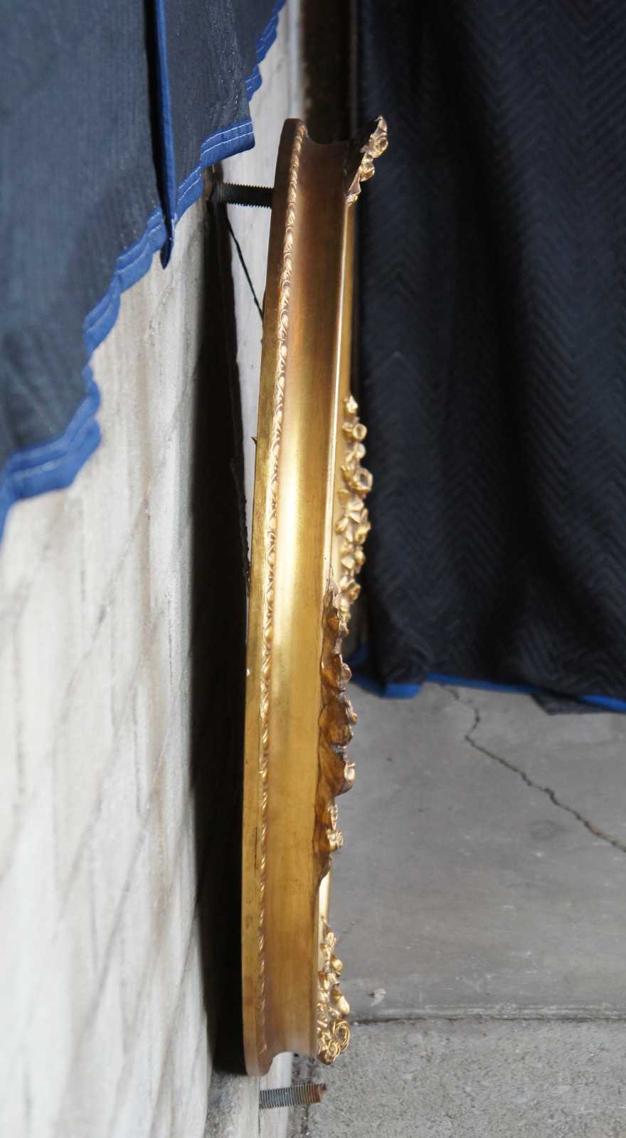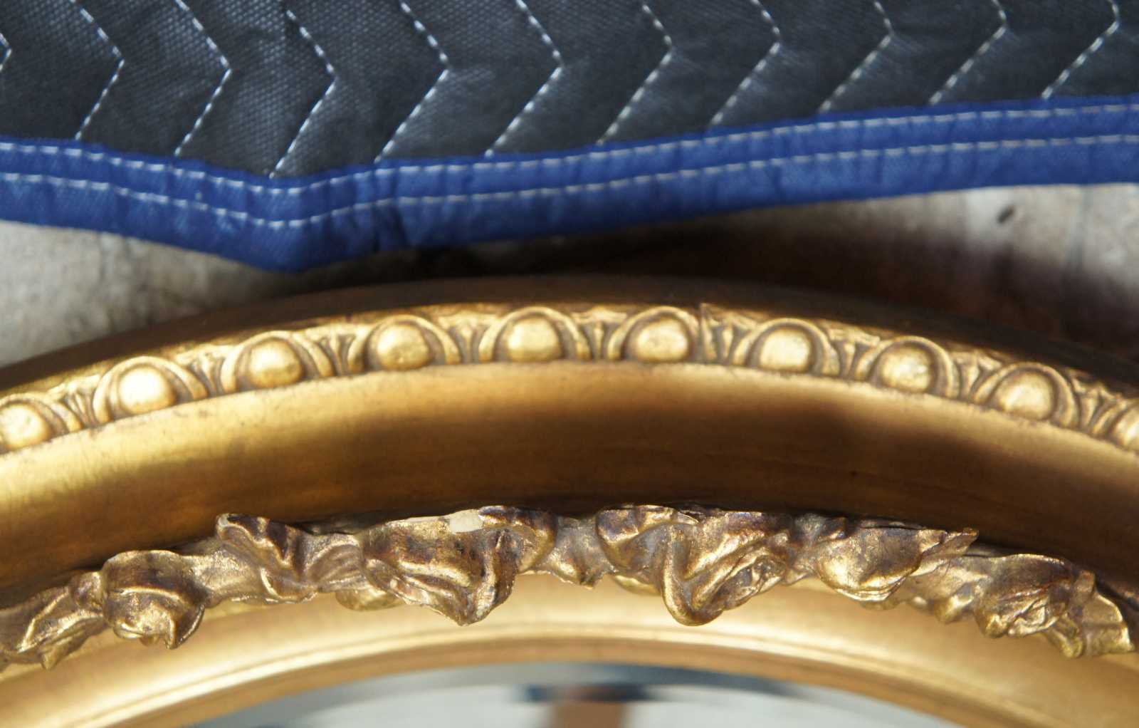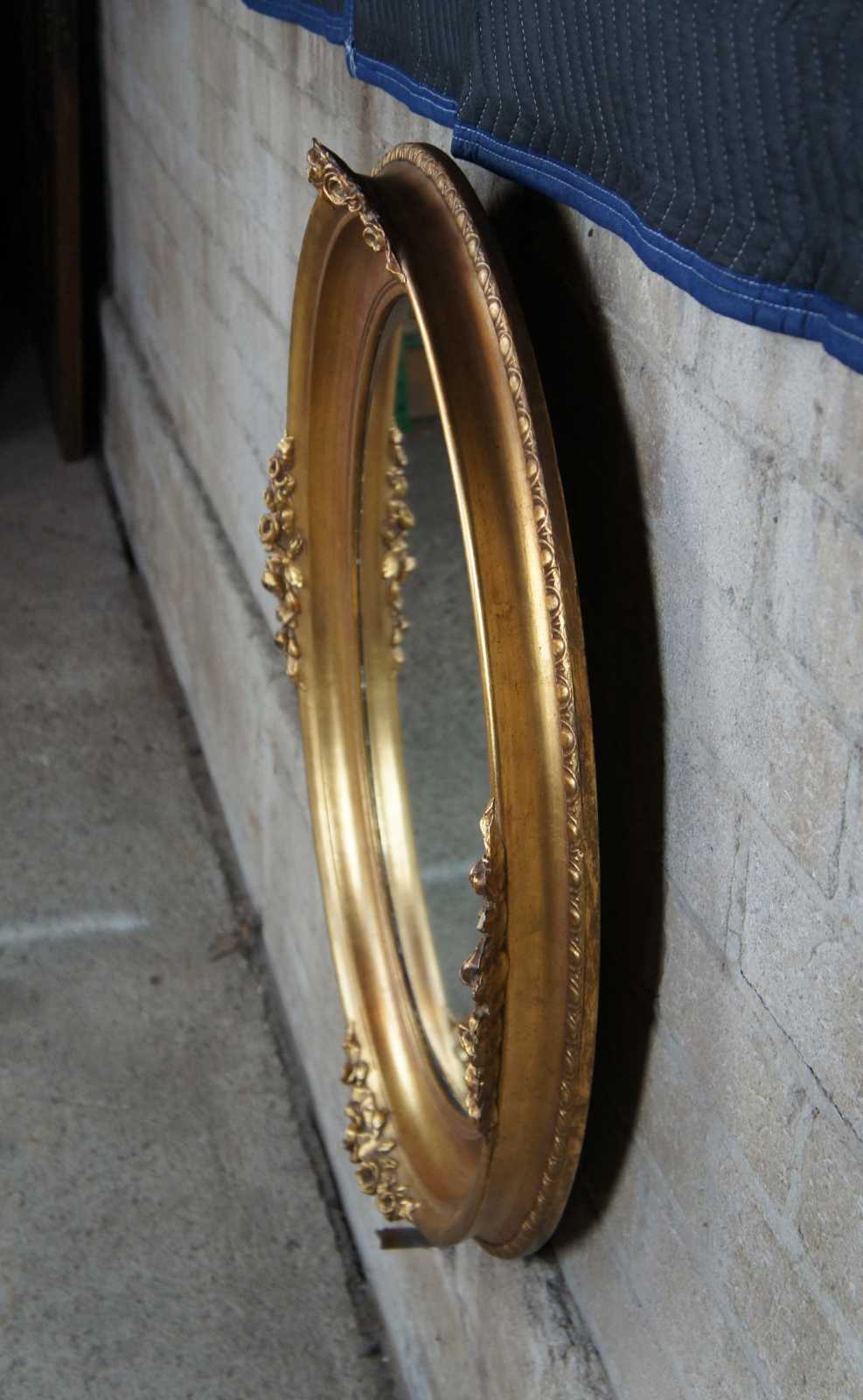A mid 20th century Victorian inspired mirror. The oval frame features gadrooning trim along the back edge and floral roses and ribbons accents carved along the front edge in gesso.