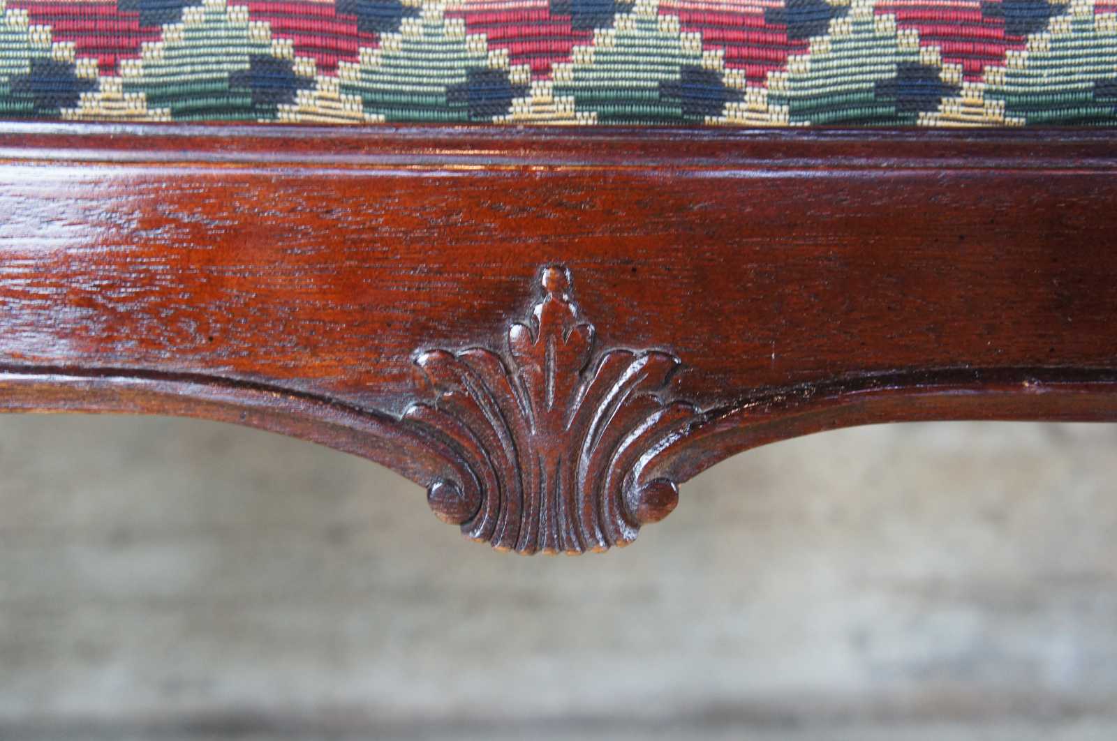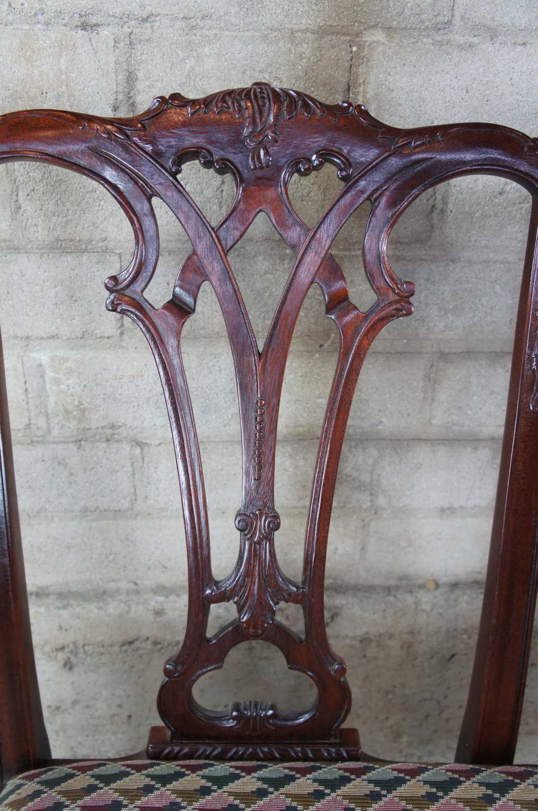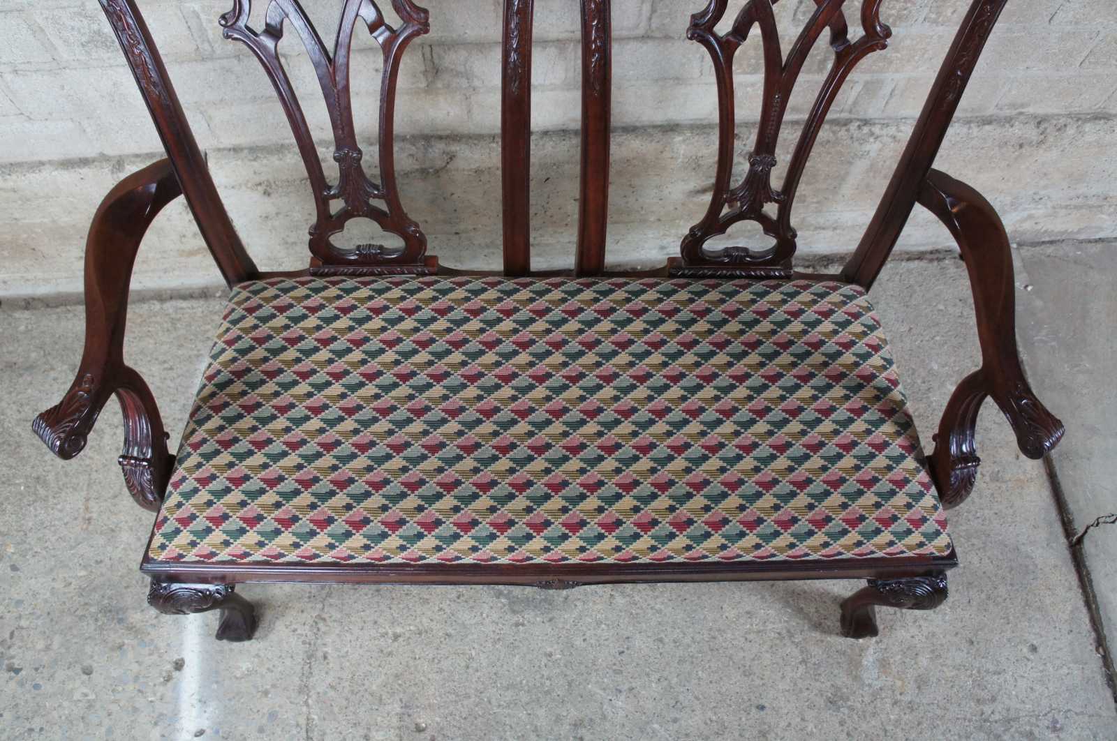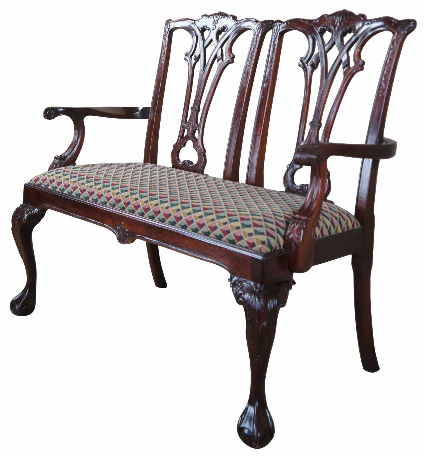 Late 20th century contemporary reproduction of a Chippendale two seat bench seat. Meticulously crafted from mahogany with interlaced carved backings, a blue red and gold diamond upholstered seat, cabriole legs leading to ball and claw feet.