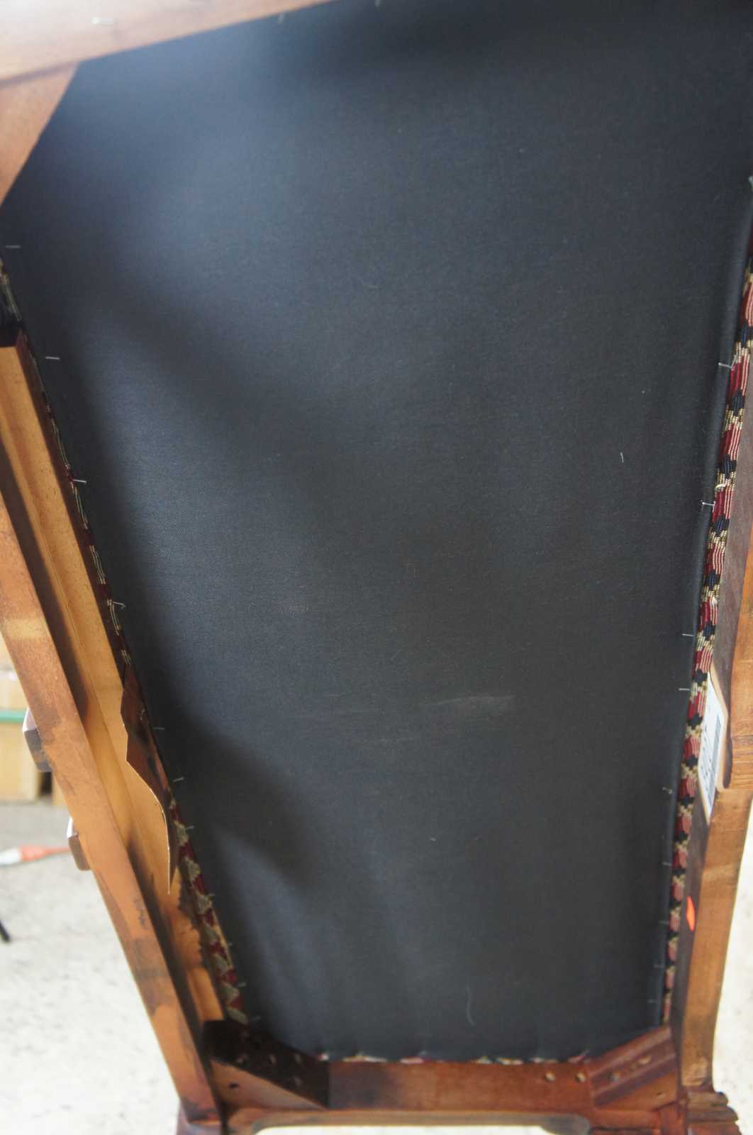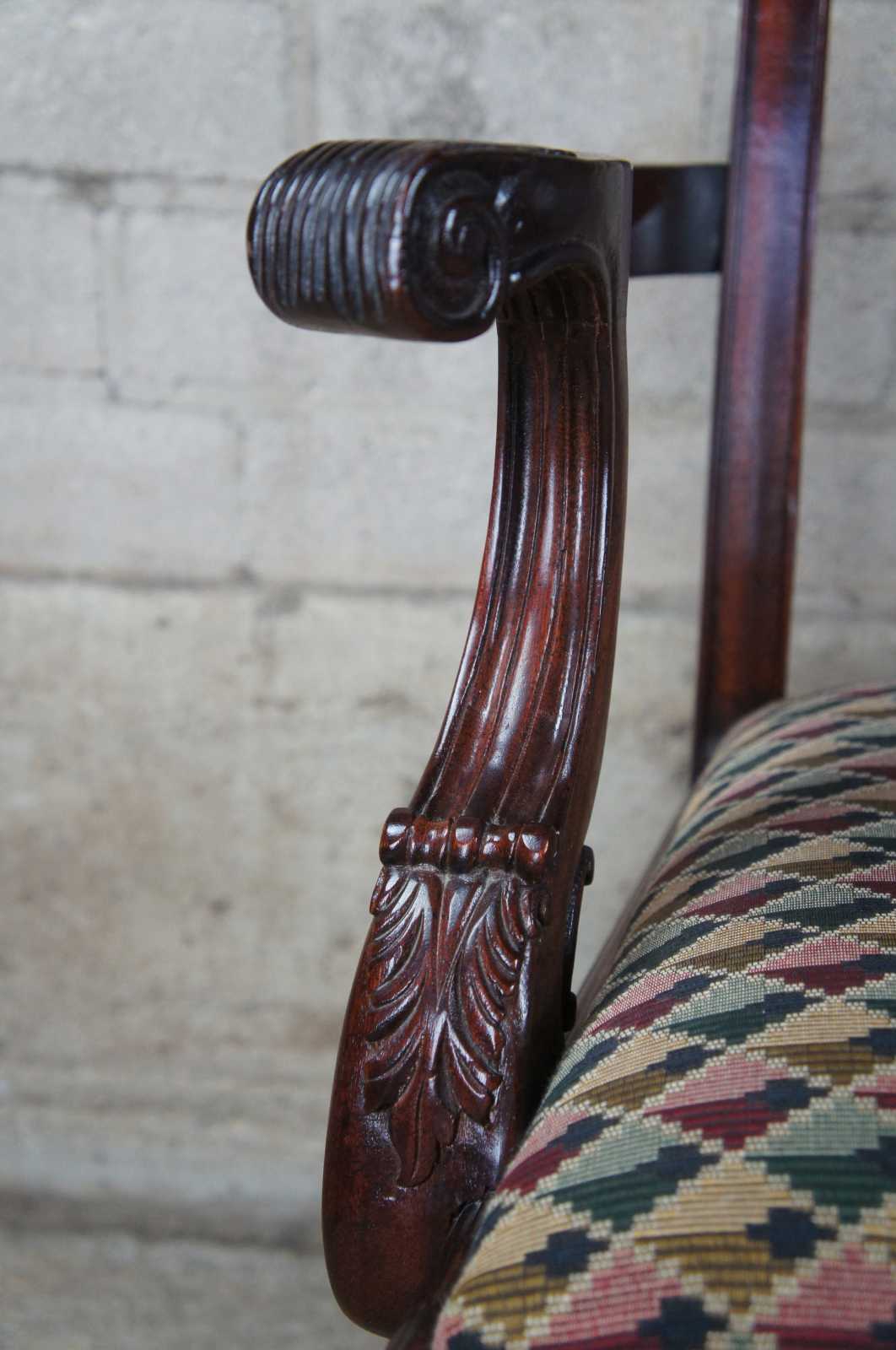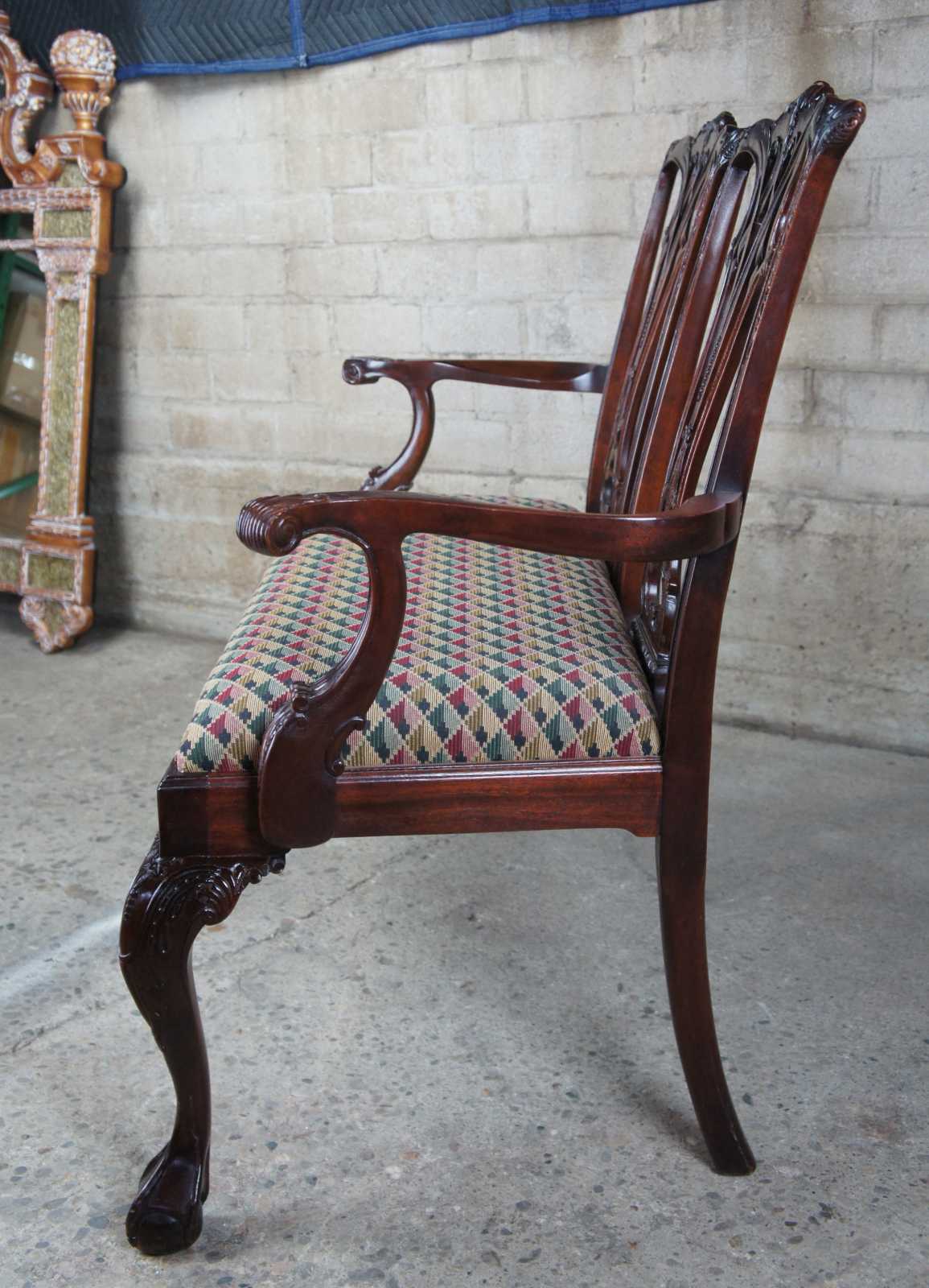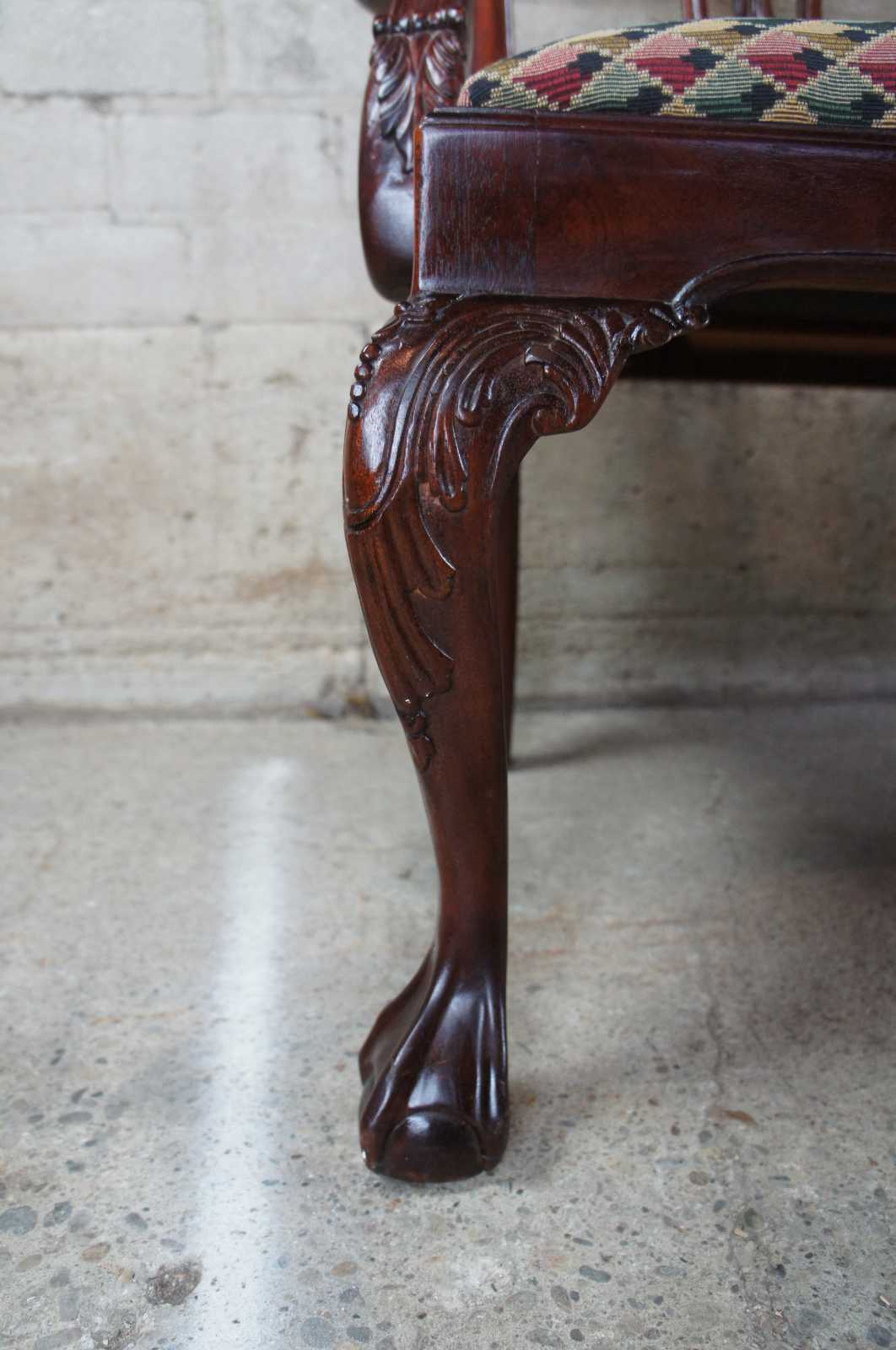Late 20th century contemporary reproduction of a Chippendale two seat bench seat. Meticulously crafted from mahogany with interlaced carved backings, a blue red and gold diamond upholstered seat, cabriole legs leading to ball and claw feet.
