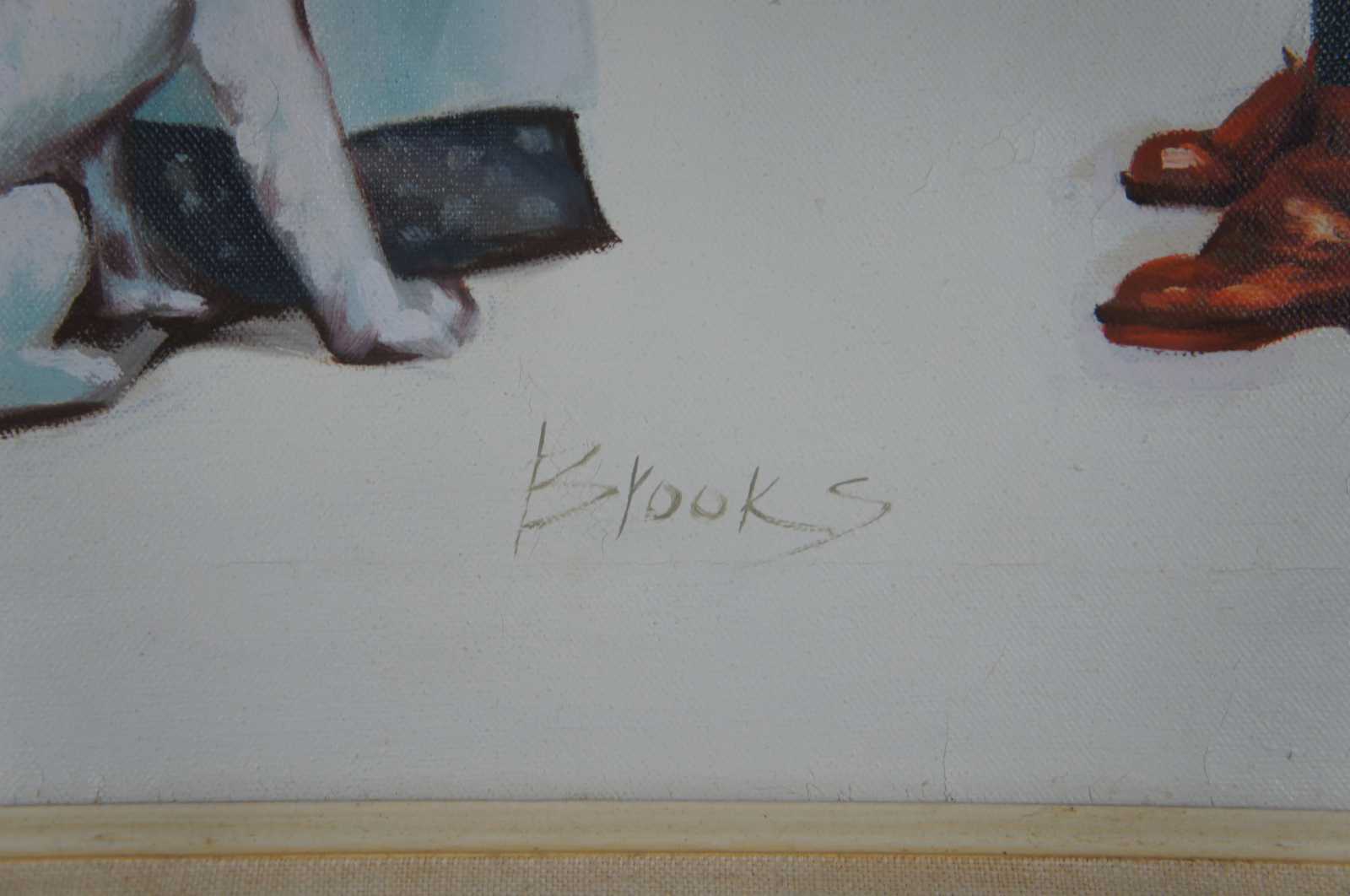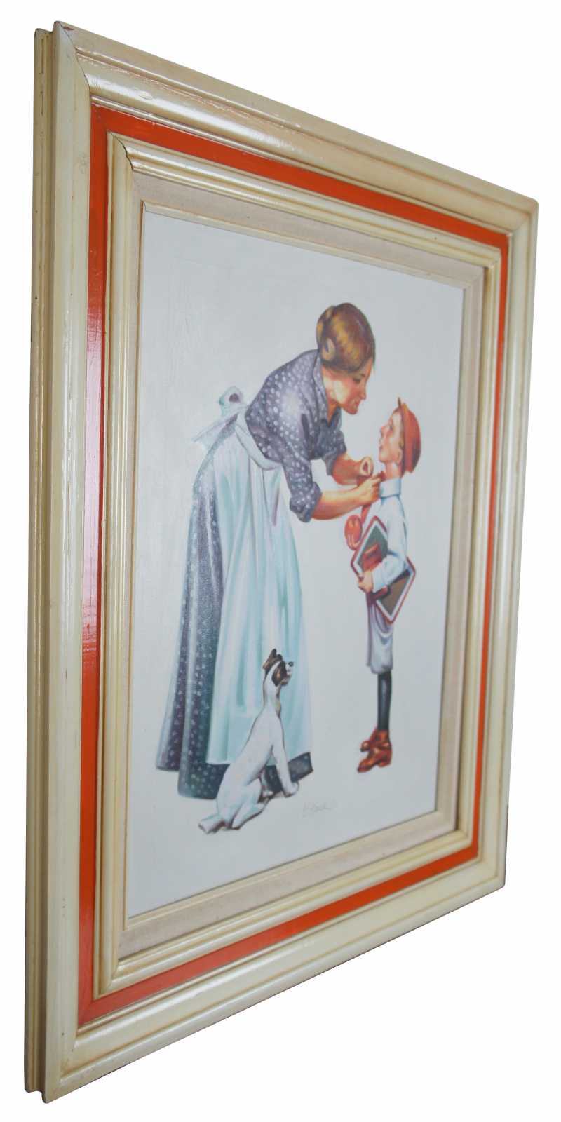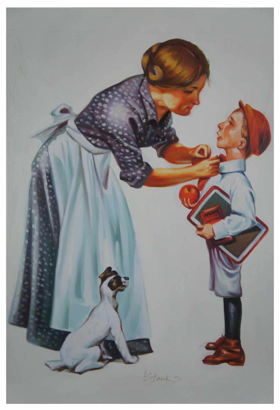 Vintage oil on canvas painting somewhat reminiscent of Norman Rockwell’s work, featuring a woman in a purple dress tying her sons tie as he prepares to go to school, watched by a small white dog. Painting signed Brooks.