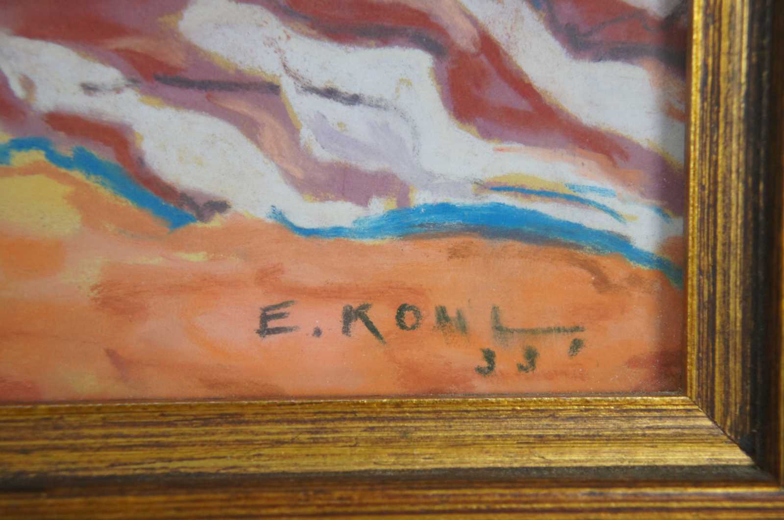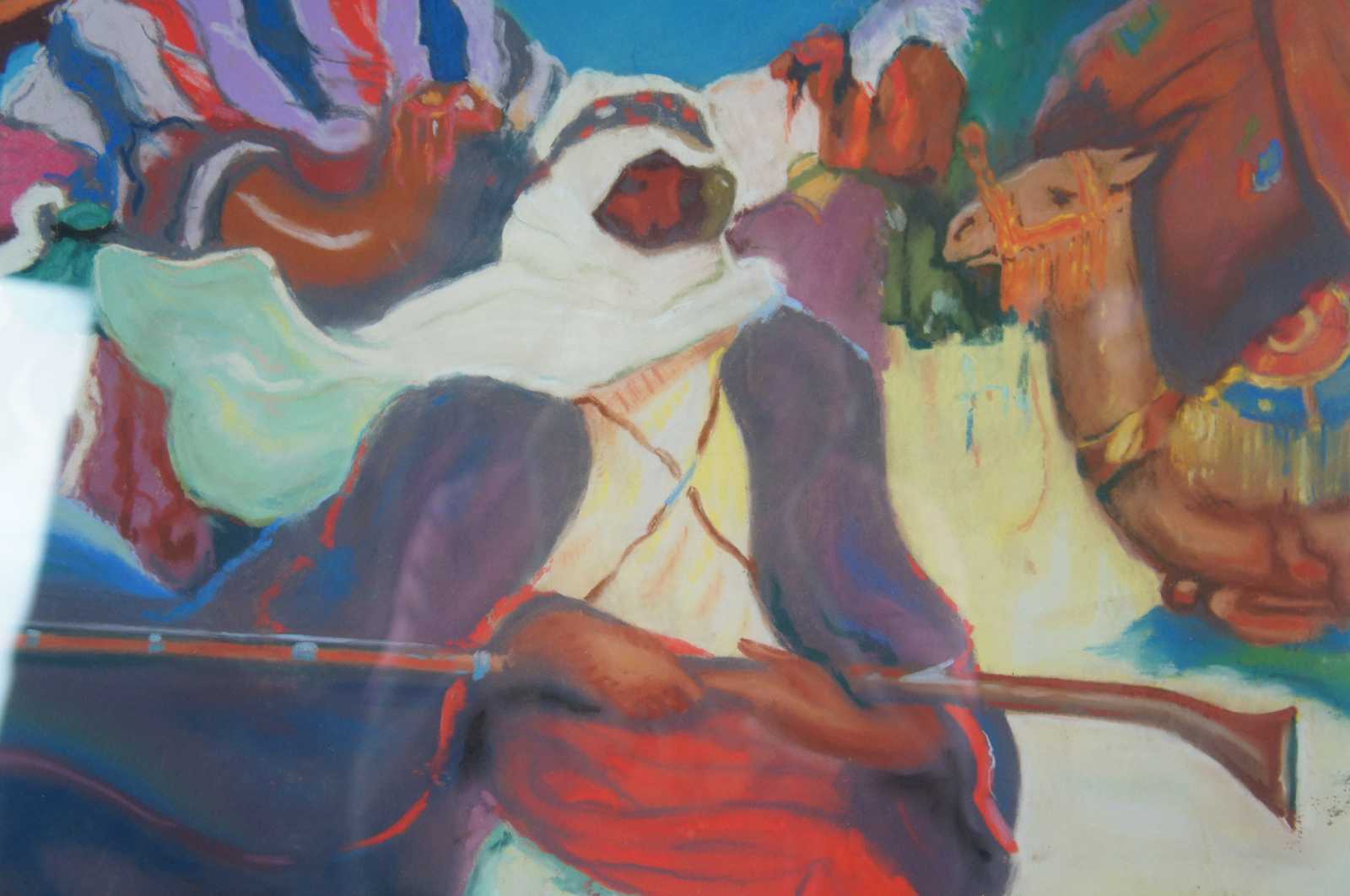 Antique 1933 orientalist watercolor painting featuring a pair of ornately dressed Bedouins encamped at an oasis with brightly colored tents and camels, signed E. Kohl.