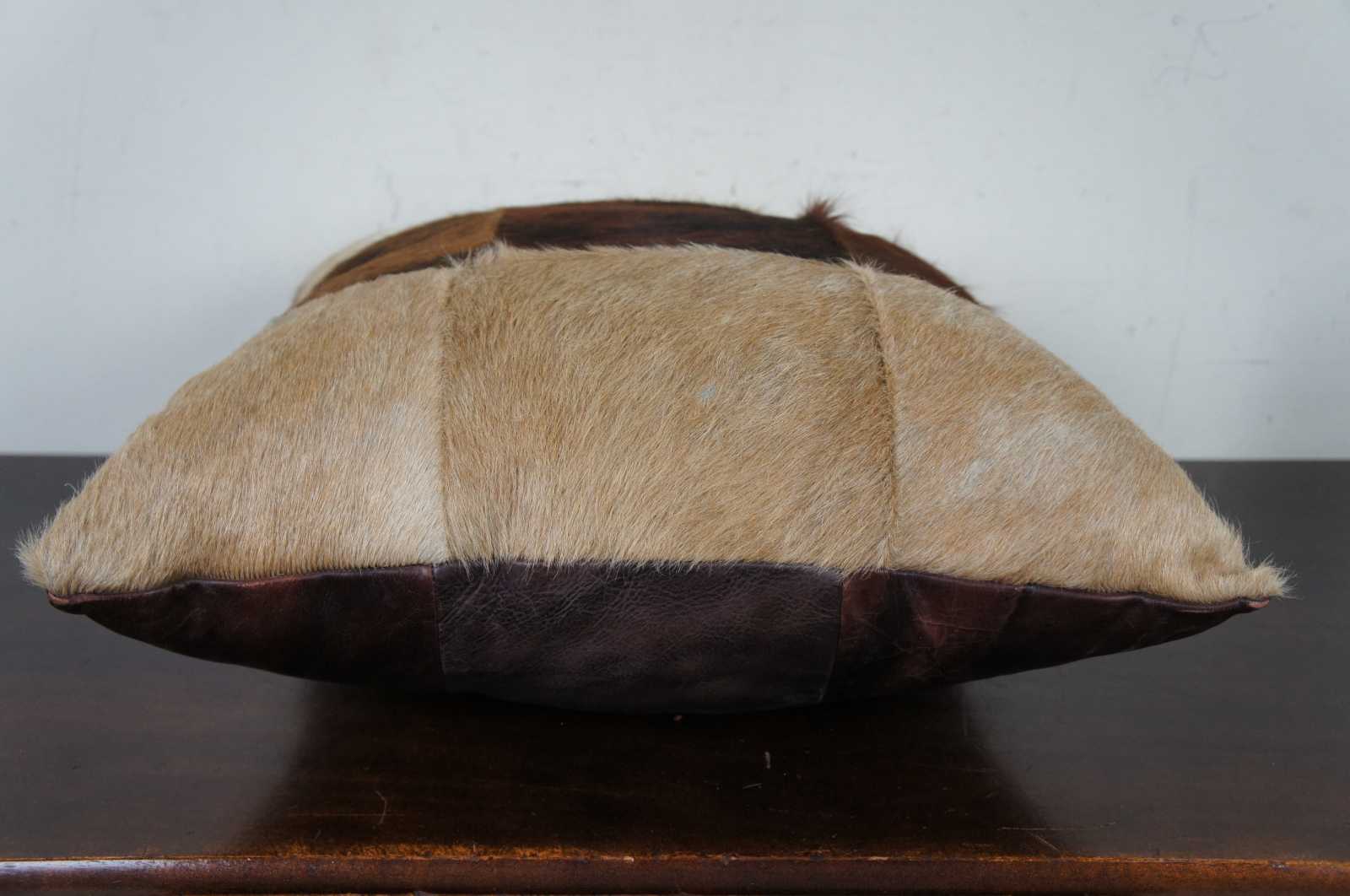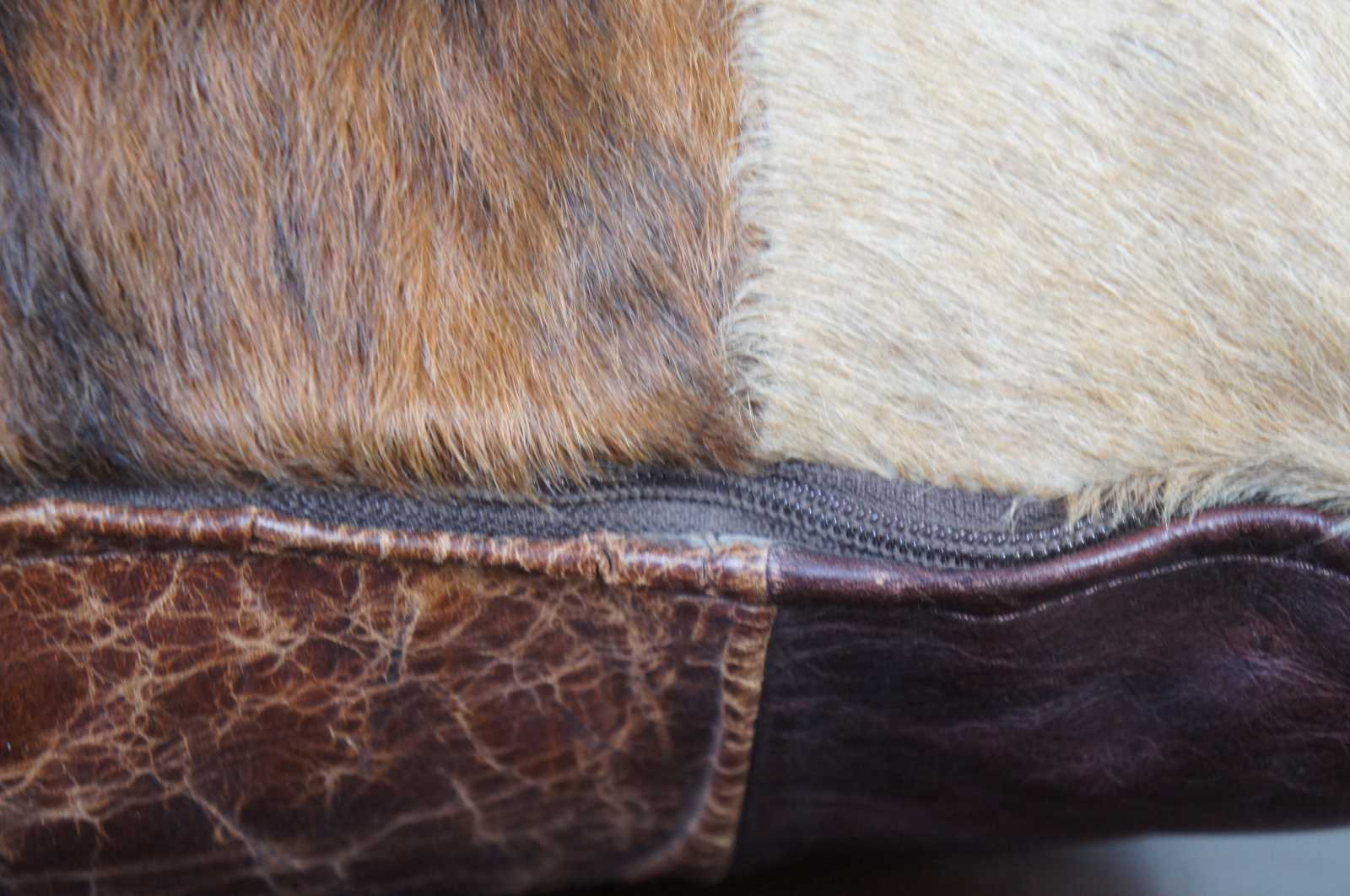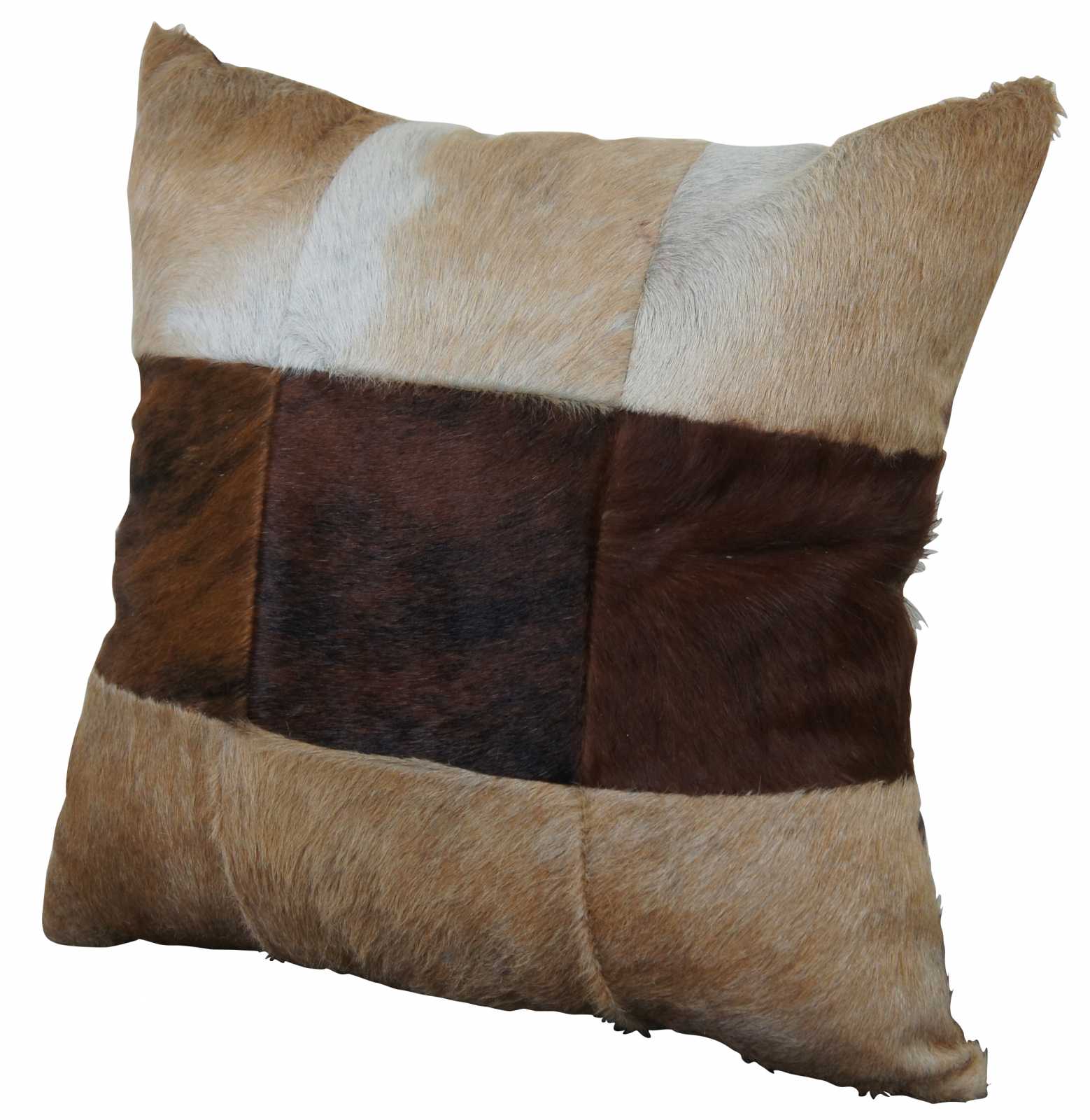 nine square multi-tone patchwork throw pillow in cow hide fur and leather, filled with small pieces of upholstery foam.