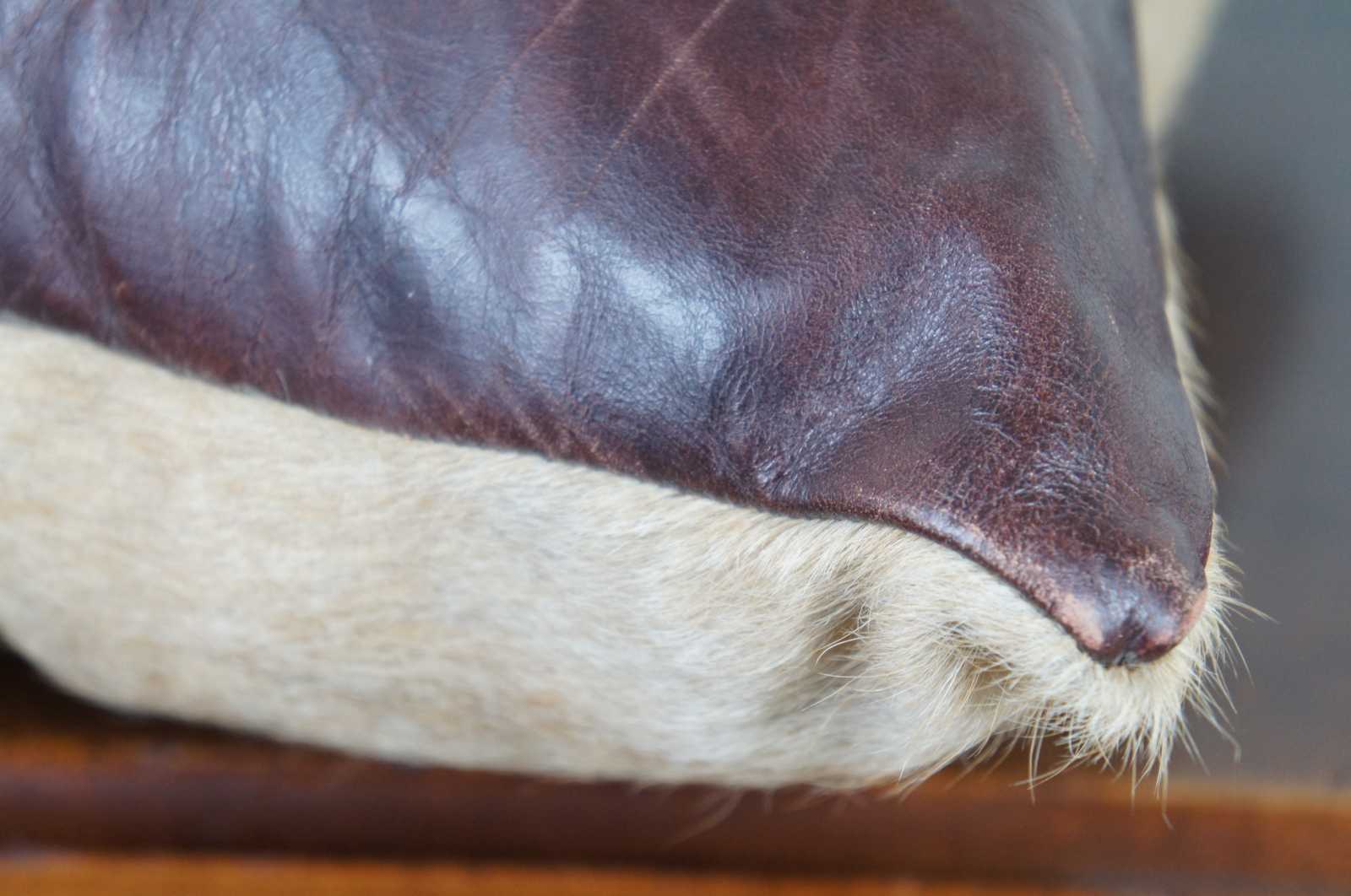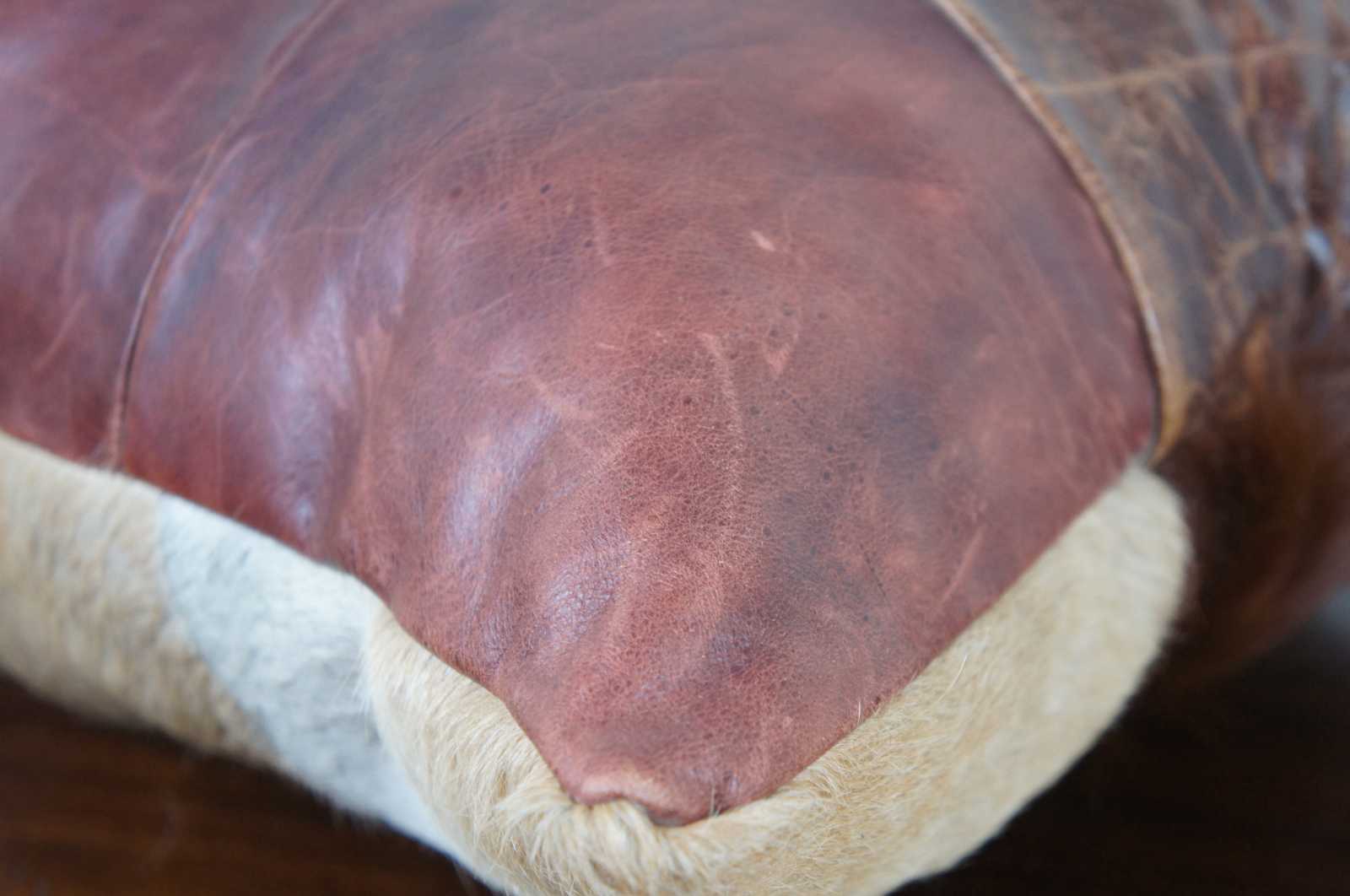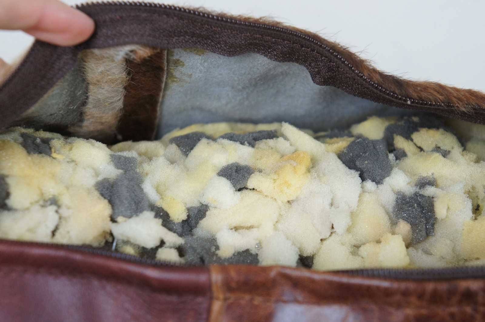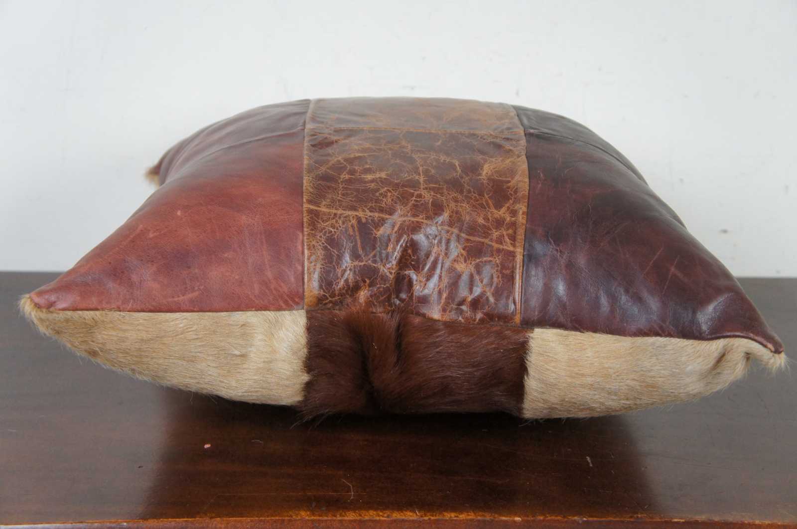 nine square multi-tone patchwork throw pillow in cow hide fur and leather, filled with small pieces of upholstery foam.