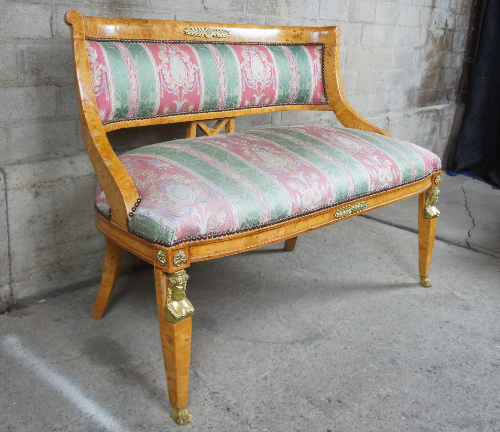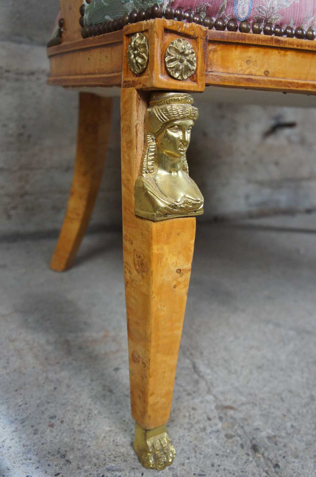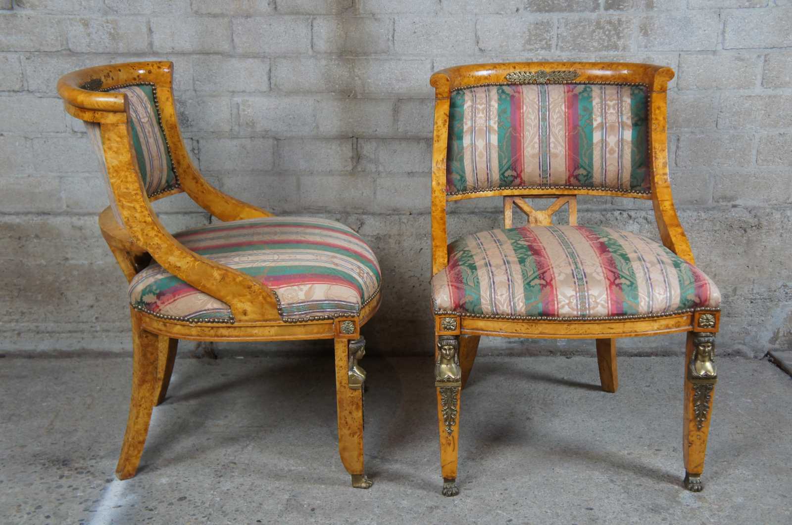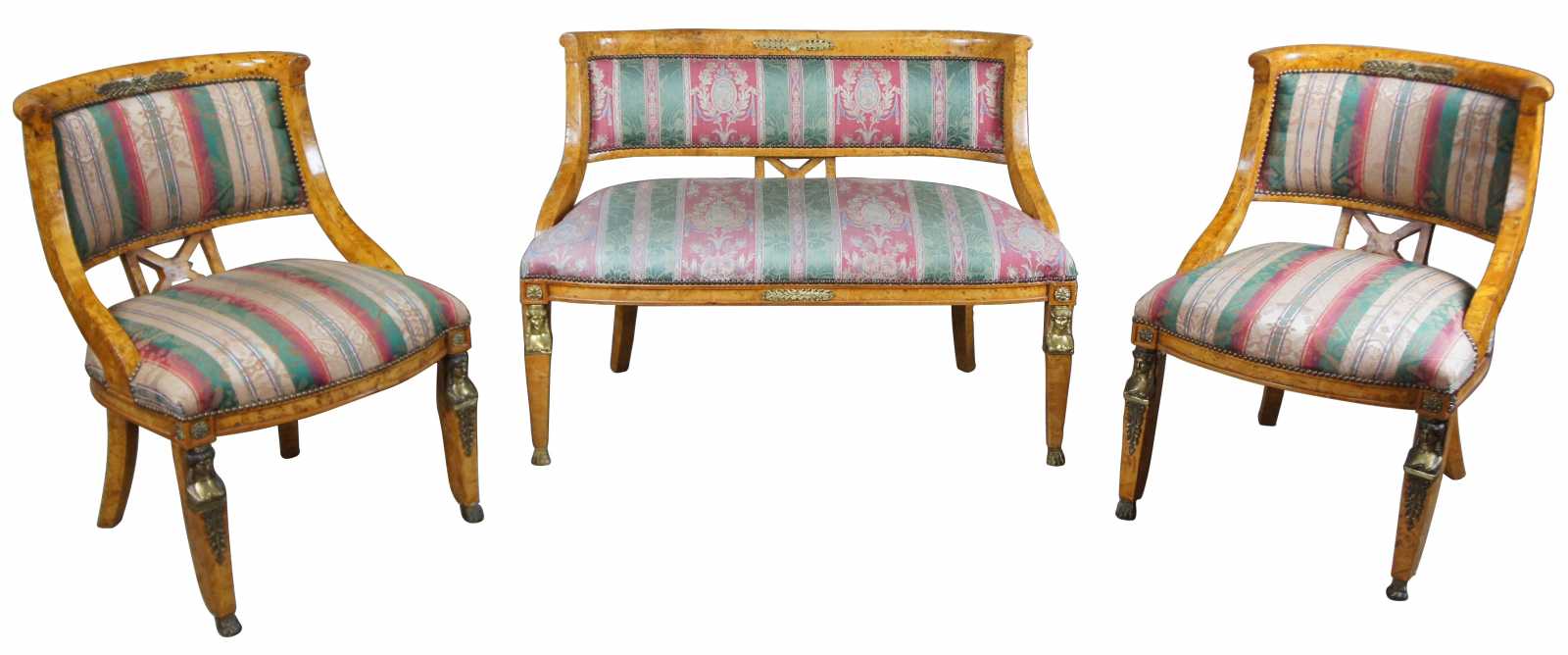 Monumental early 20th century parlor set. A neoclassical and egyptian revival inspired deisgn. Features a curved rail with unique X back between contoured arms leading to regal striped upholstery. The chairs are supported by square tapered front legs with cast bronze caryatid mounts leading to claw feet and rear flared sabre legs.