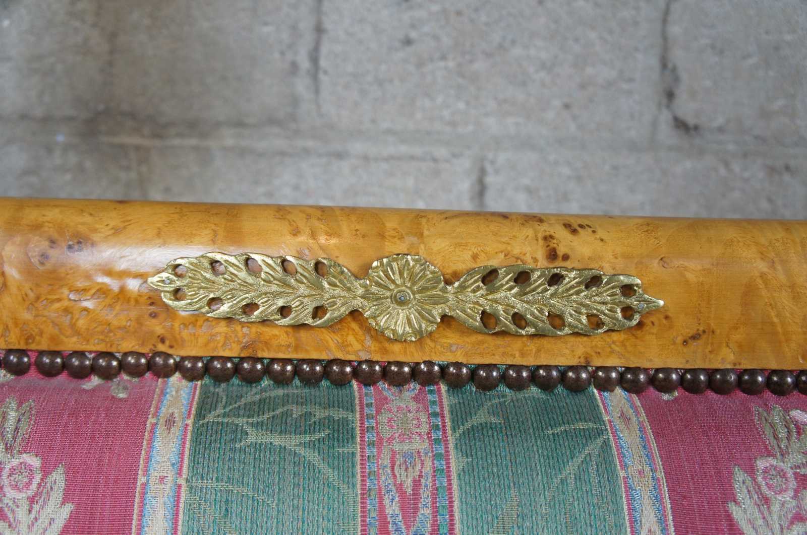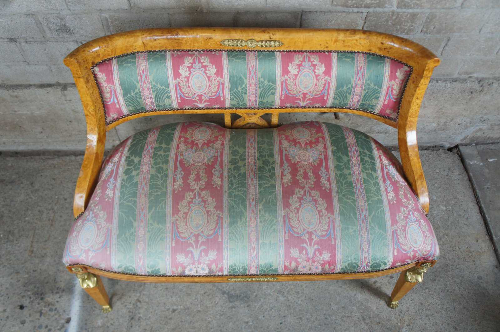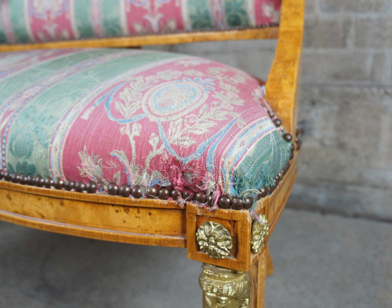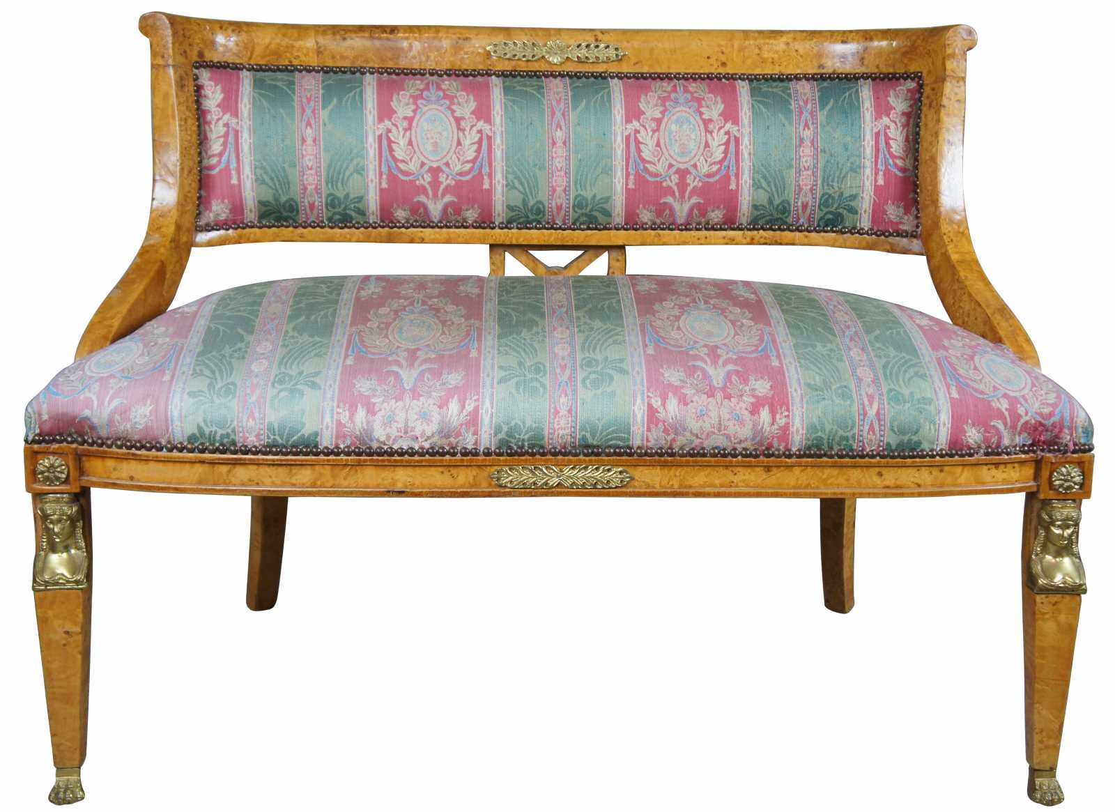 Monumental early 20th century parlor set. A neoclassical and egyptian revival inspired deisgn. Features a curved rail with unique X back between contoured arms leading to regal striped upholstery. The chairs are supported by square tapered front legs with cast bronze caryatid mounts leading to claw feet and rear flared sabre legs.