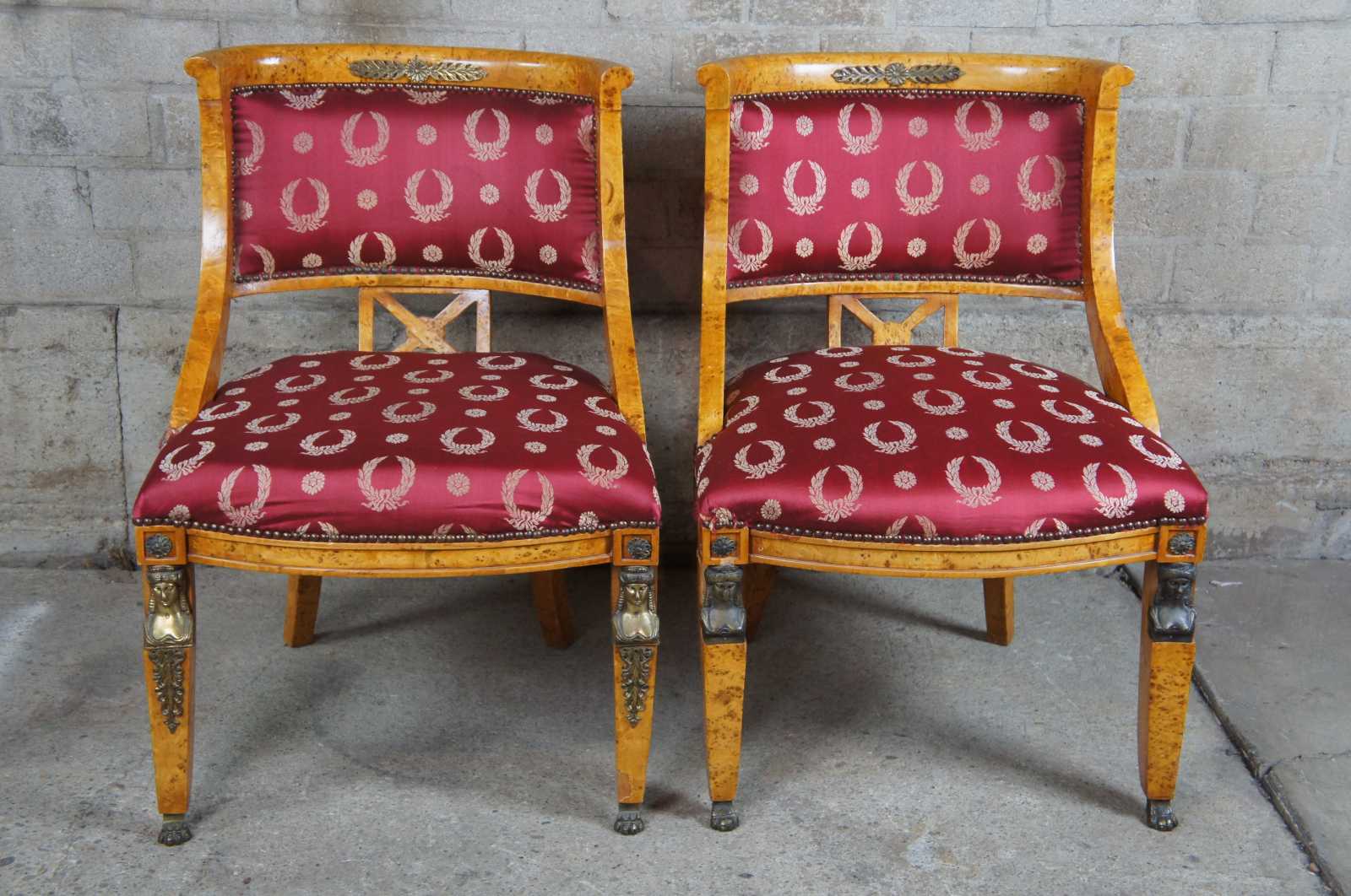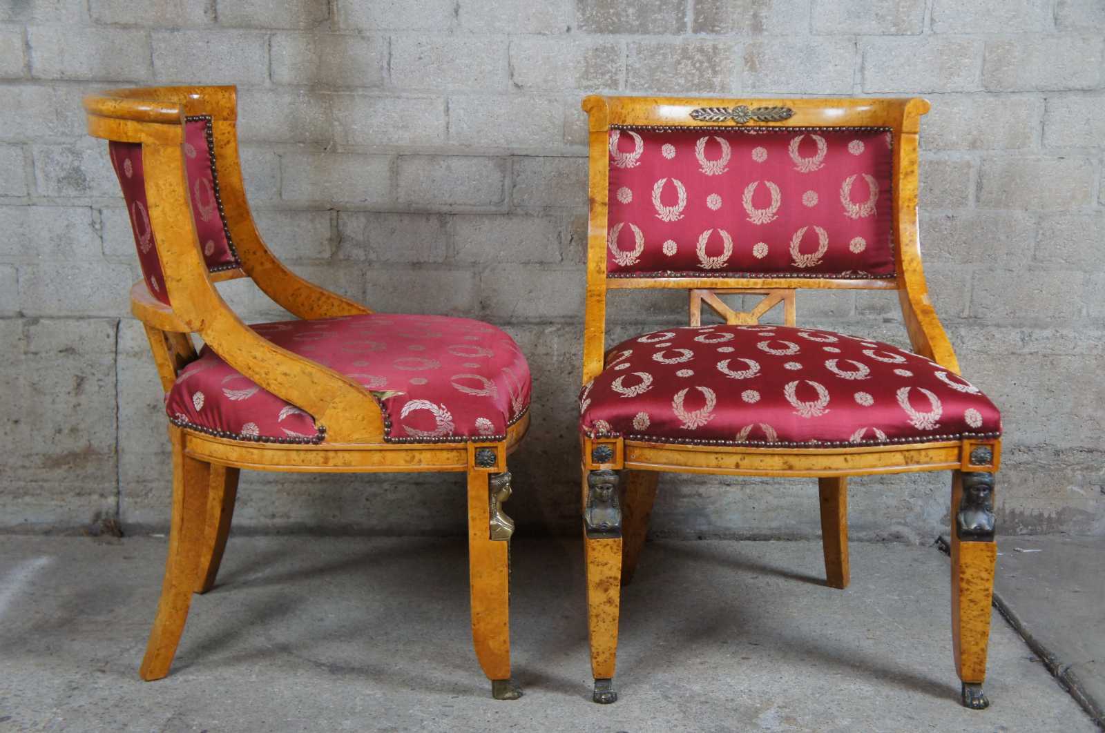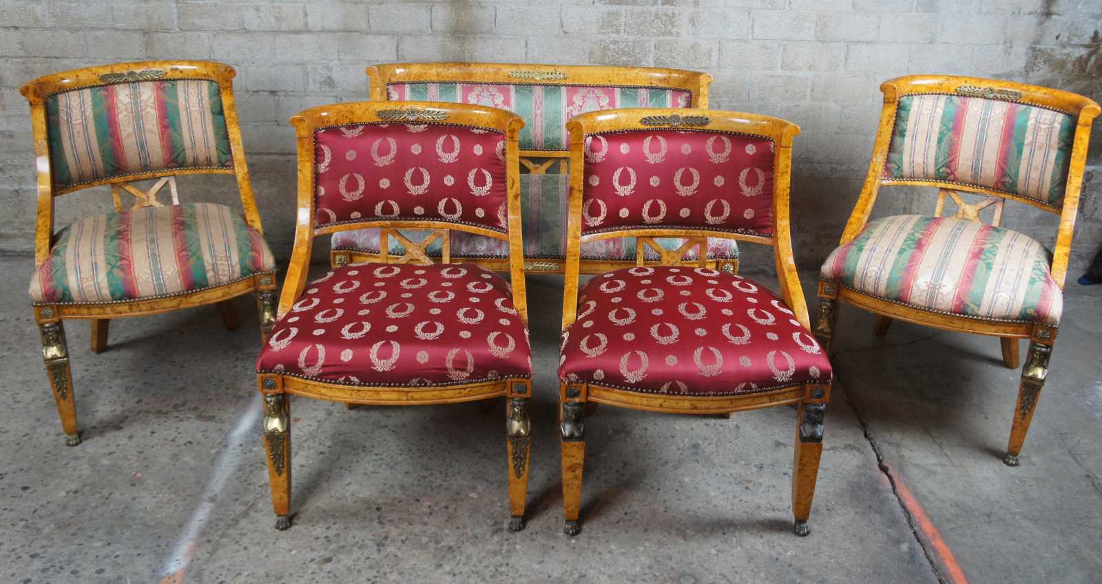 Monumental early 20th century 5 piece parlor set. A neoclassical and egyptian revival inspired deisgn. Features a curved rail with unique X back between contoured arms leading to regal upholstery. The chairs are supported by square tapered front legs with cast bronze caryatid mounts leading to claw feet and rear flared sabre legs.