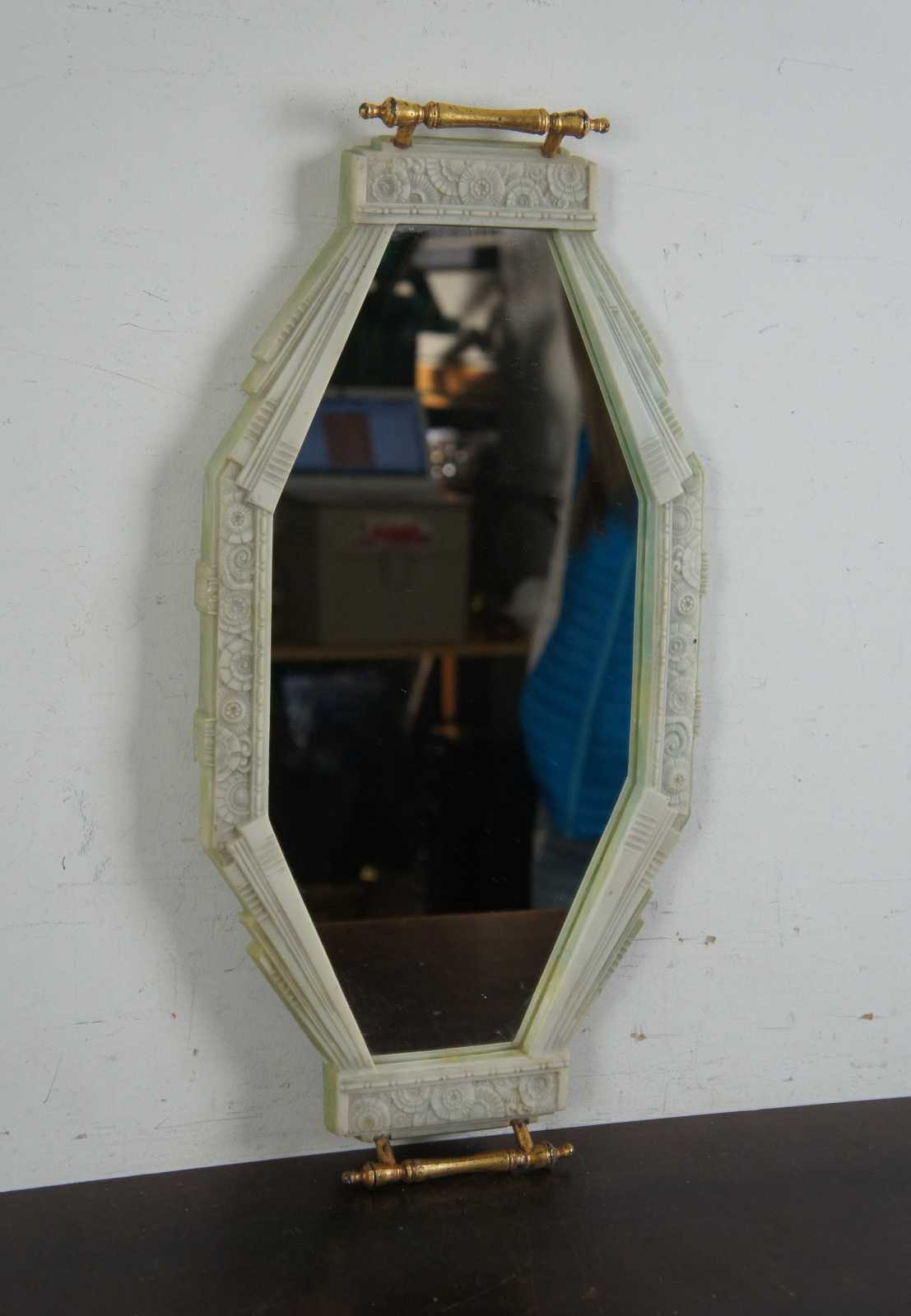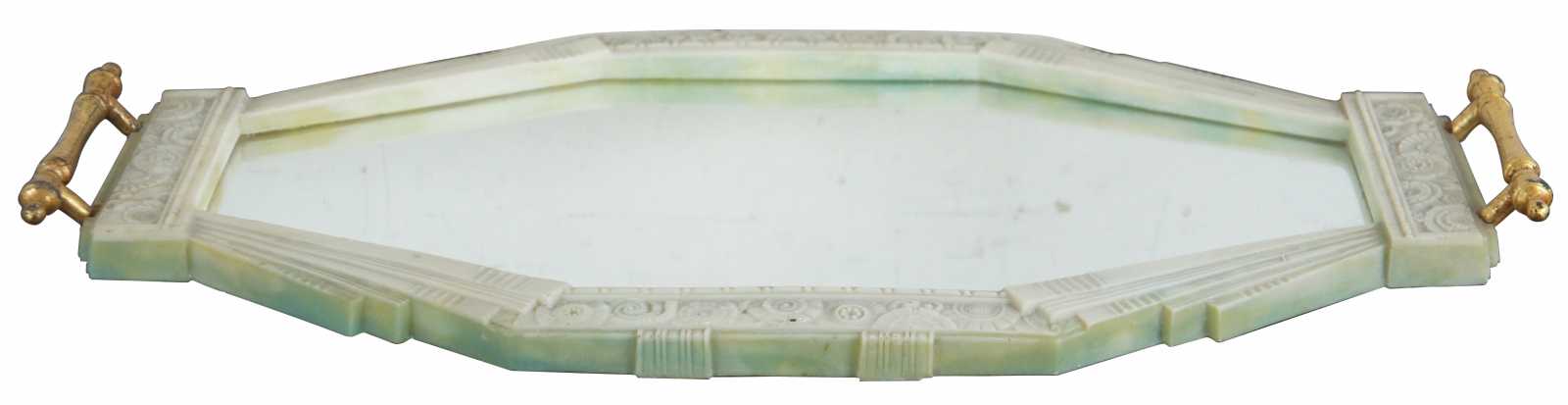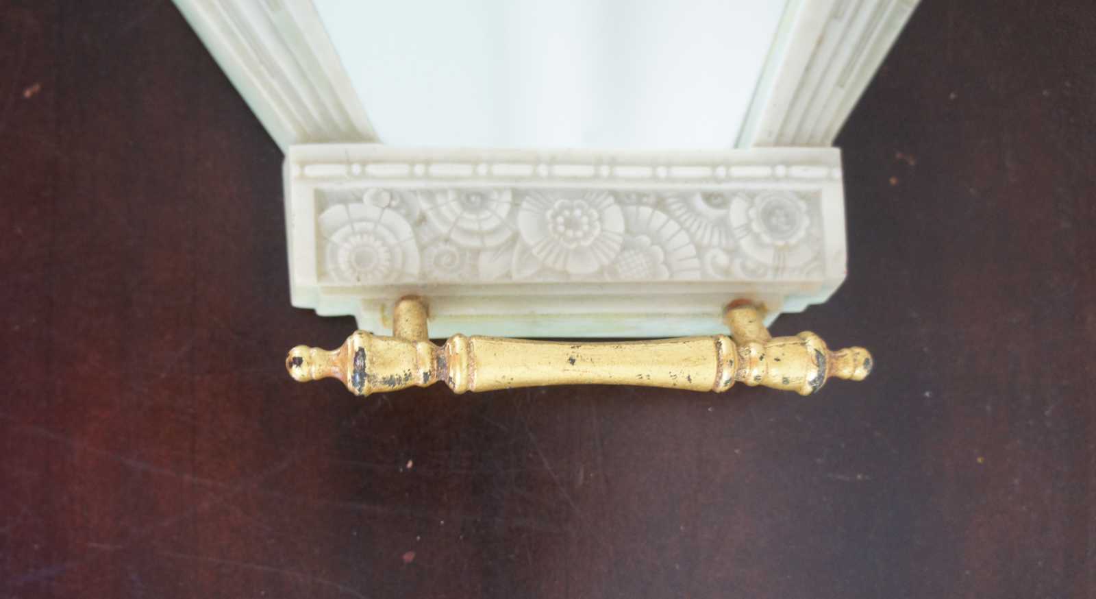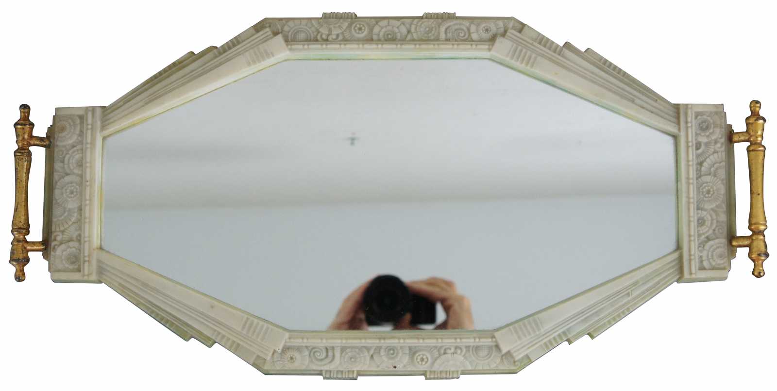Antique white bakelite mirrored vanity tray with gold tone handles and a floral art deco style frame. Tray has hanging spot along the back allowing it to be used as a wall mirror as well.