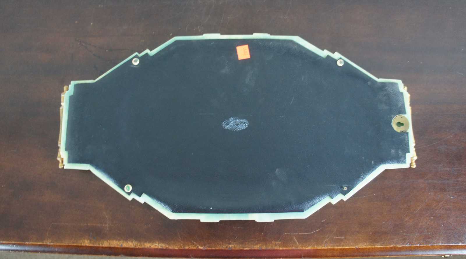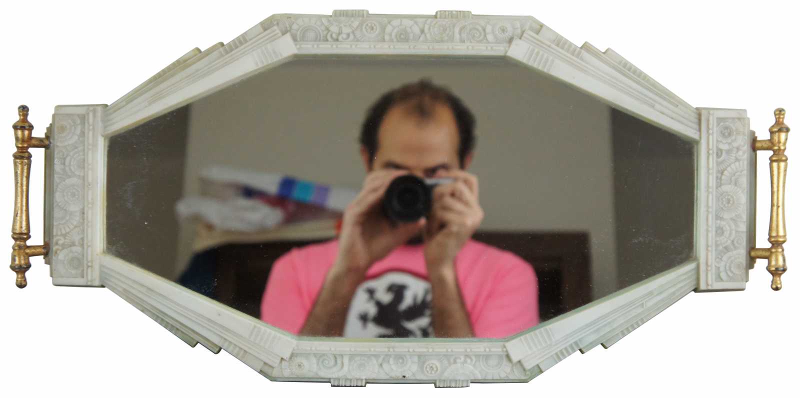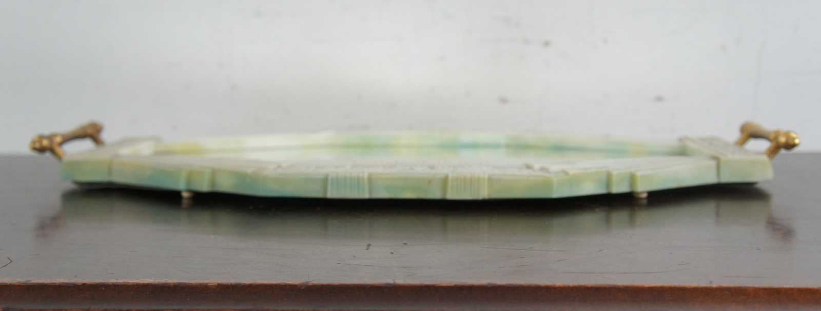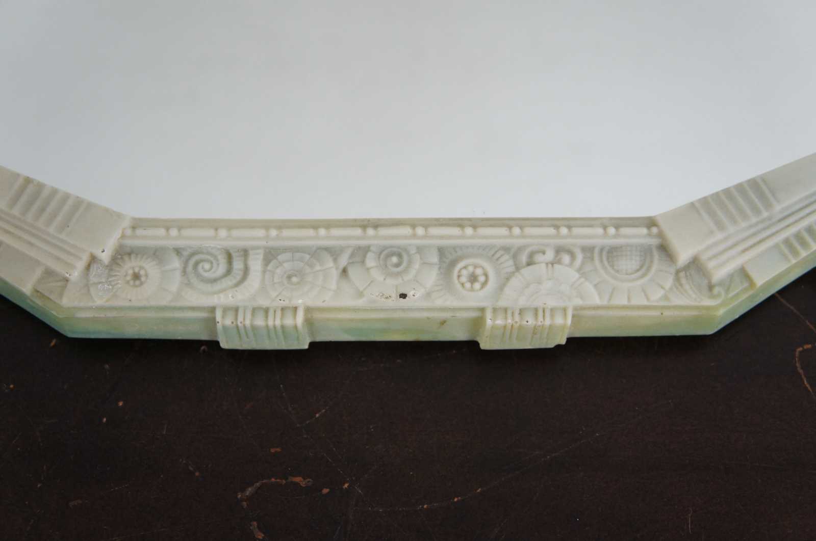 Antique white bakelite mirrored vanity tray with gold tone handles and a floral art deco style frame. Tray has hanging spot along the back allowing it to be used as a wall mirror as well.