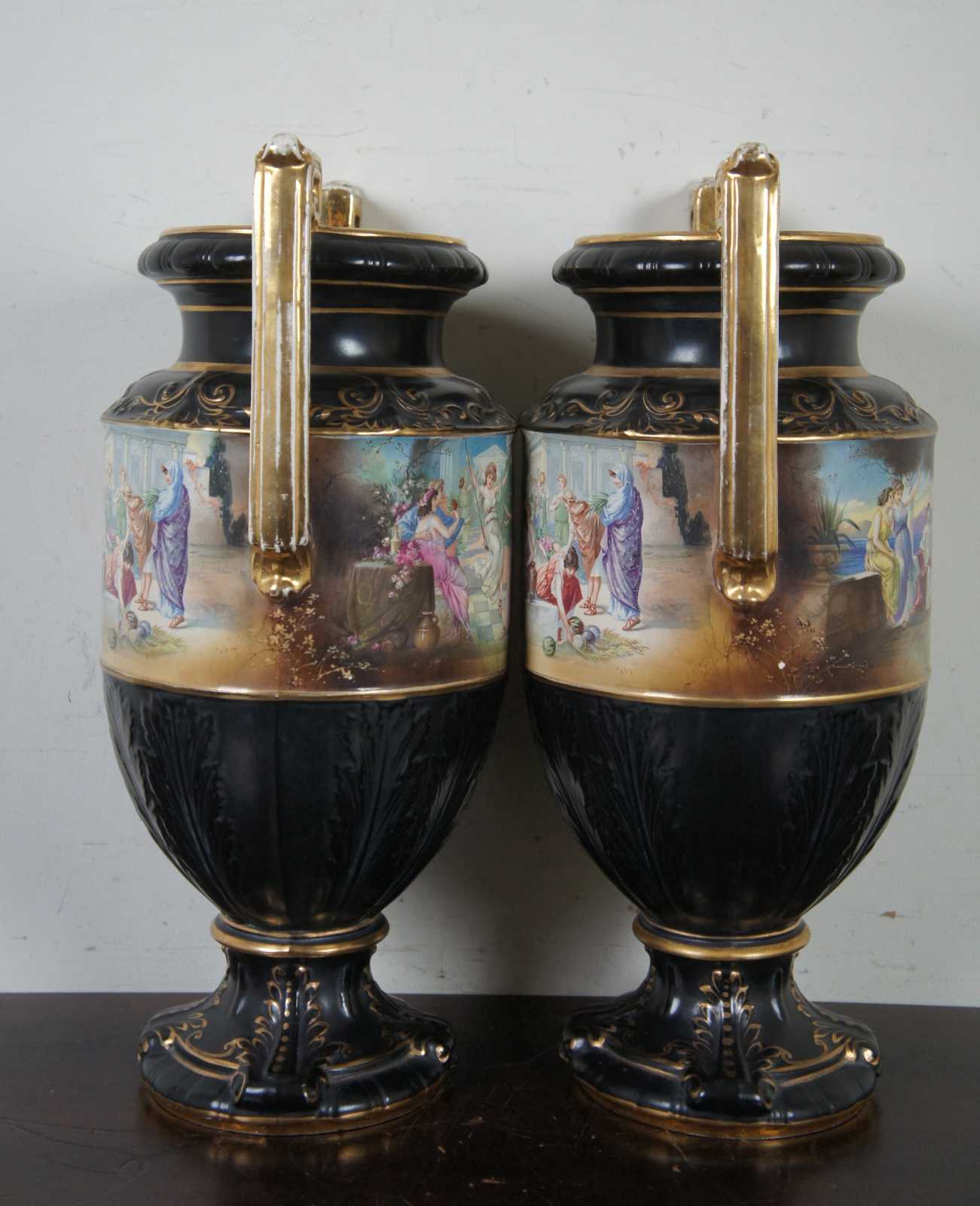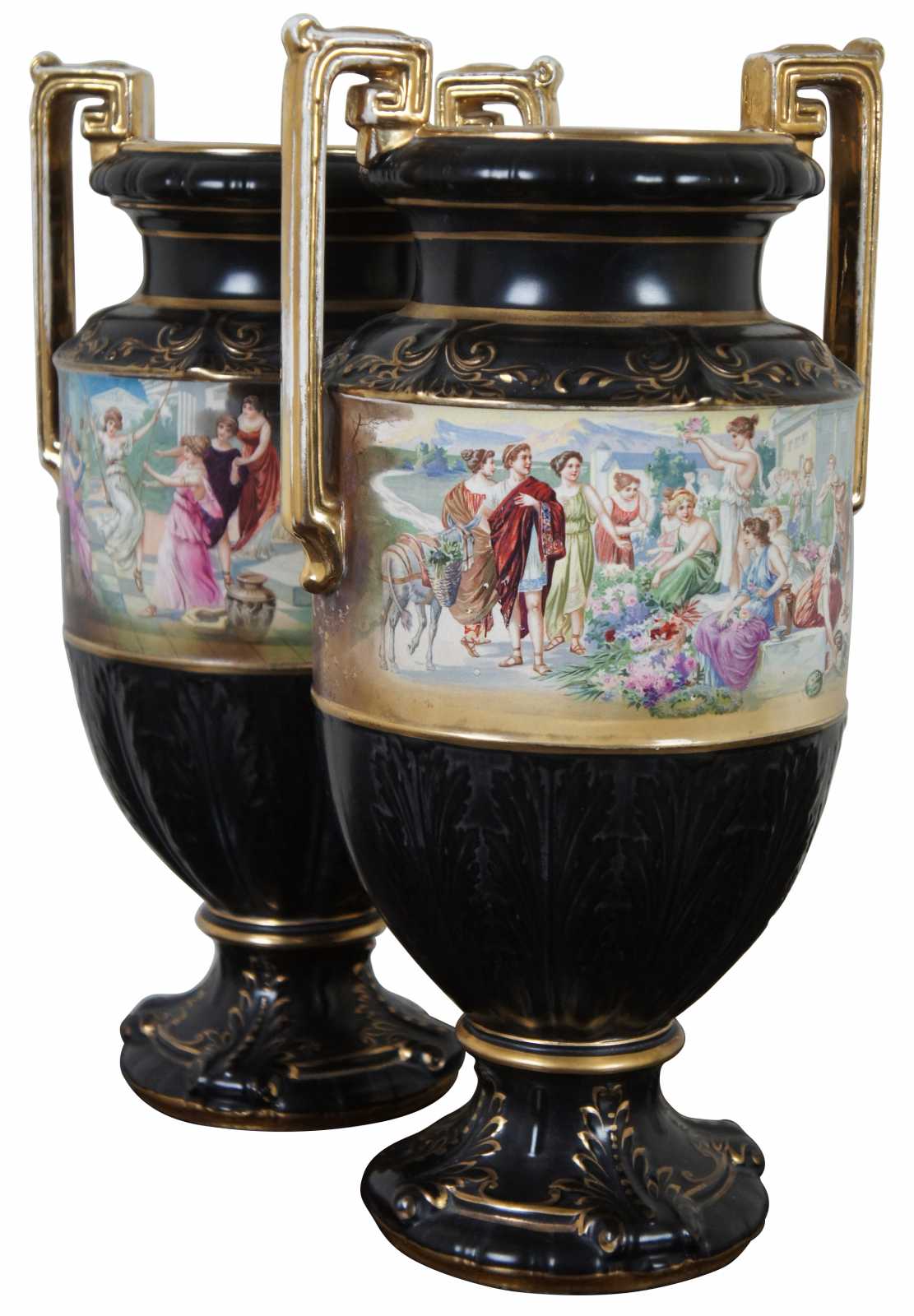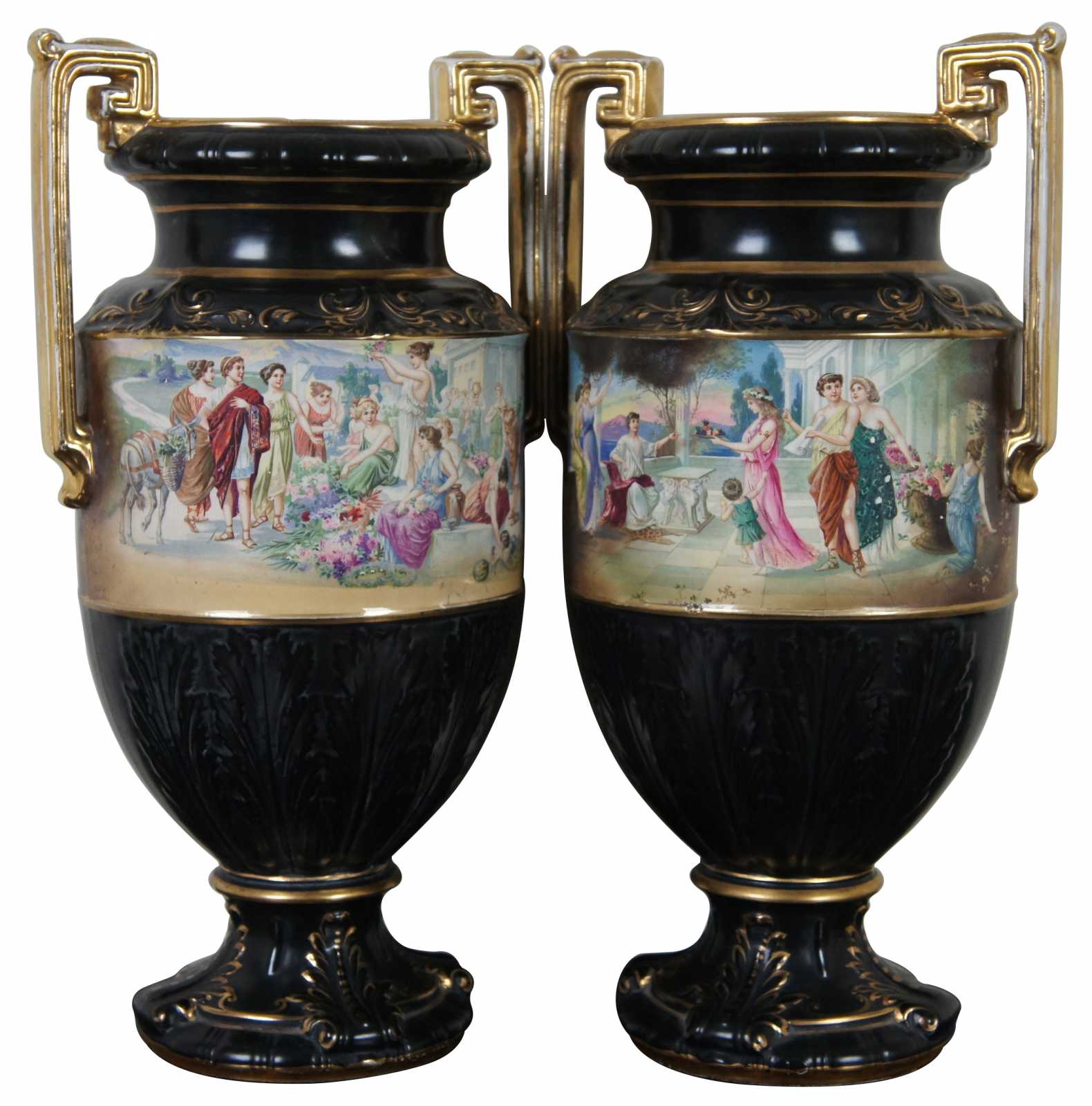Two black porcelain mantel vases in the shape of Grecian urns with Greek key handles, acanthus leaves, gold accents and idyllic scenes of figures, signed Lesoir. Made in England.