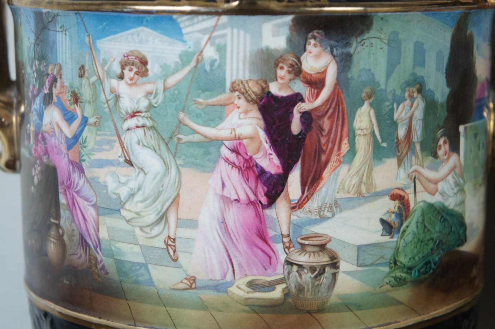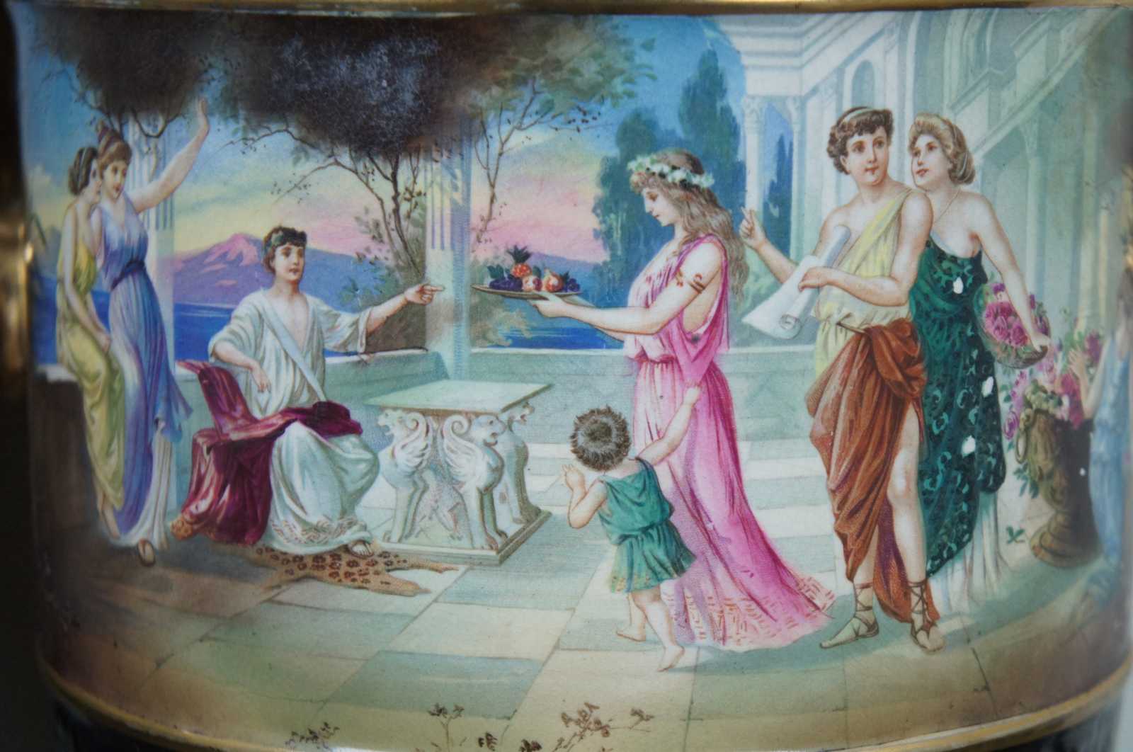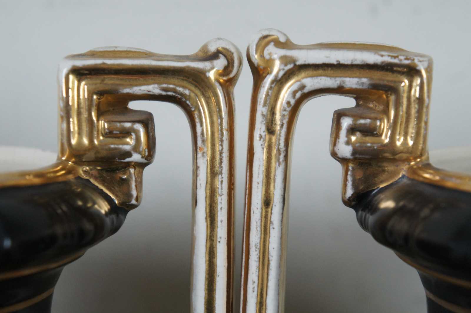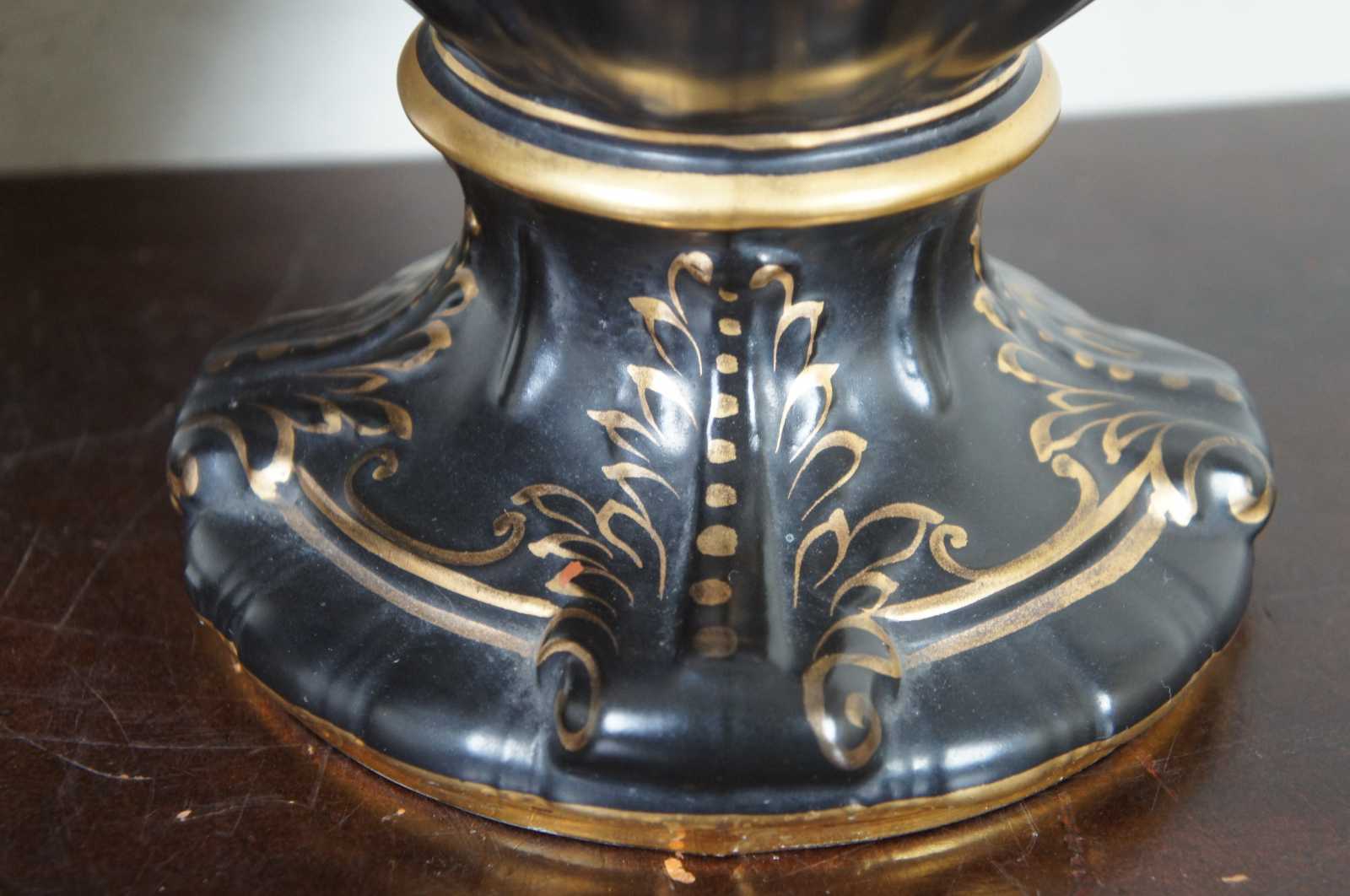 Two black porcelain mantel vases in the shape of Grecian urns with Greek key handles, acanthus leaves, gold accents and idyllic scenes of figures, signed Lesoir. Made in England.
