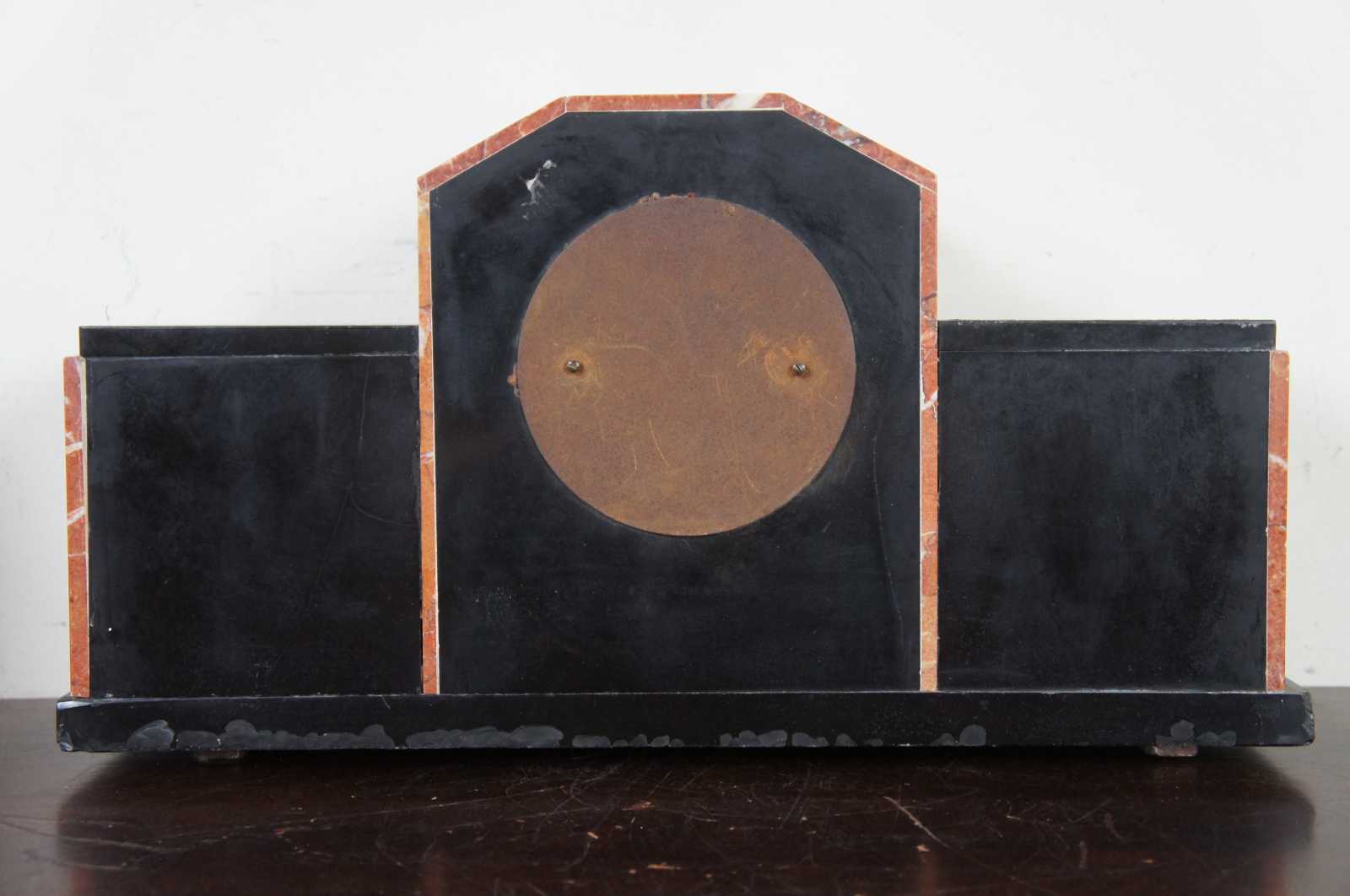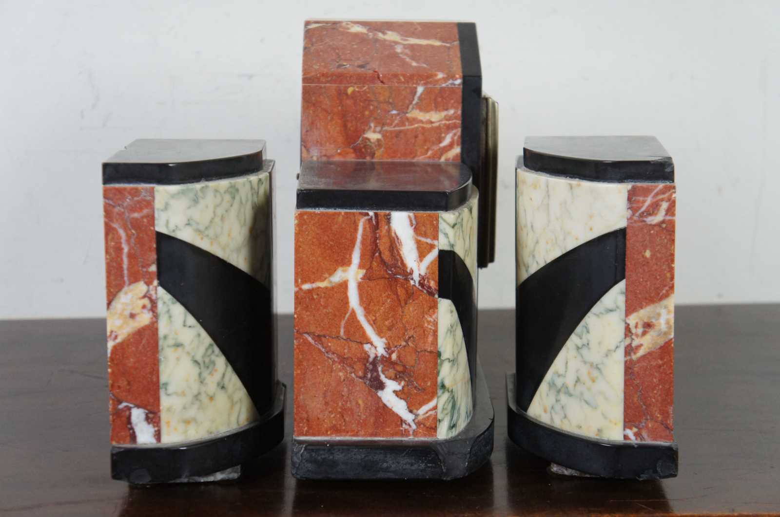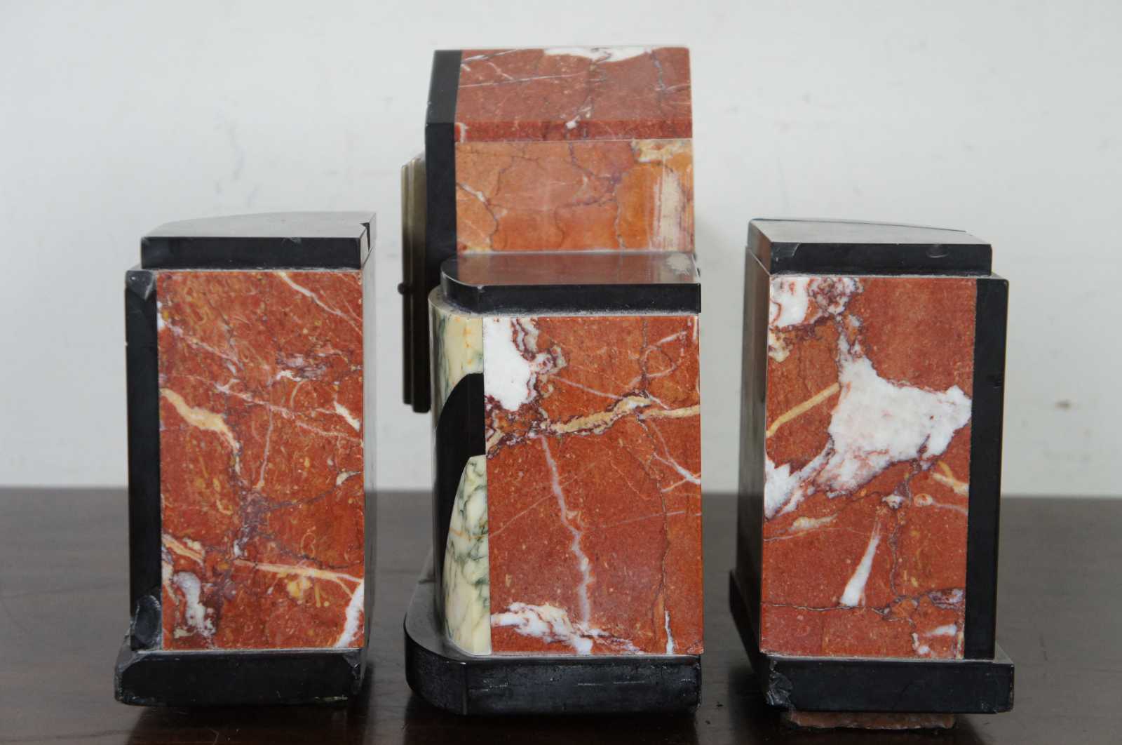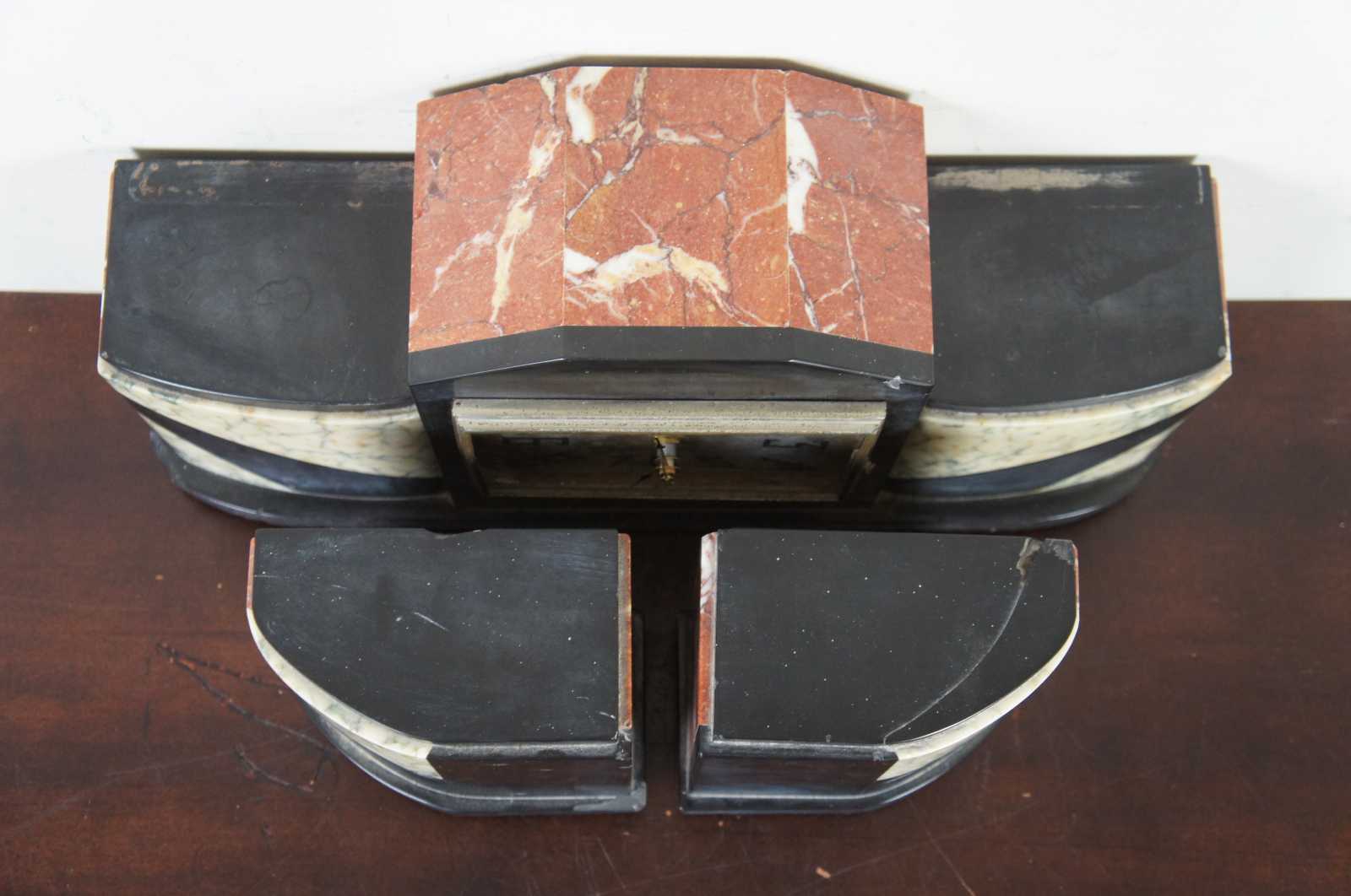 Three piece, black, white and salmon marble mantelpiece set, including an art deco clock and bookends.