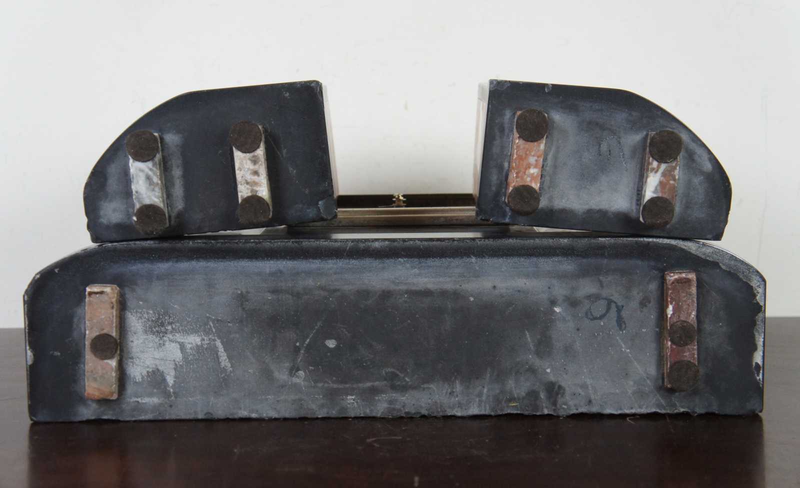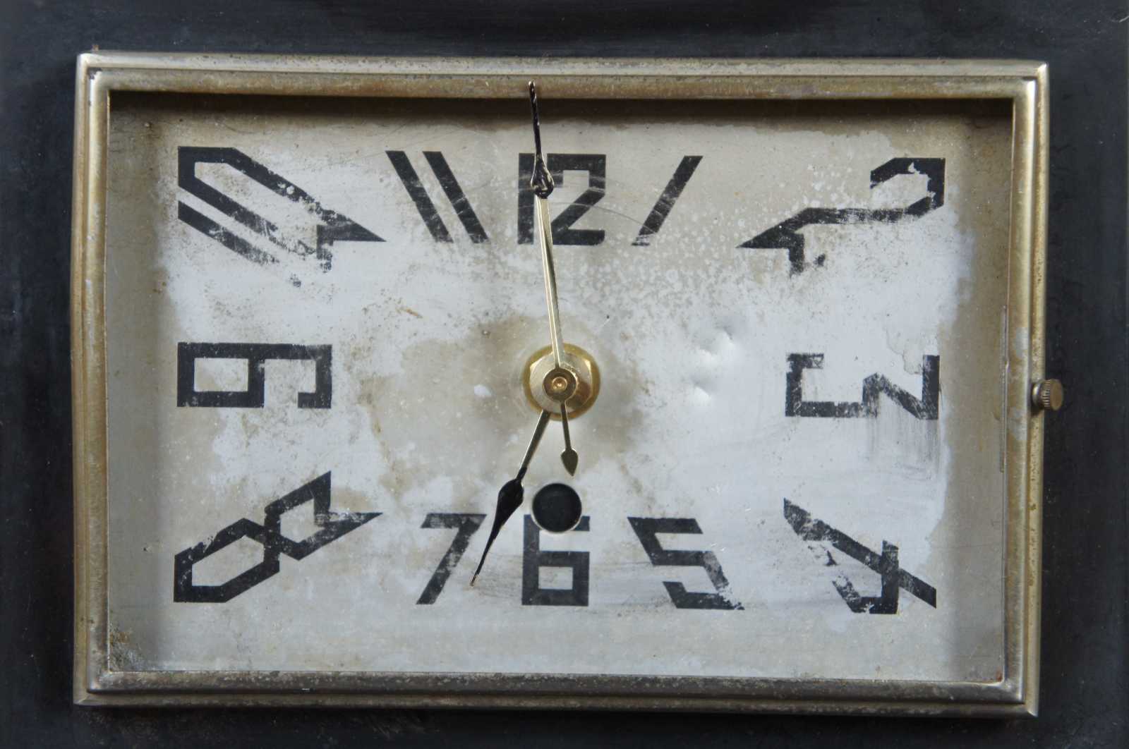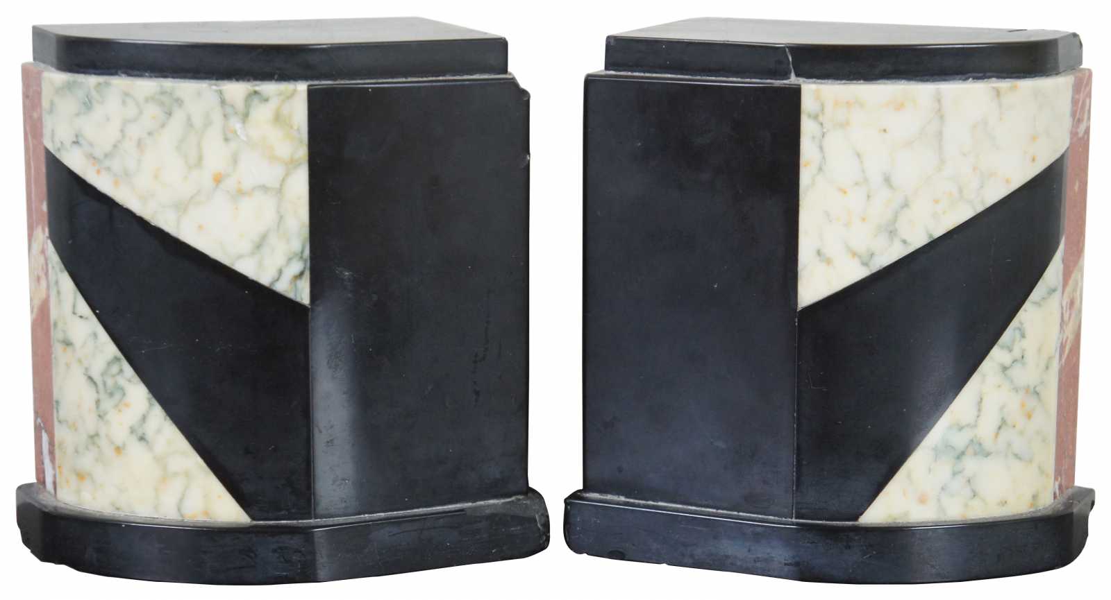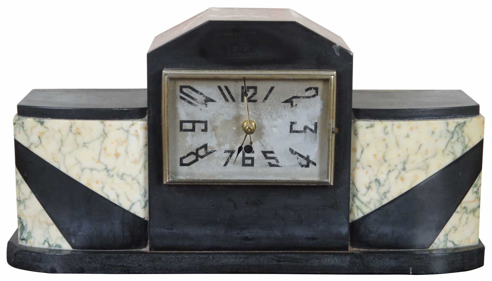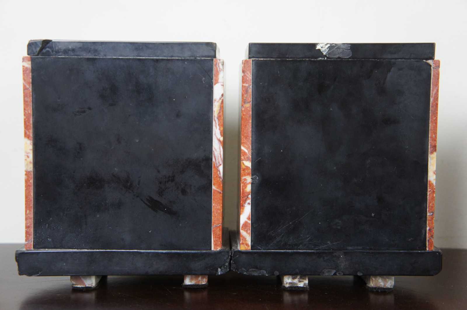Three piece, black, white and salmon marble mantelpiece set, including an art deco clock and bookends.