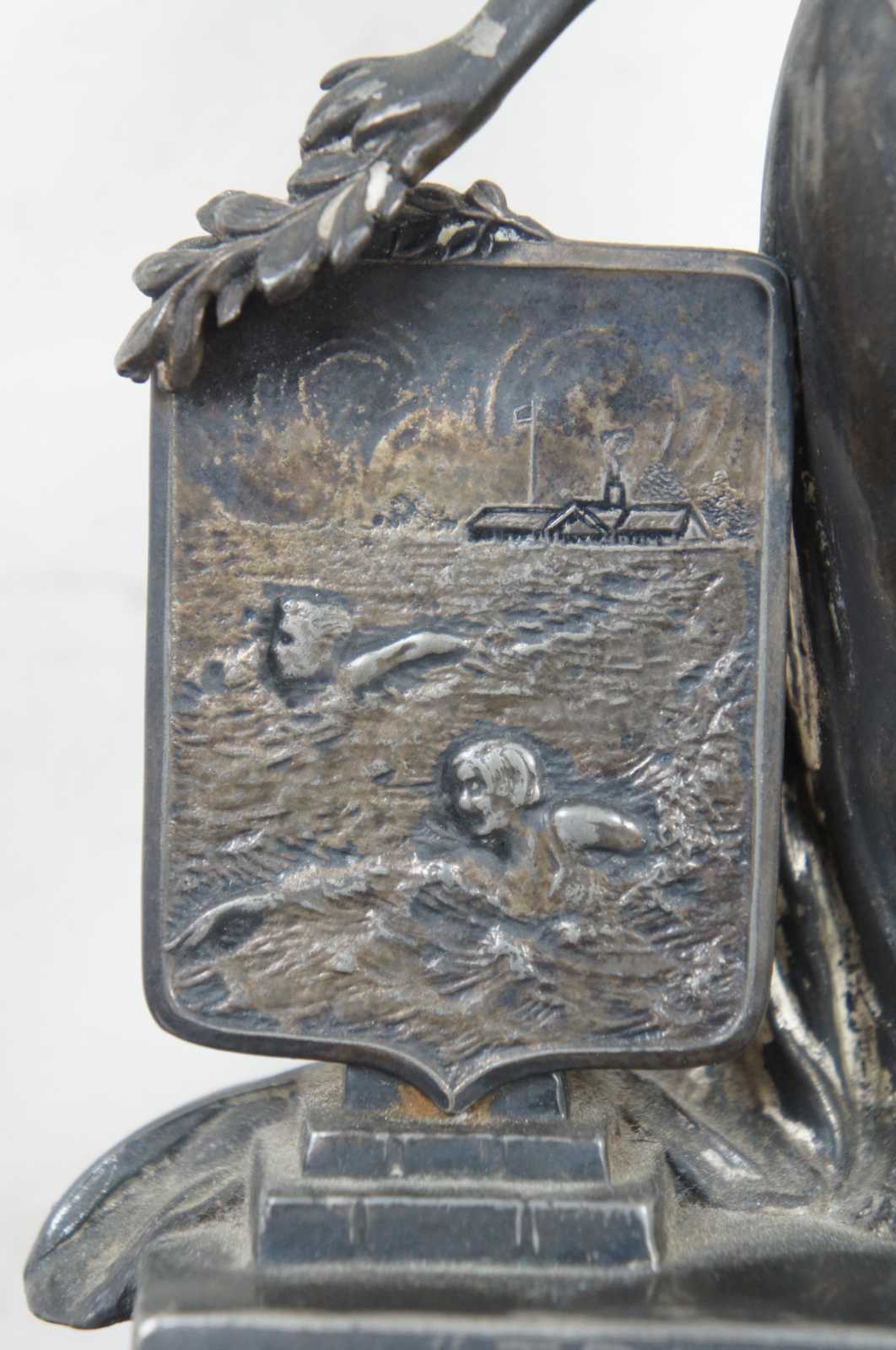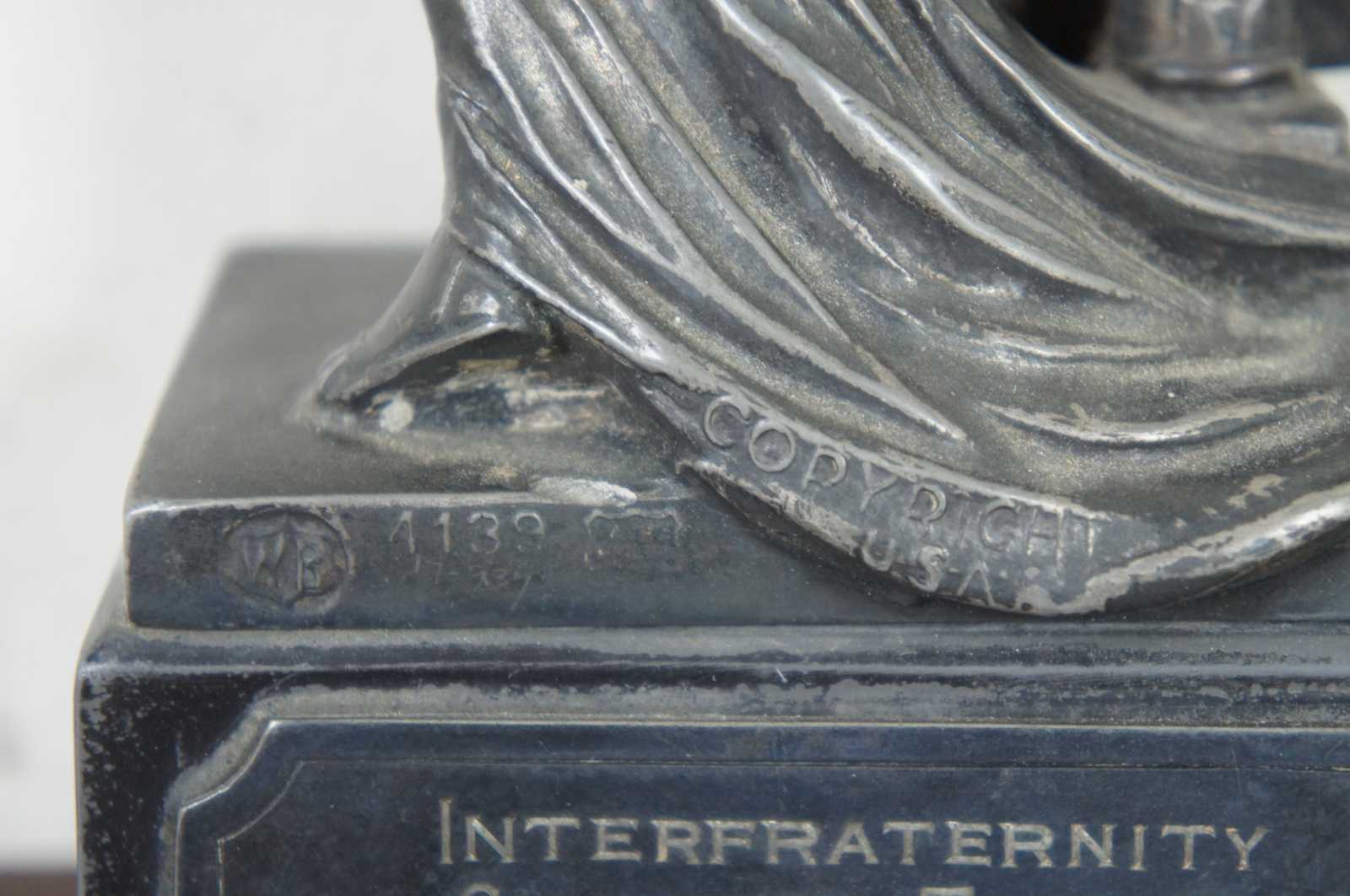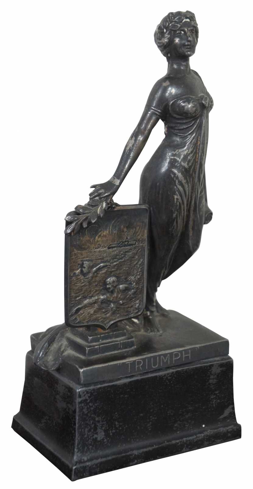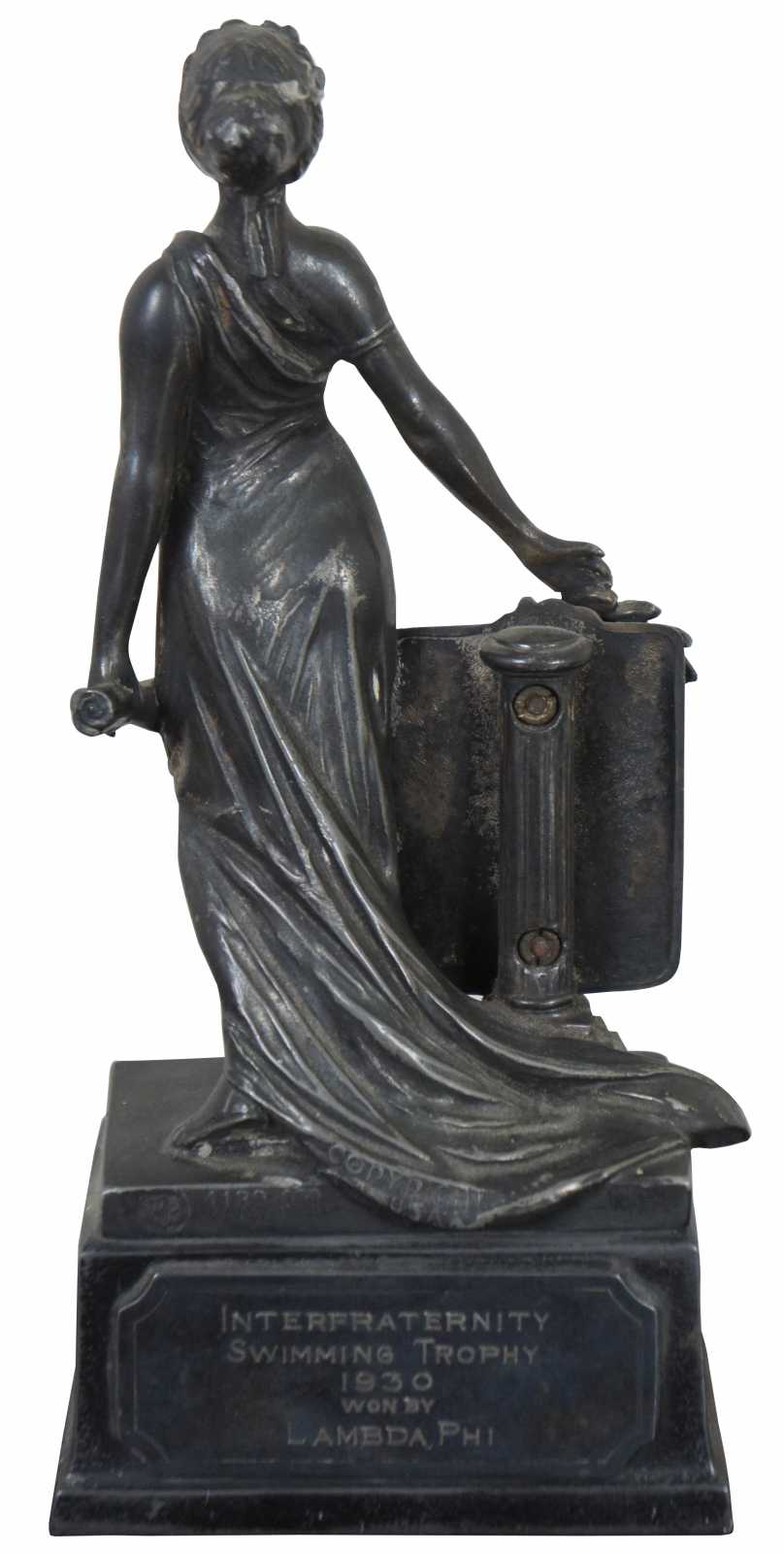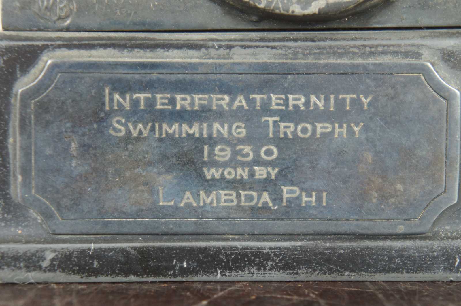 Antique cast metal trophy by Weidlich Brothers, featuring a Greek/Roman goddess style figure labeled Triumph and a shield showing a swimming scene. The plaque on the back identifies it as the “Interfraternity Swimming Trophy 1930 Won by Lambda Phi.”