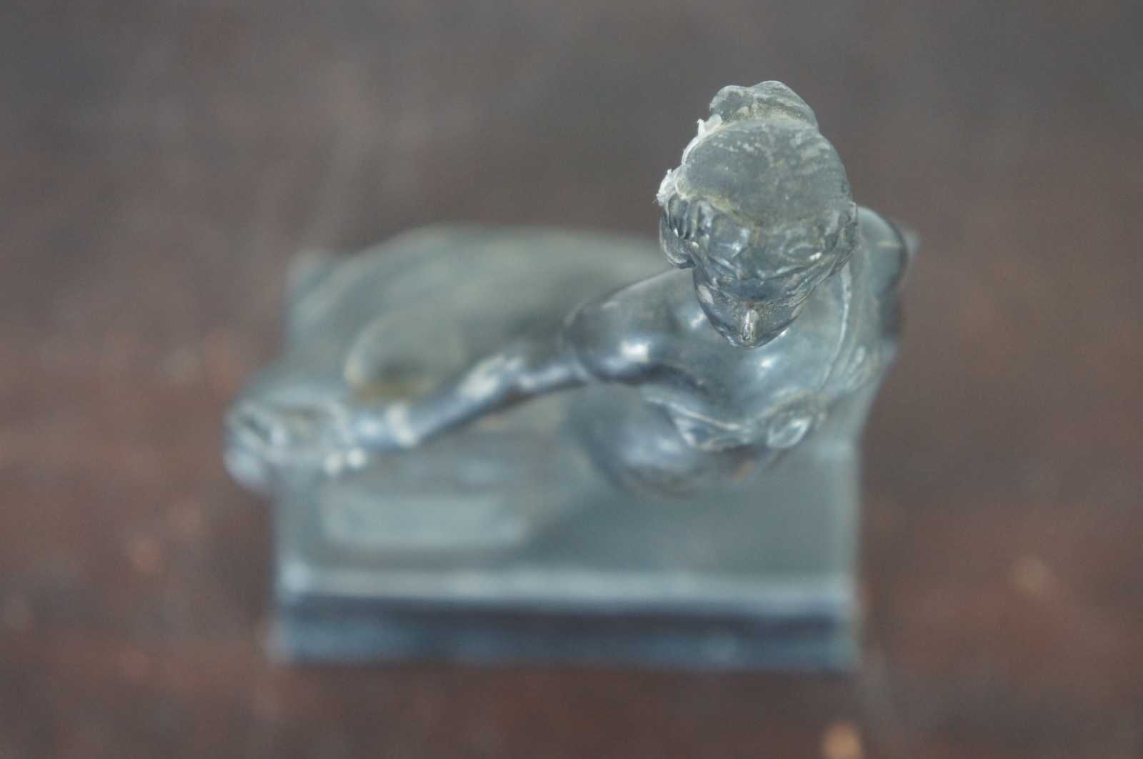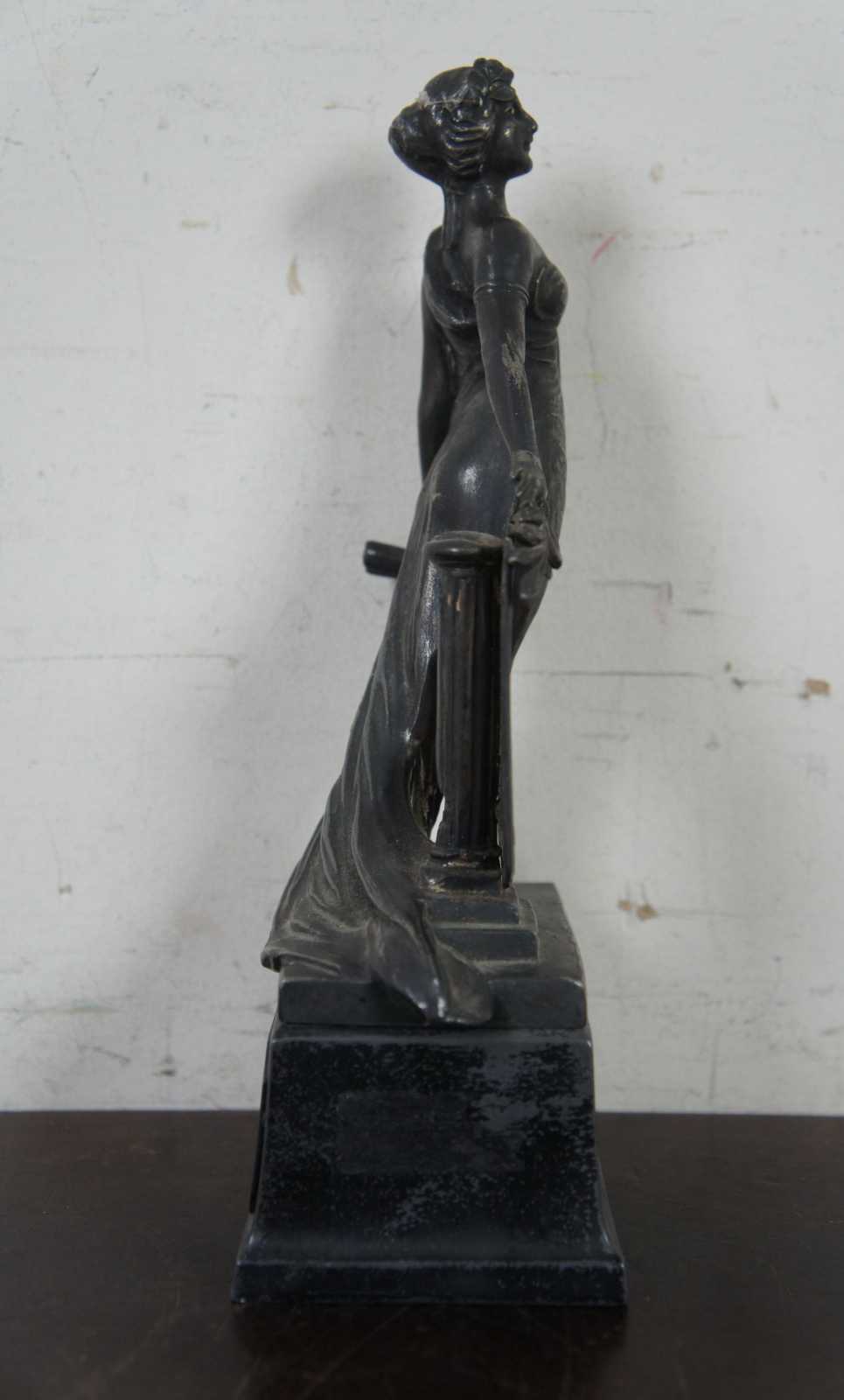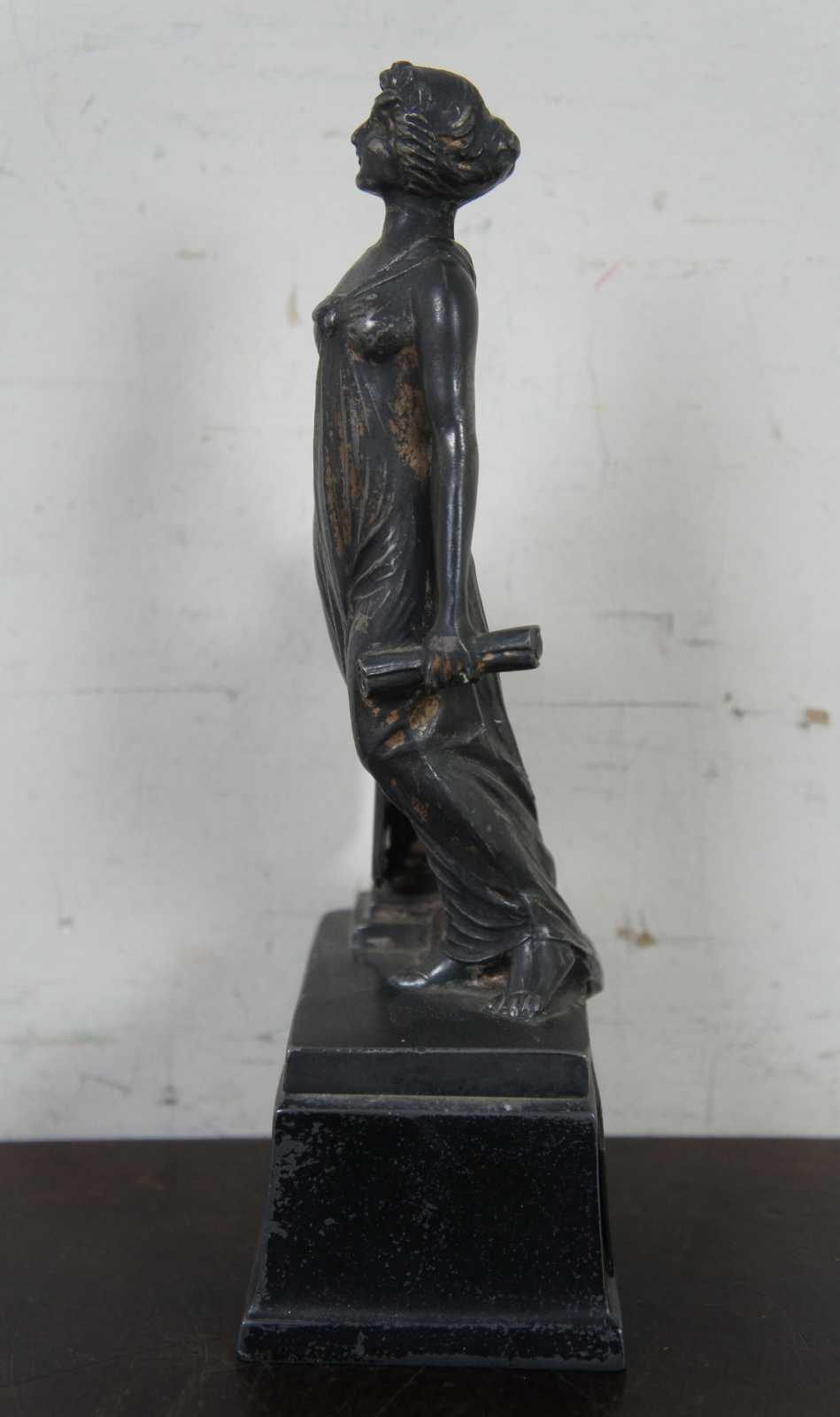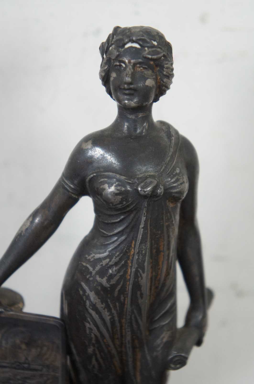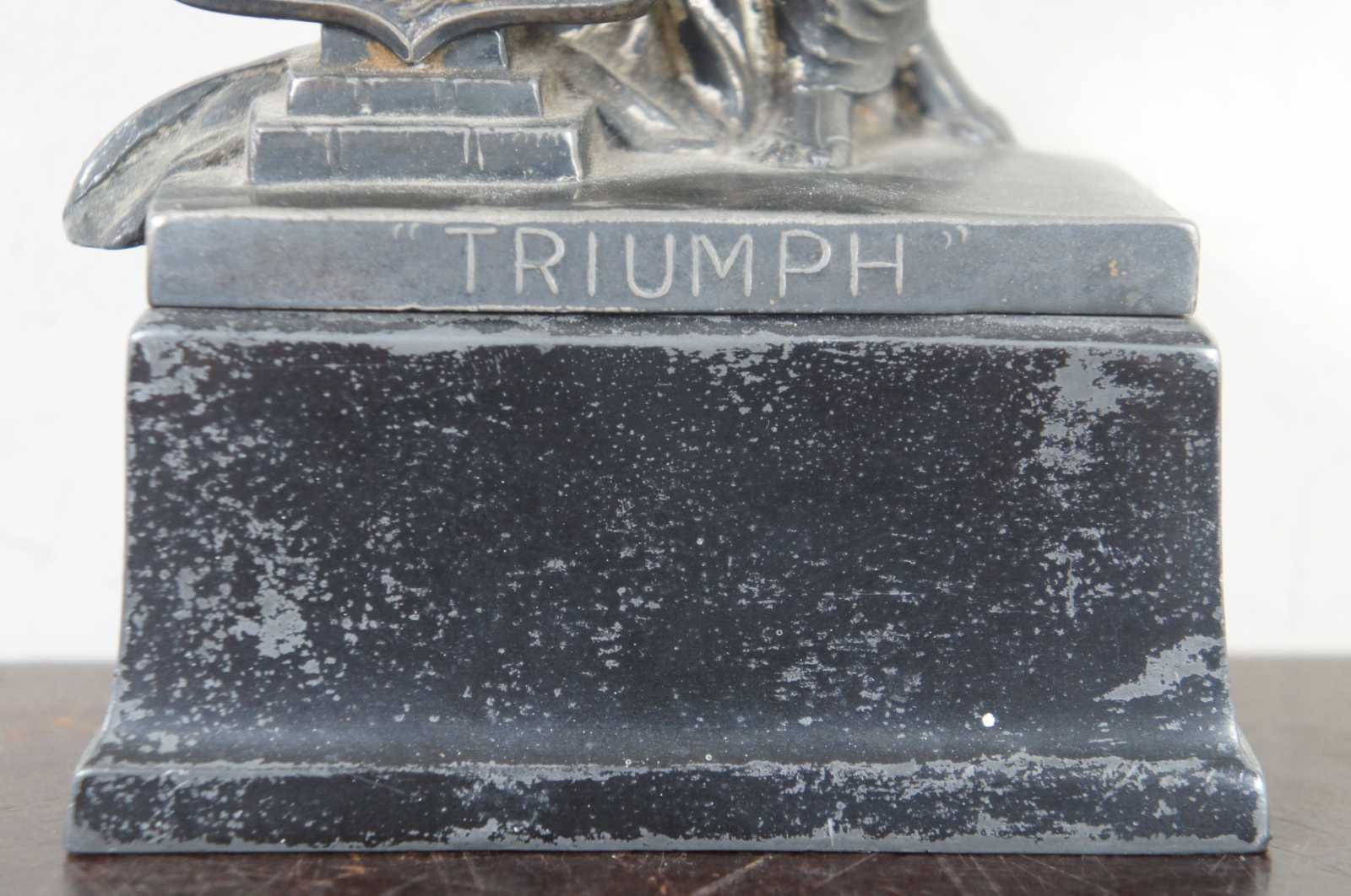Antique cast metal trophy by Weidlich Brothers, featuring a Greek/Roman goddess style figure labeled Triumph and a shield showing a swimming scene. The plaque on the back identifies it as the “Interfraternity Swimming Trophy 1930 Won by Lambda Phi.”