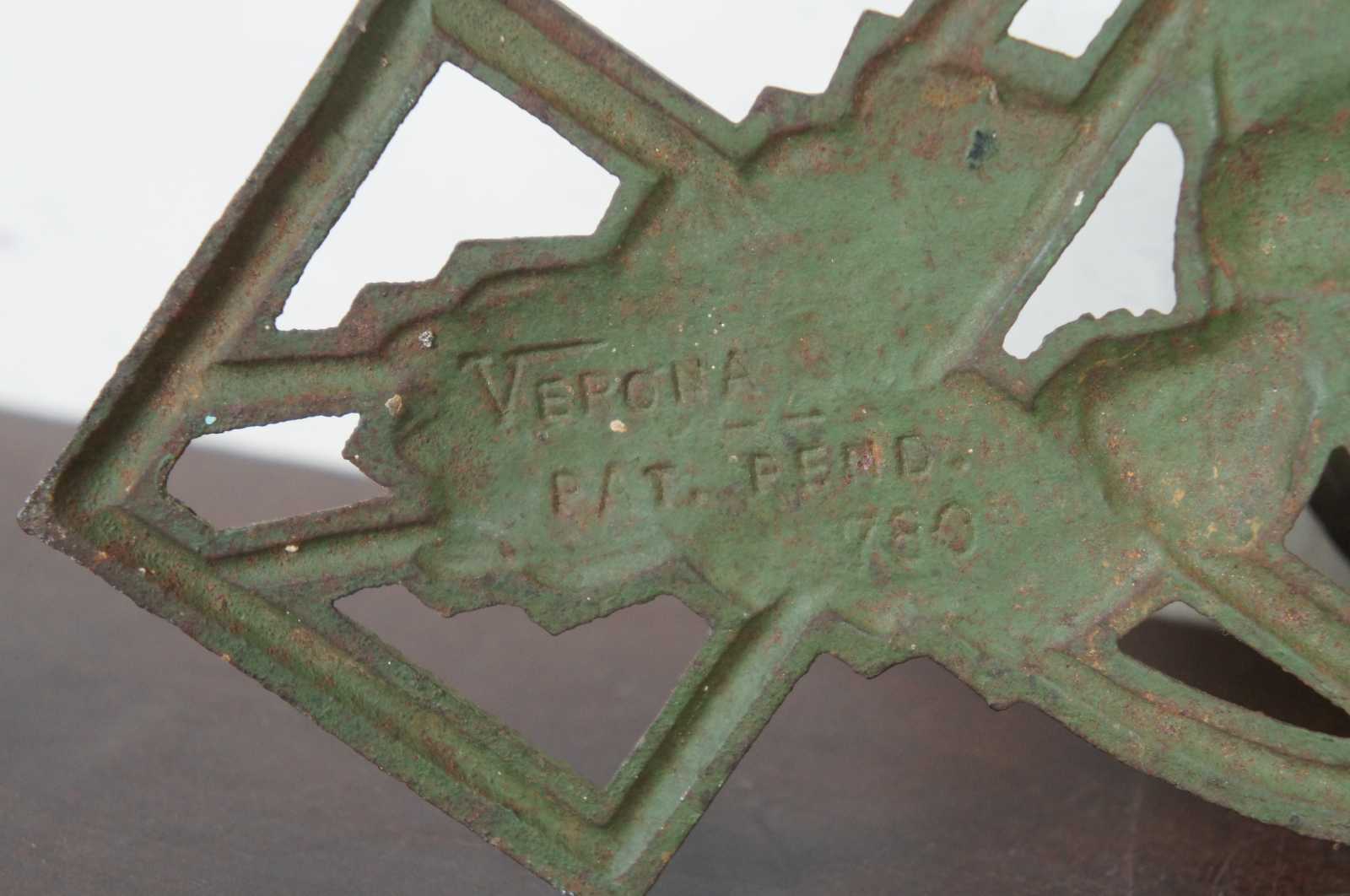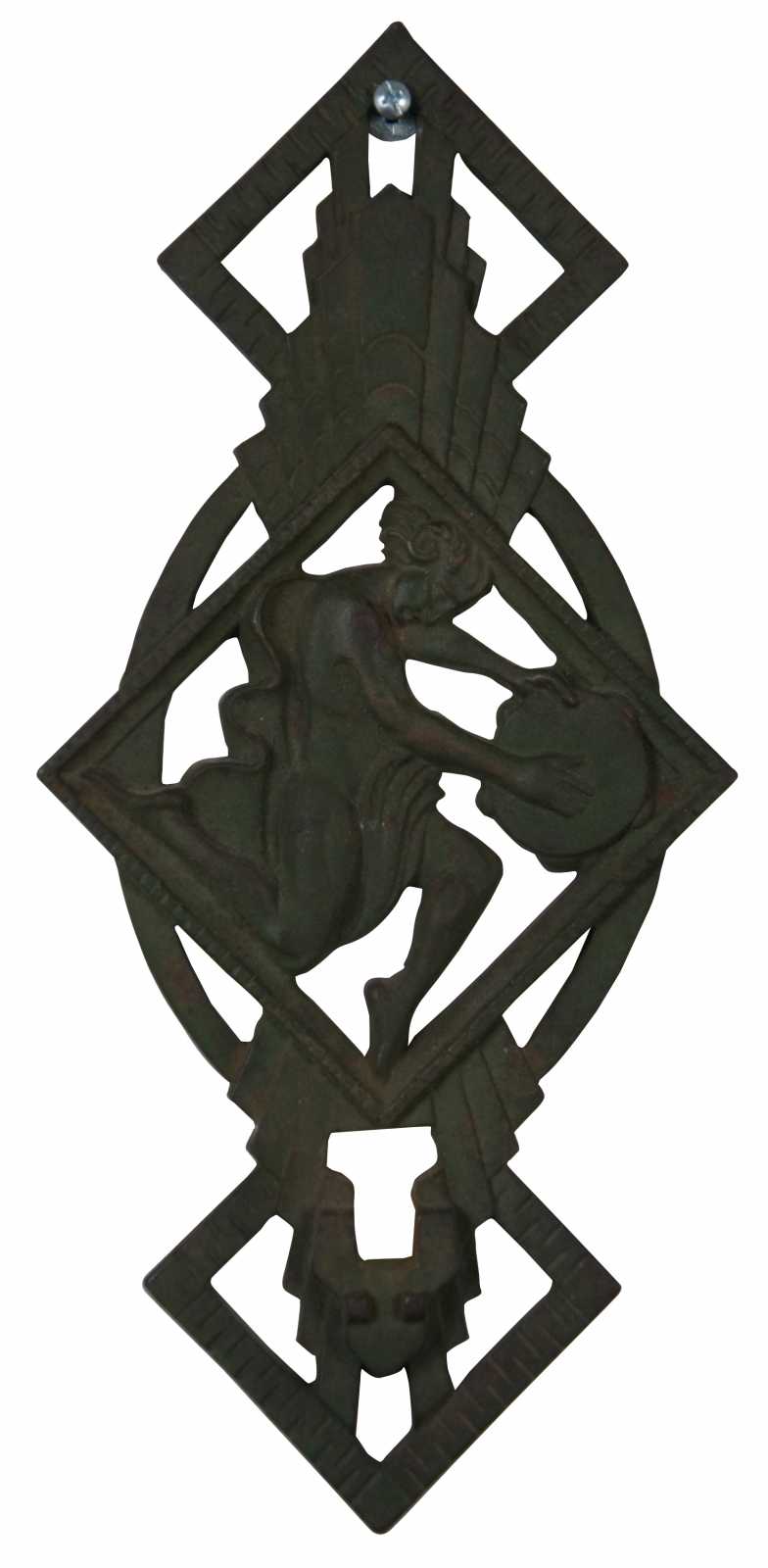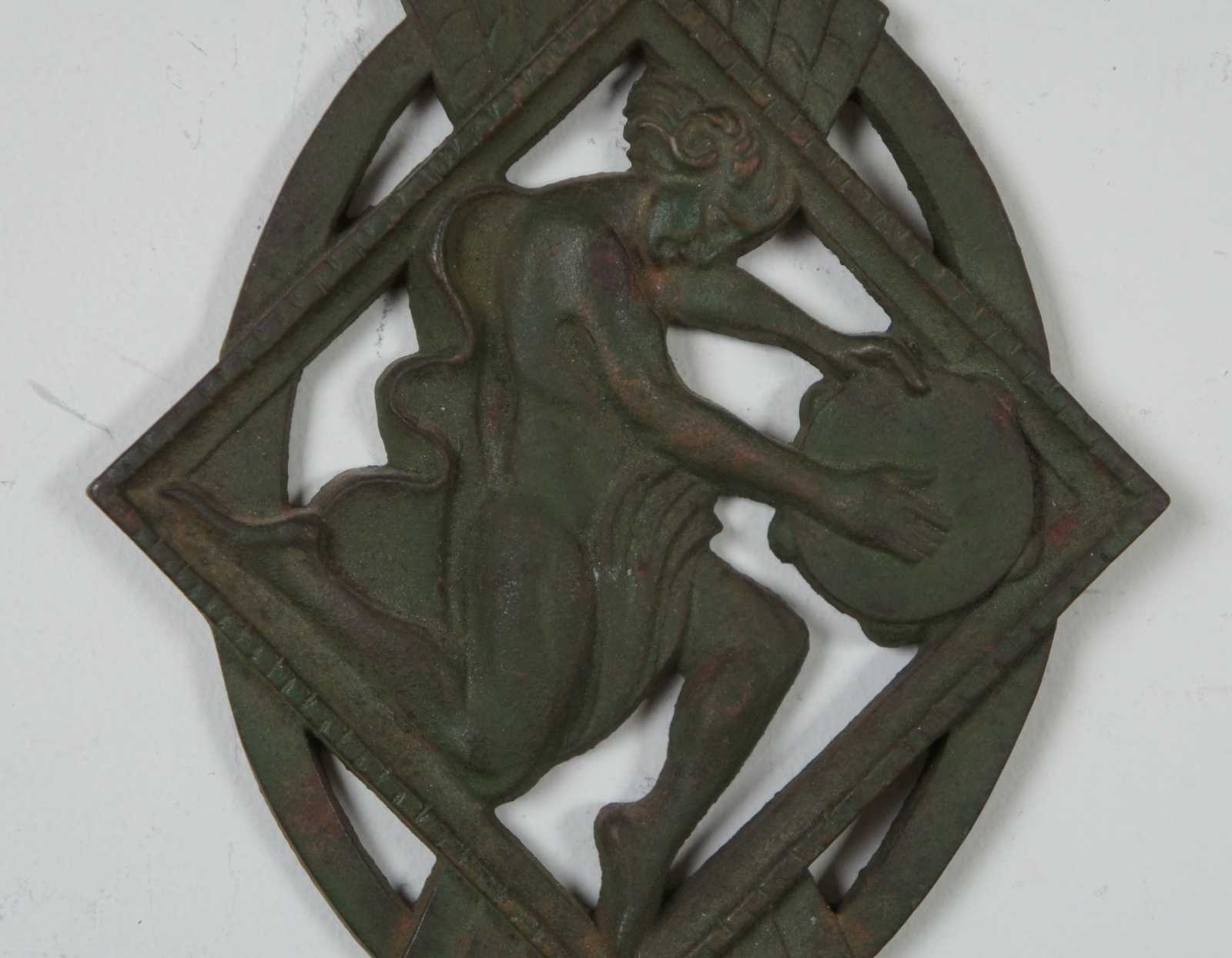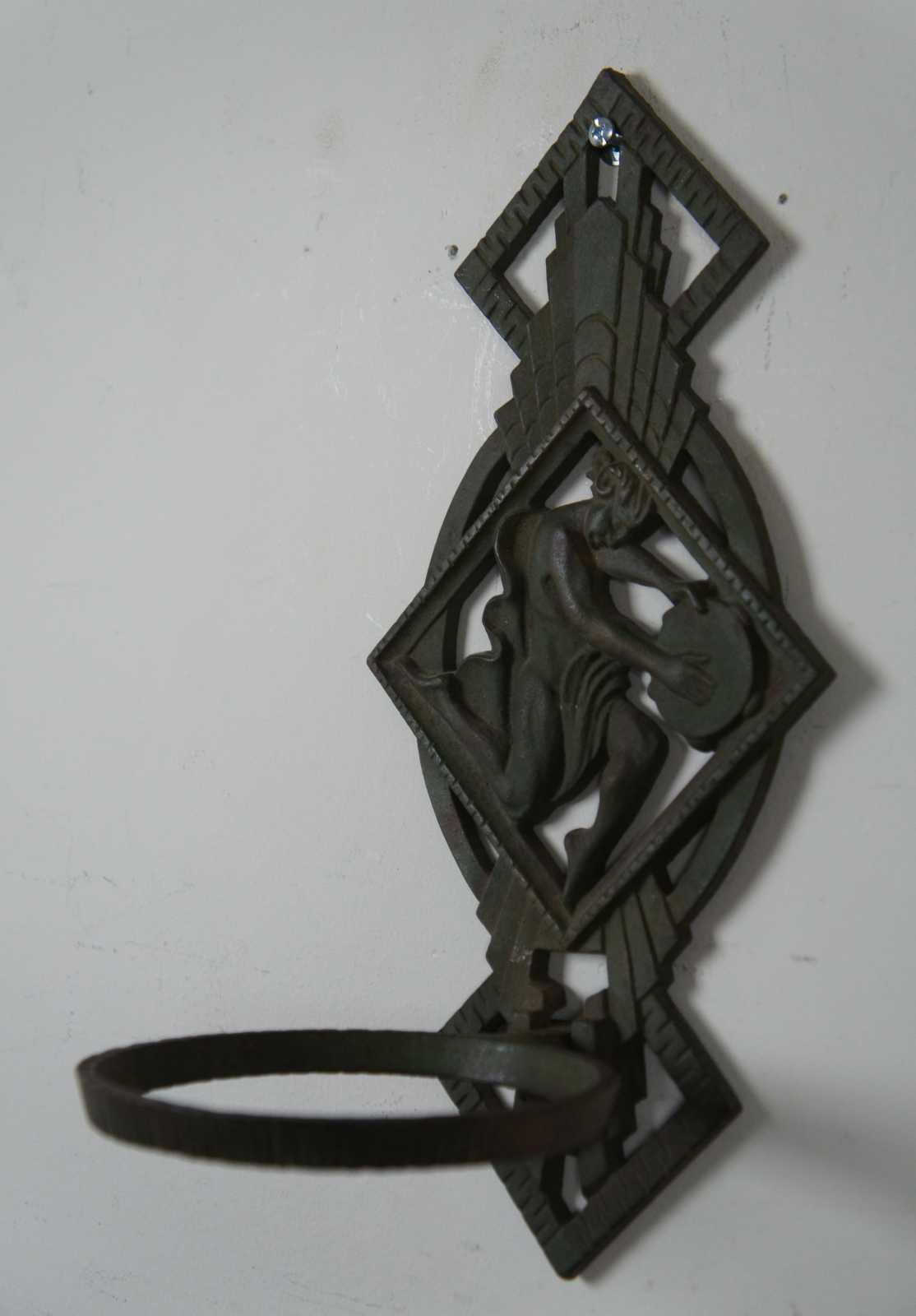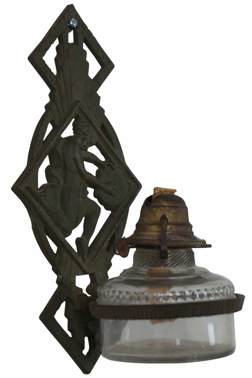 Antique art deco cast iron wall sconce bracket by Verona, featuring a dancing figure in a toga playing a tambourine. Oil lamp holder notches into wall plate and holds the glass based oil lamp.