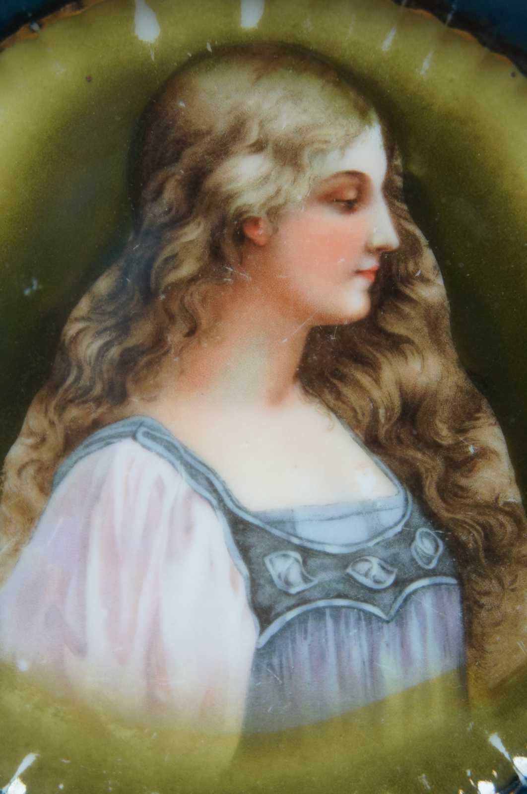 Set of three framed portrait plates portraying Renaissance styled women from Victoria Austira. These plates were made in the factory that was established in 1883 in Karlsbad (Karlovy Vary) by a London company Lazarus & Rosenfeld Ltd. In 1885 it was bought by Franz Schmidt and renamed Porzellanfabrik Victoria Schmidt & Co. In 1927 it was transformed into a stock company Porzellanfabrik Victoria AG. In 1945 the factory together with the Altrohlau Porcelain Company became a part of state owned EPIAG / Starorolský Porcelán and in 1958 Karlovarský Porcelán Stará Role II. Nowadays it is a part of Thun Karlovarský Porcelán.