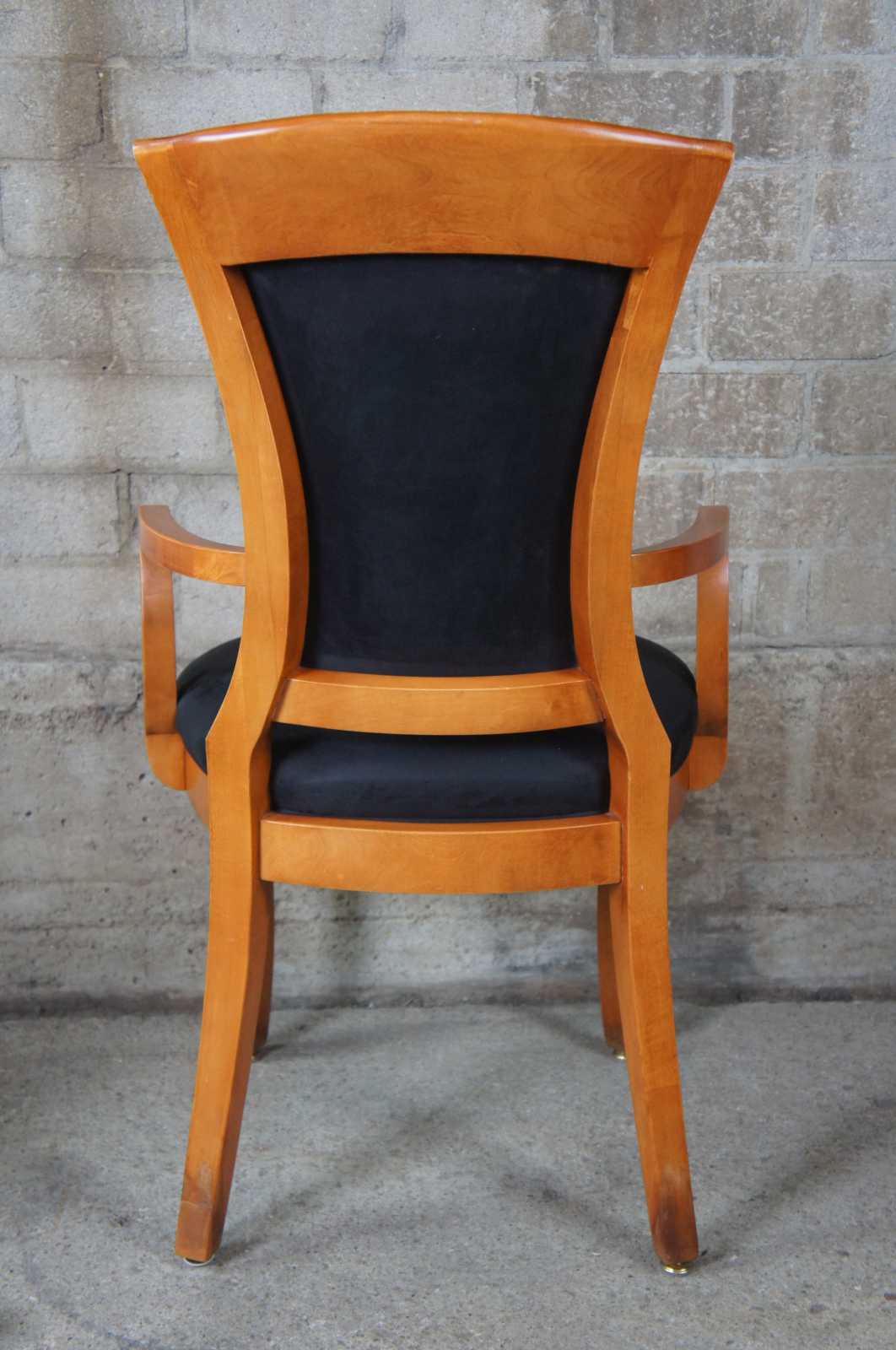 Circa 1990s National Mt Airy dining chairs. Beidermeier style with maple and ebonized frame. Upholstered in black with two arm chairs.