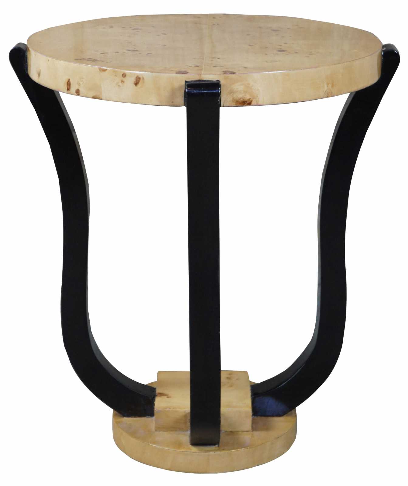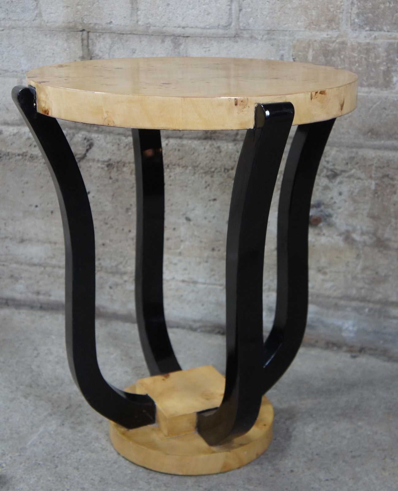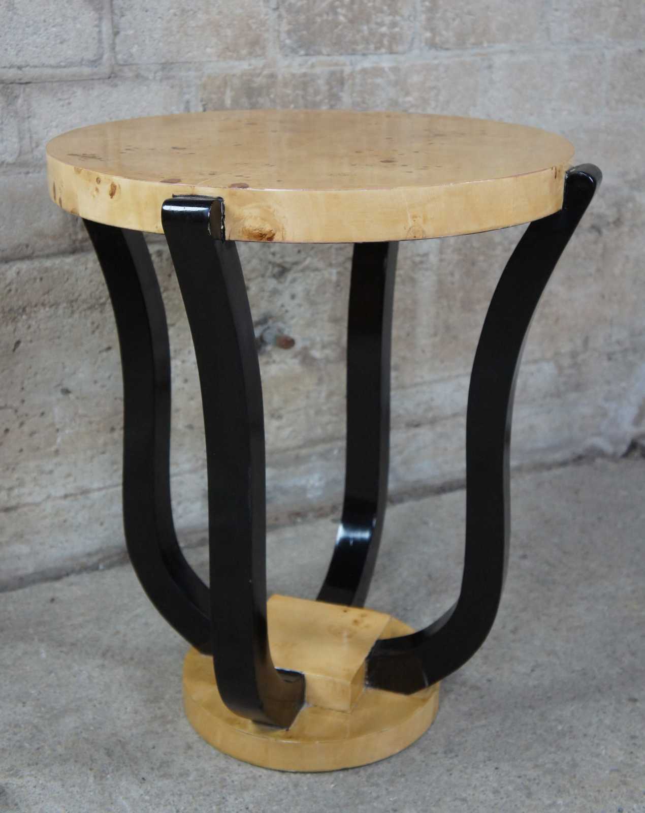 Late 20th century Biedermeier style side table, features a two tier design with birdseye maple and black lacquer supports.