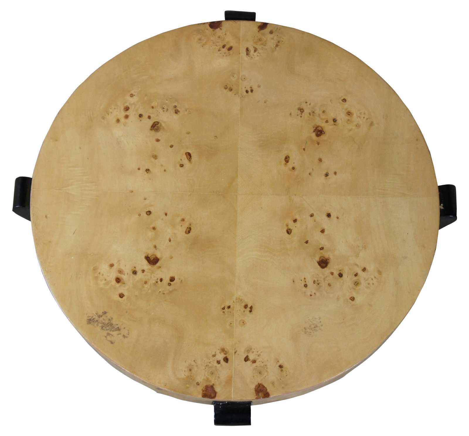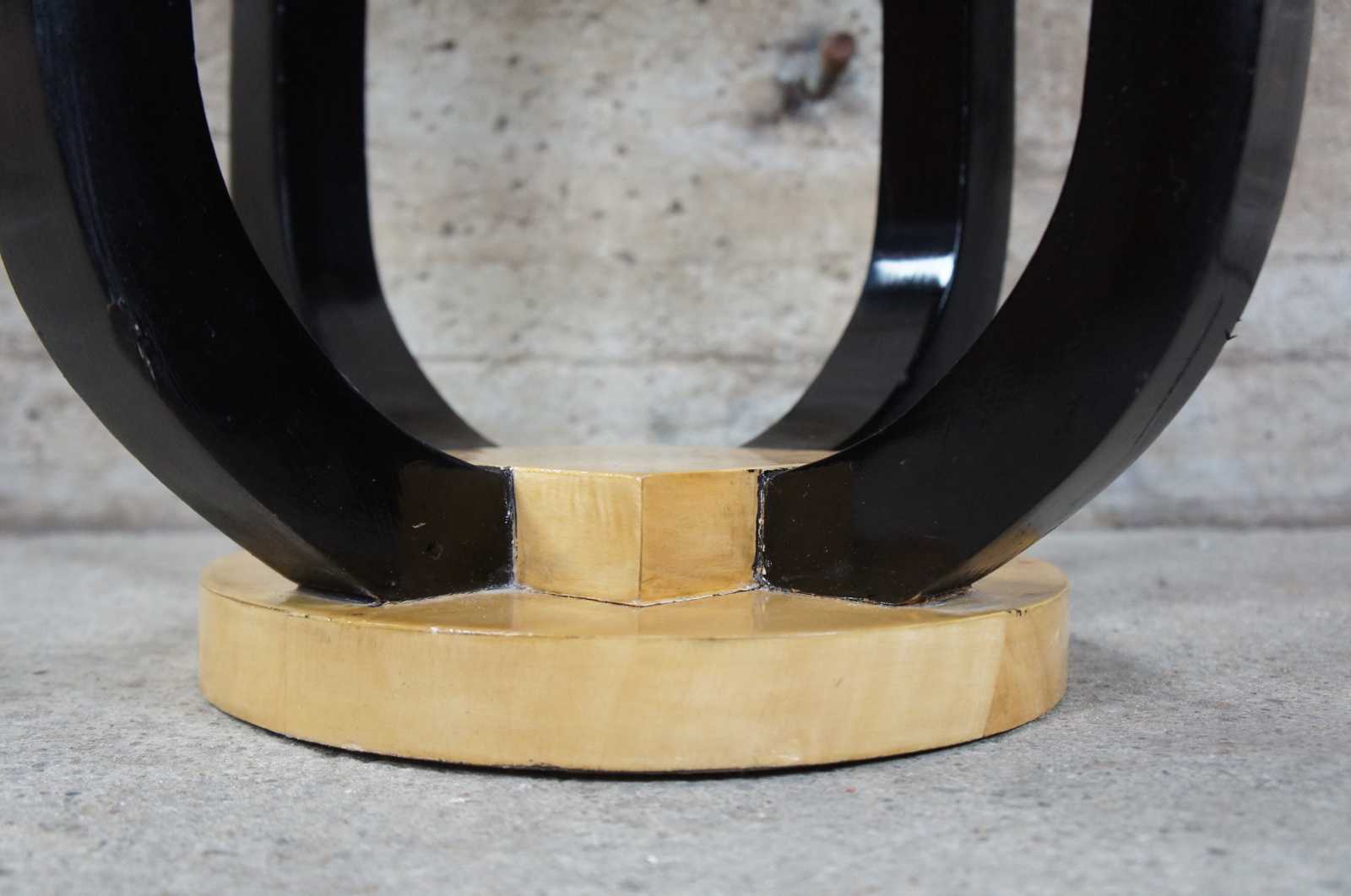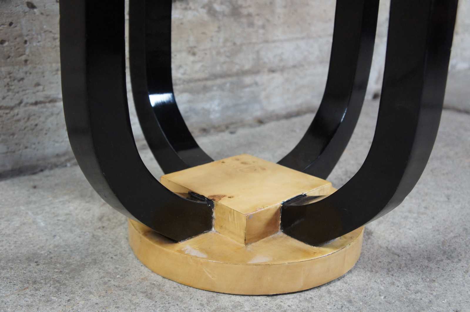 Late 20th century Biedermeier style side table, features a two tier design with birdseye maple and black lacquer supports.