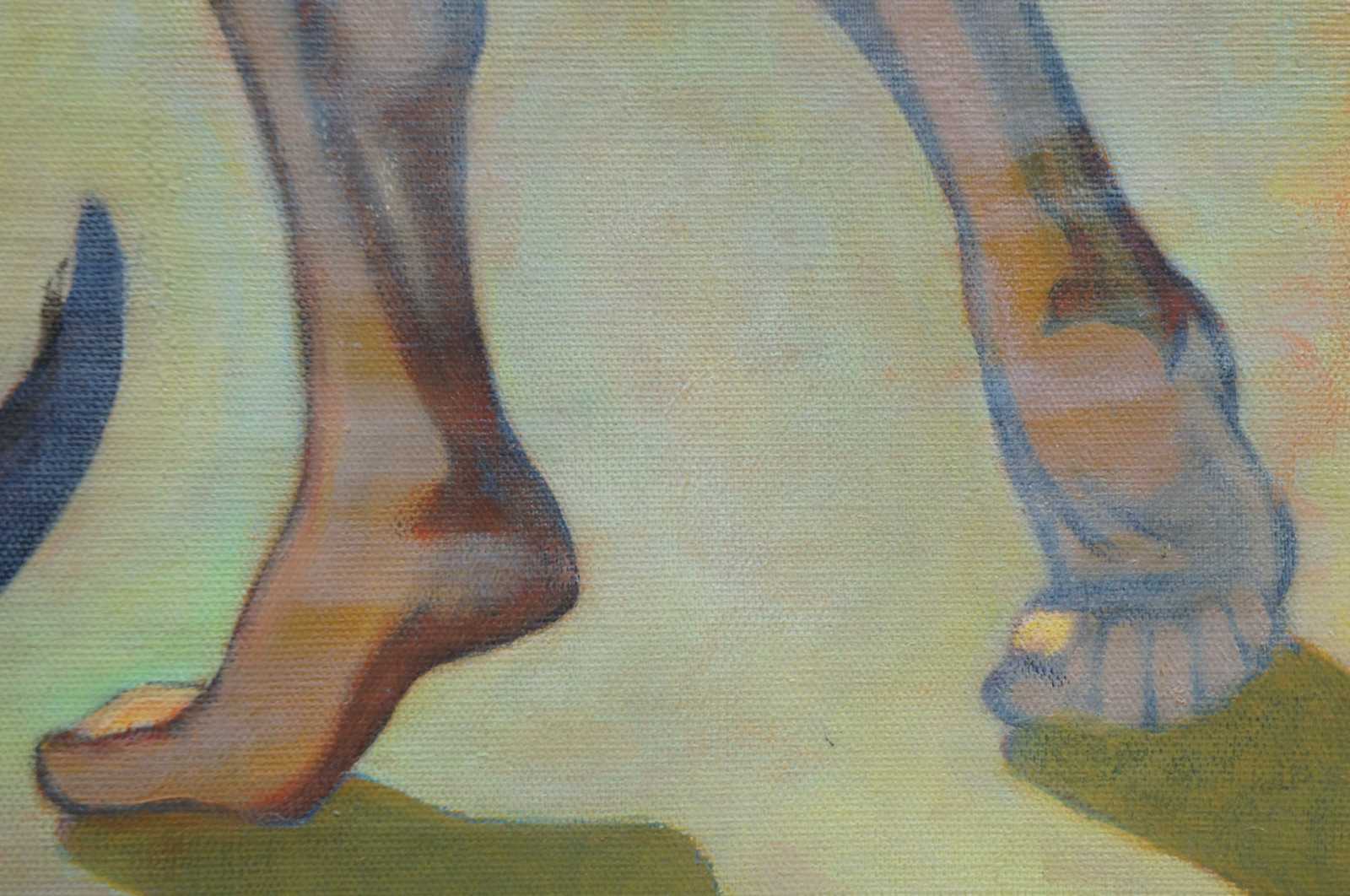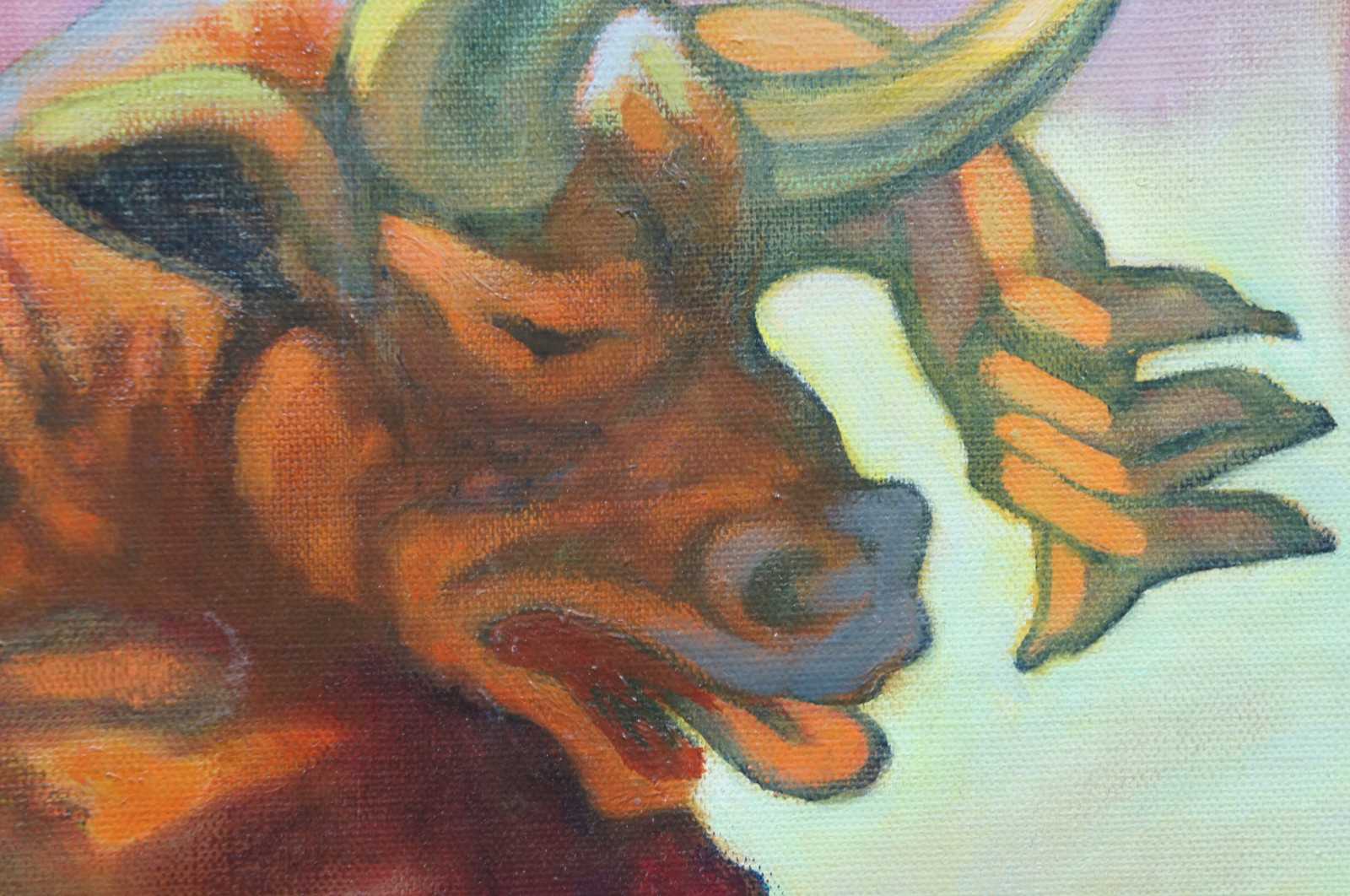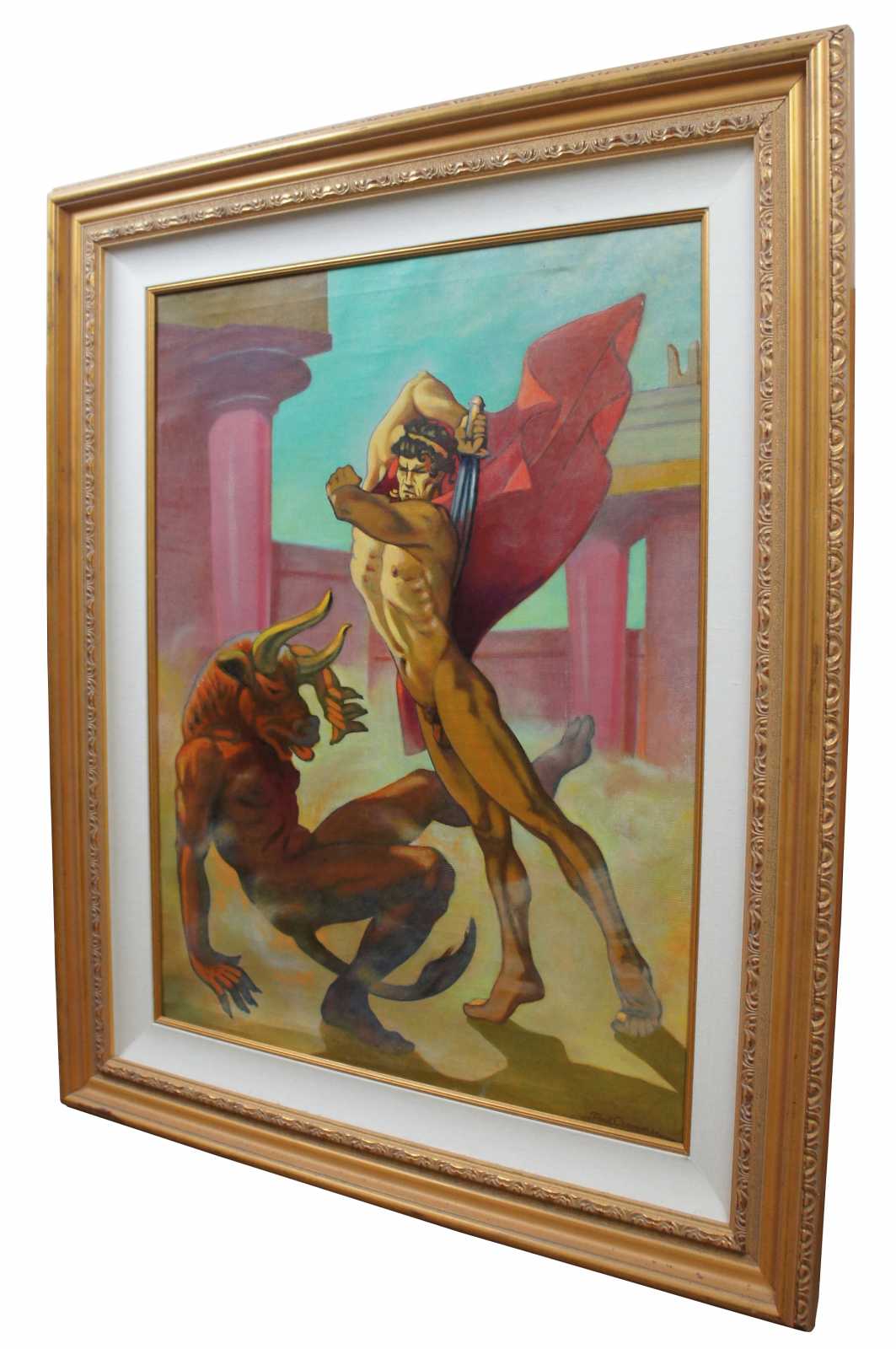 Oil on canvas painting by Paul Cooreman showing the mythological Greek hero Theseus in the act of slaying the Minotaur. / BIO: Paul Cooreman was active/lived in Belgium. Paul Cooreman is known for Painting. Born in 1910, Paul Cooreman's creative work was largely inspired by the 1930s. The period of the 1930s is epitomised by the clashing of a number of political ideologies, including Marxist Socialism, Capitalist Democracy, and the Totalitarianism of both Communism and Fascism. Surrealism continued to dominate in Europe, and had influence internationally. Artists such as Frida Kahlo and Diego Riviera in Mexico, worked to integrate the ideas posed by Surrealism into their radical political philosophies, developing a new kind of magic realism.