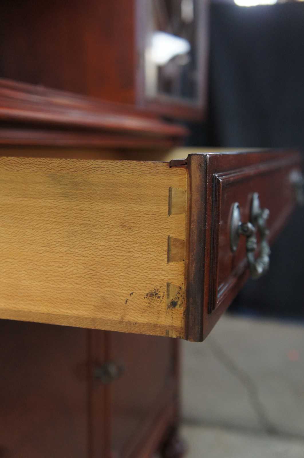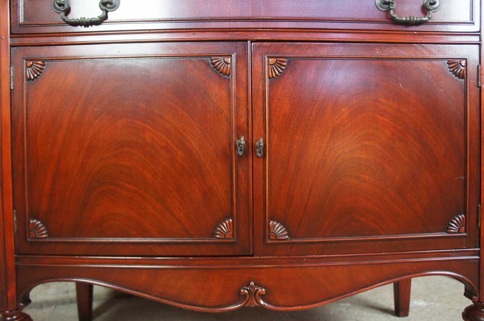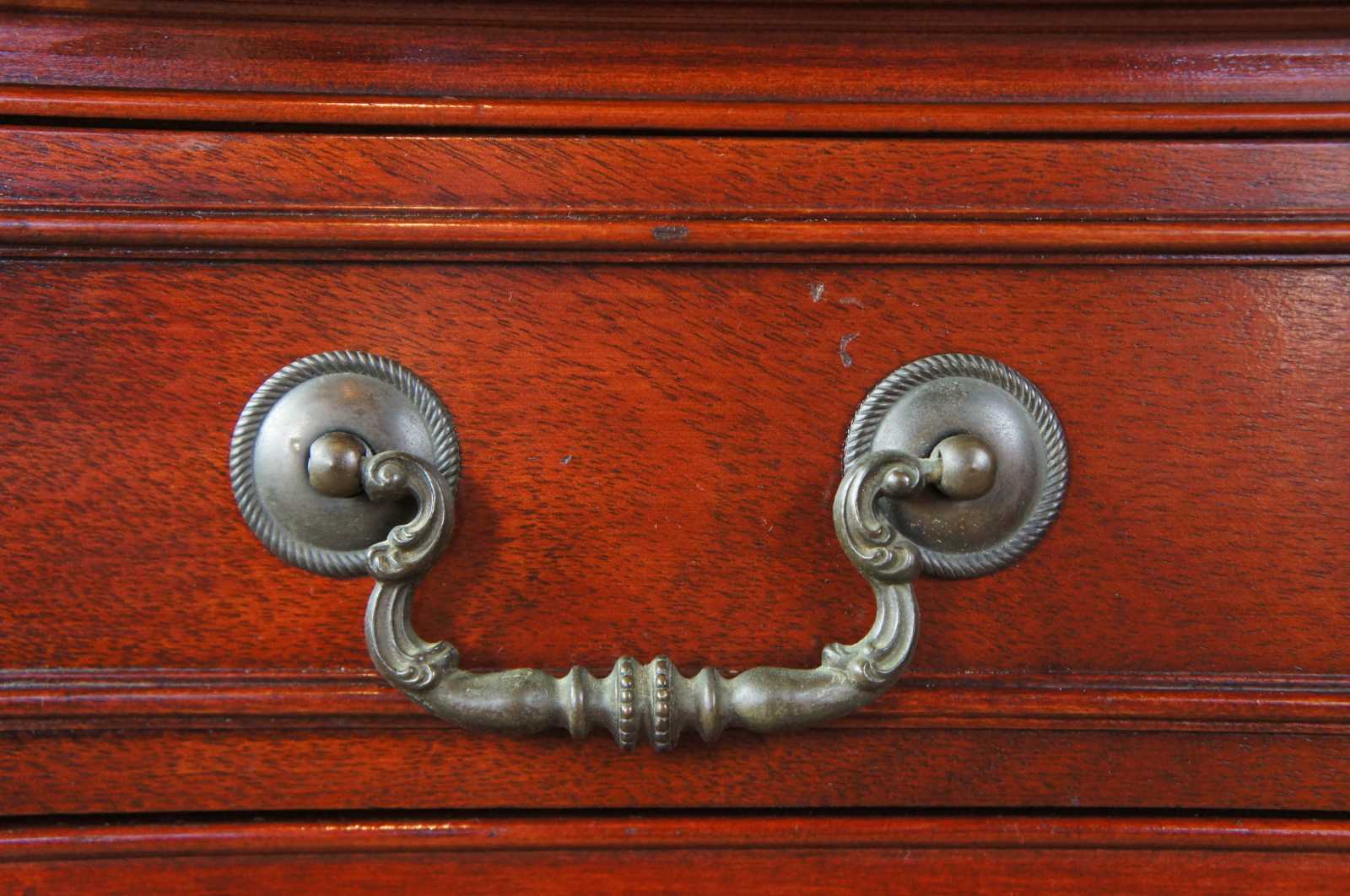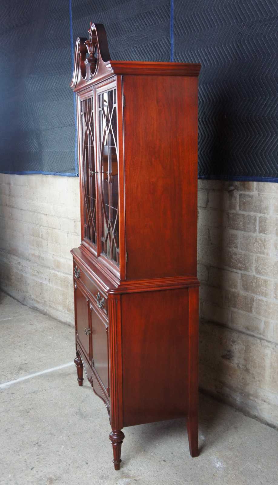 Circa 1940s American mahogany china cabinet. Features Sheraton styling with an open pediment and central trophy finial. The glass covered fretwork doors open to two shelves. Lower storage includes one drawer and cabinet. Legs are tapered and fluted.