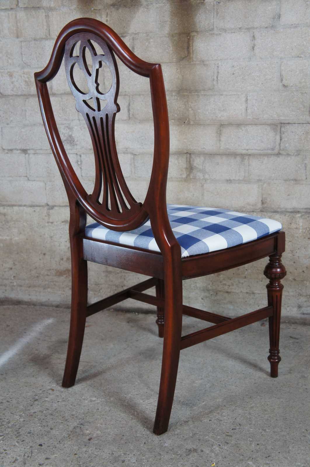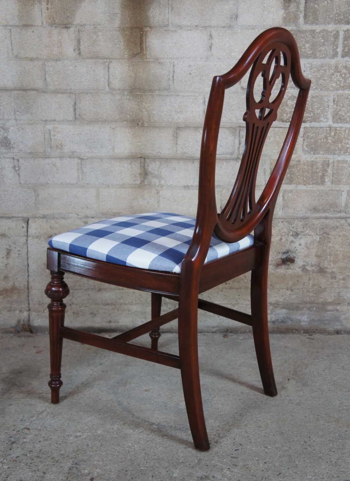 Circa 1940s American Red Mahogany Dining Chairs. Features a blend of sheraton and hepplewhite styling with a pierced shield back. Upholstered in a white and blue check over turned fluted and tapered legs connected by an H stretcher leading down to an arrow/ peg foot.