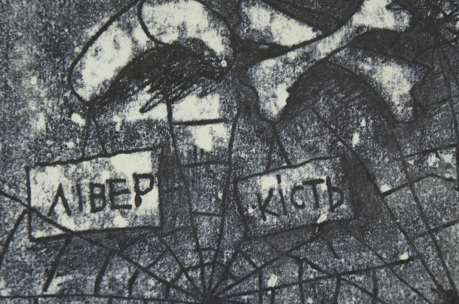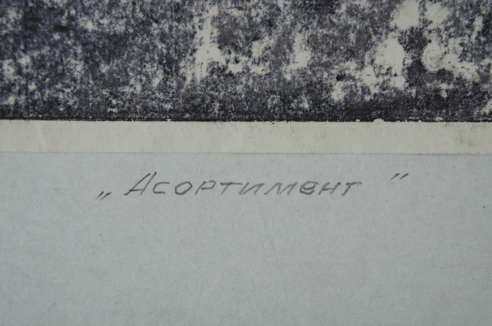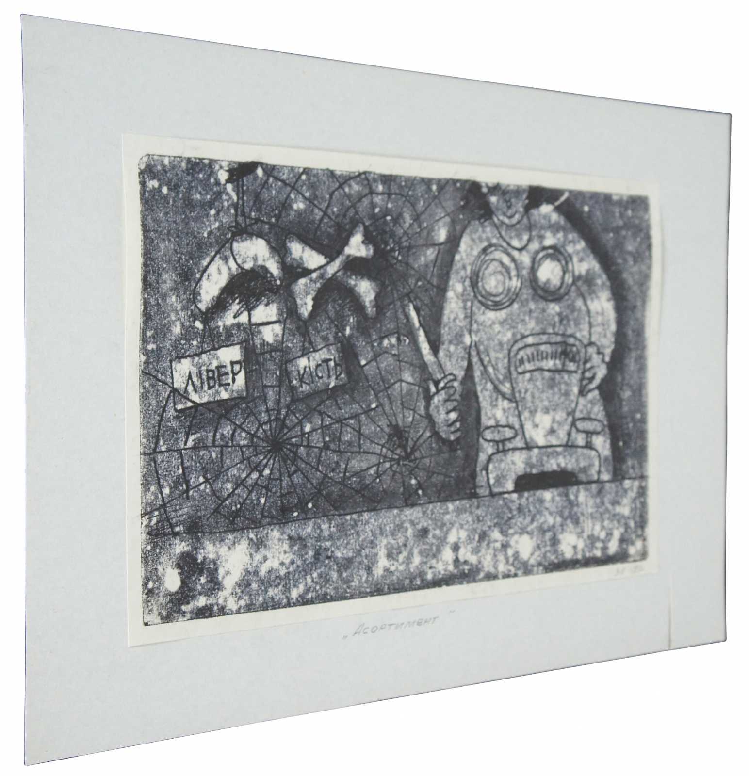 Vintage 1989 black and white Ukrainian (Borislav) etching by Lanyak Dmytro Oleksiiovych titled “Assortment” (also translates to range or stock) showing a woman / figure standing with a butcher knife at a meat scale, next to a table of spiderwebs with pluck / numbles, and bones. Titled and dated in pencil by the artist.