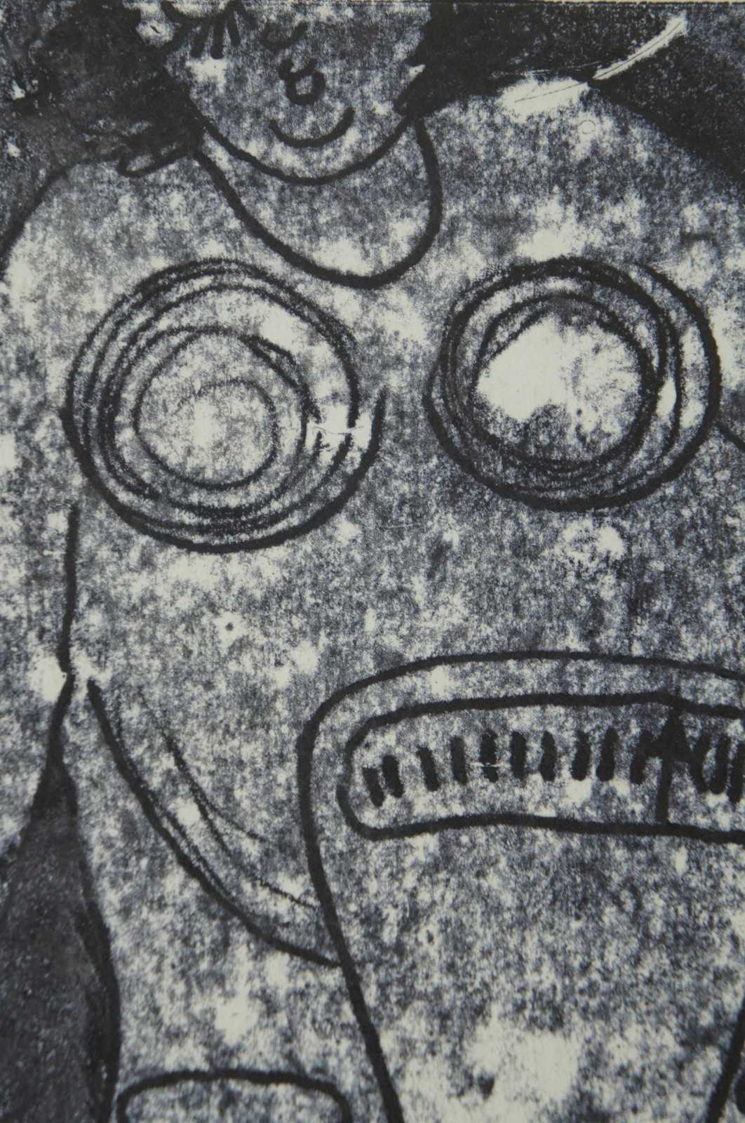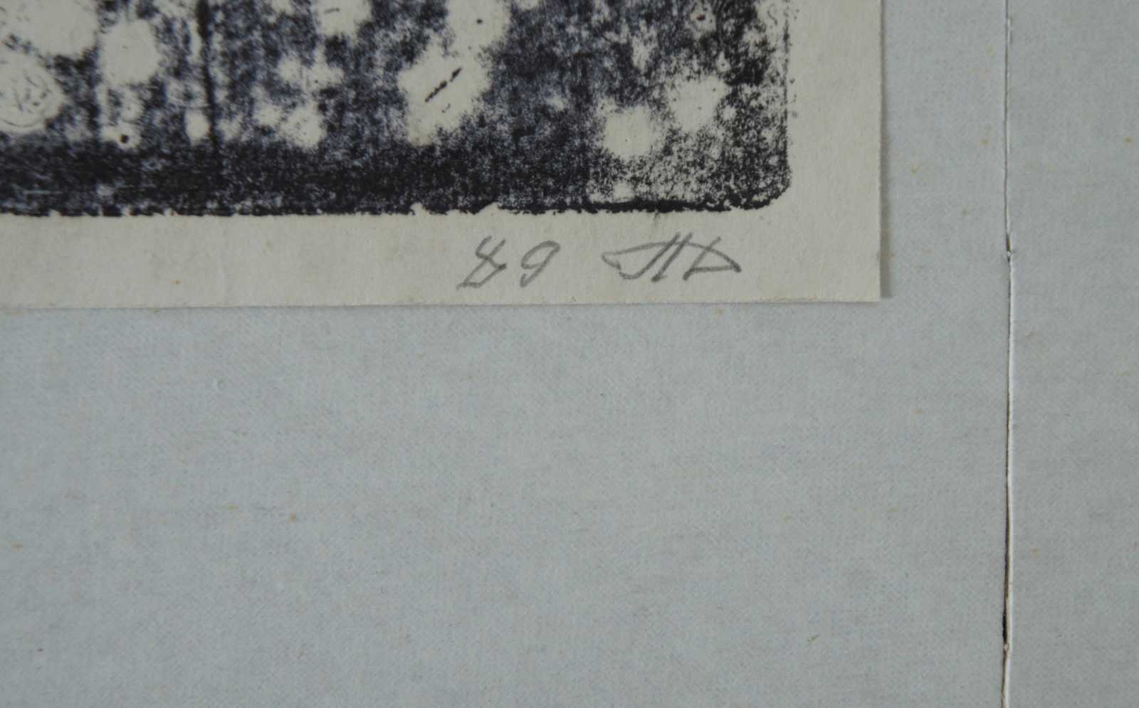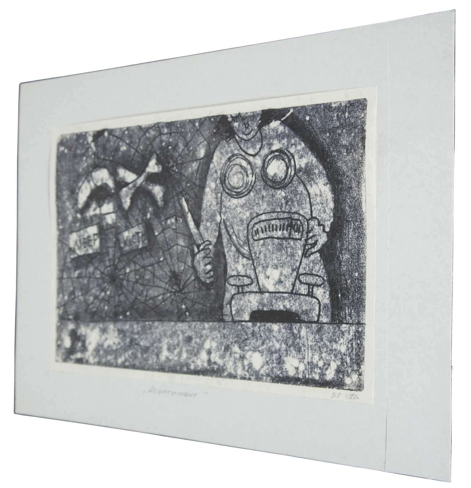 Vintage 1989 black and white Ukrainian (Borislav) etching by Lanyak Dmytro Oleksiiovych titled “Assortment” (also translates to range or stock) showing a woman / figure standing with a butcher knife at a meat scale, next to a table of spiderwebs with pluck / numbles, and bones. Titled and dated in pencil by the artist.