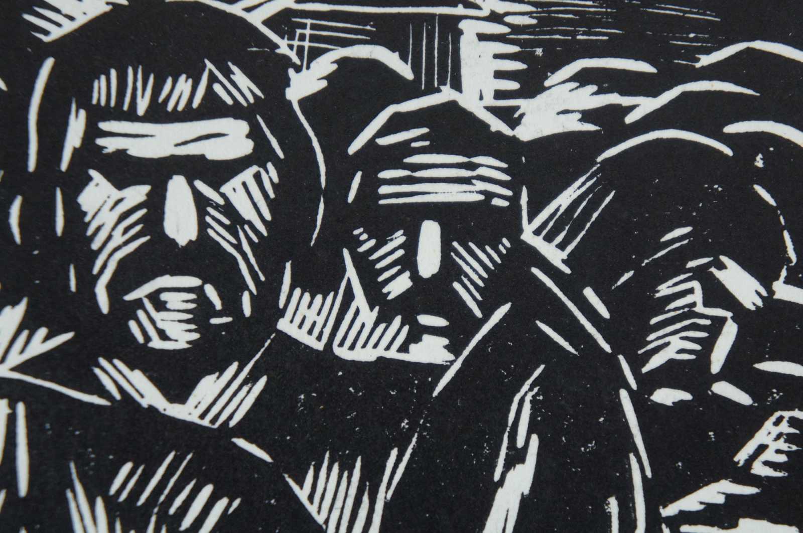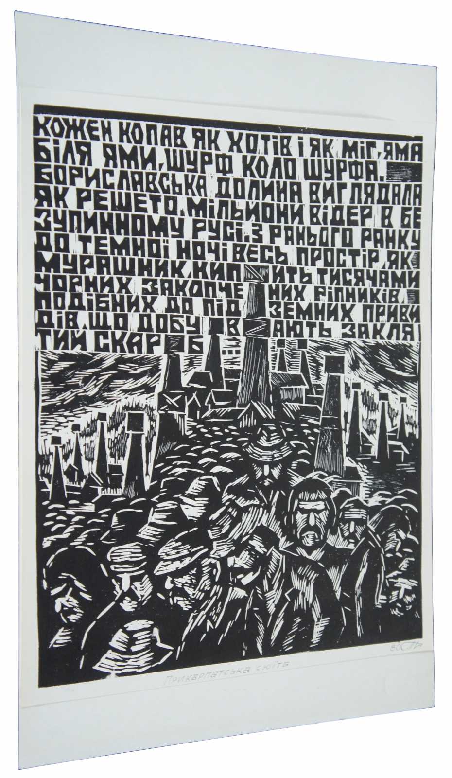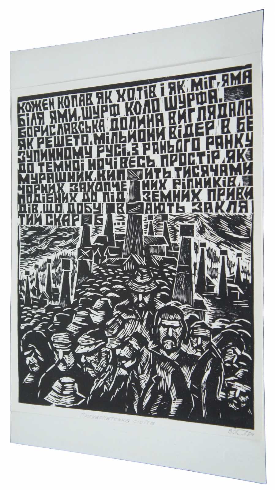 Vintage 1980 black and white Ukrainian etching by Lanyak Dmytro Oleksiiovych depicting a large group of men (miners / diggers of Ozokerite) in front of a landscape of buildings and towers, under a paragraph / quote from an uknown Ukrainian writer. Titled ""Carpathian Suite"" and dated in pencil by the artist.