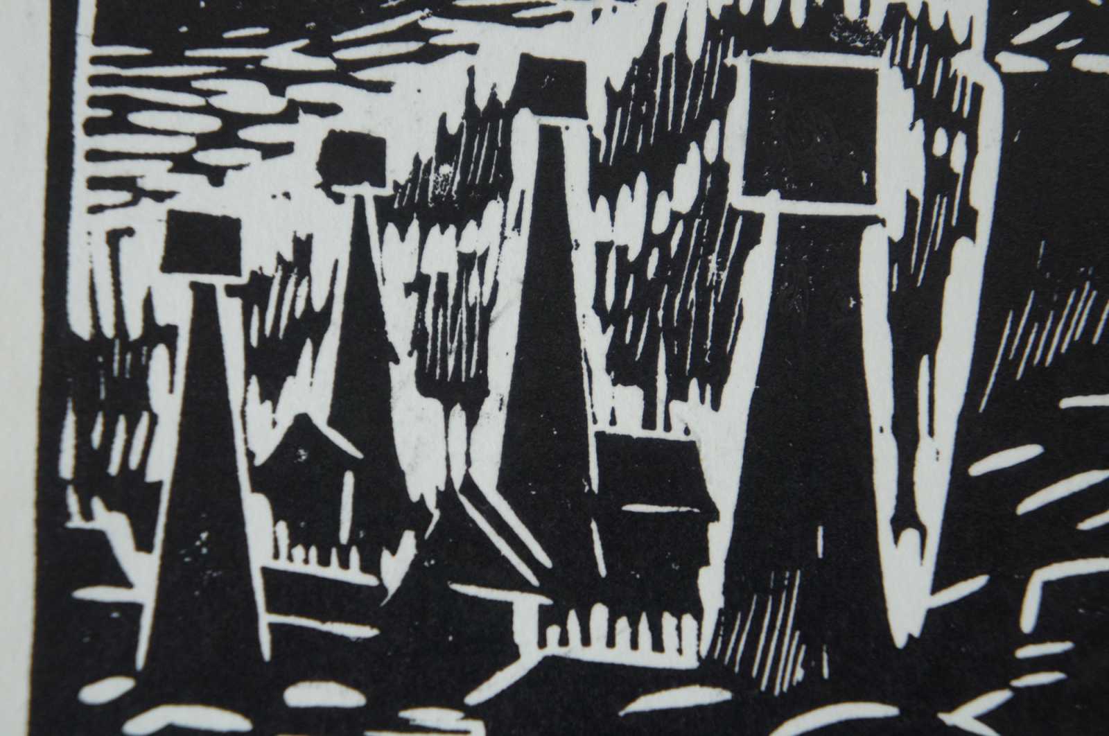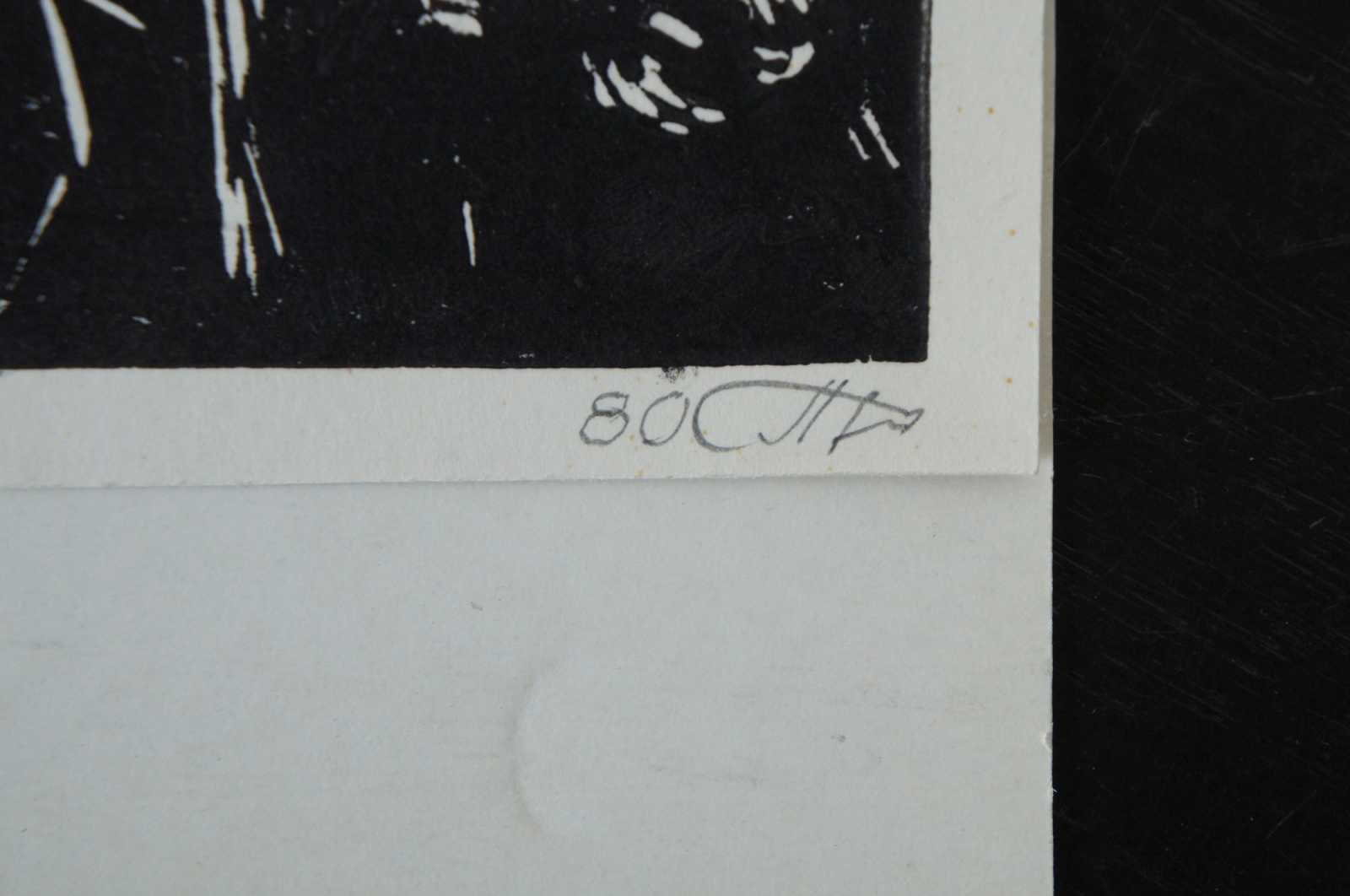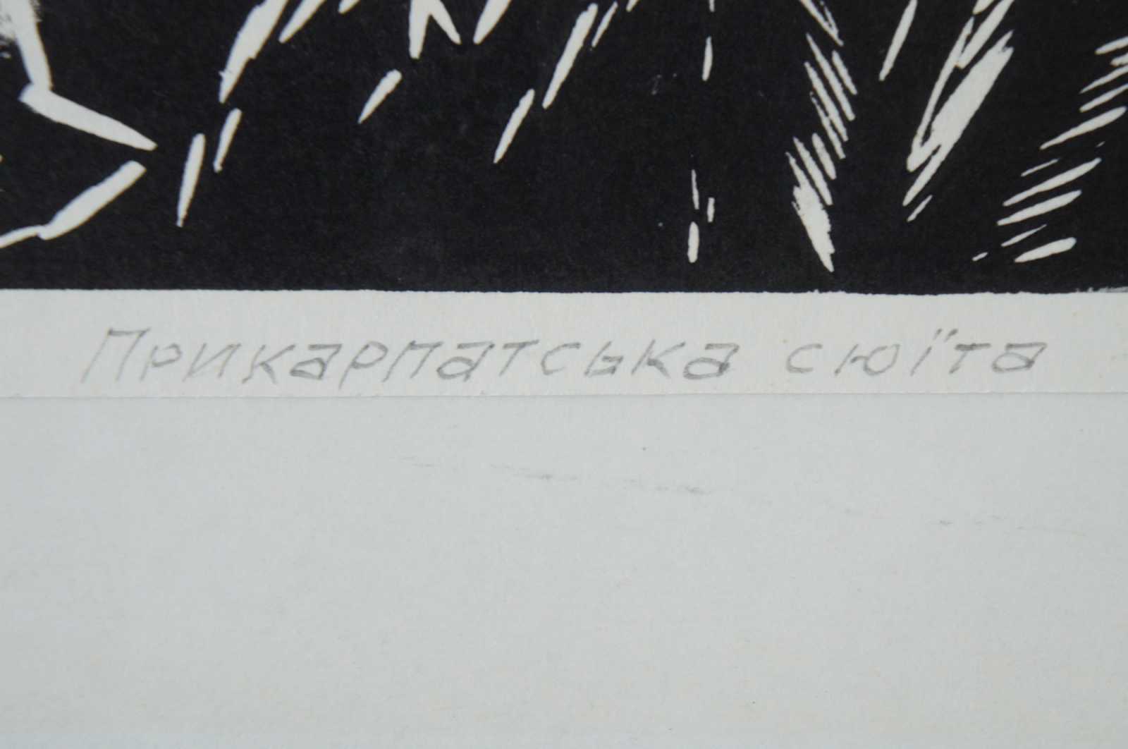 Vintage 1980 black and white Ukrainian etching by Lanyak Dmytro Oleksiiovych depicting a large group of men (miners / diggers of Ozokerite) in front of a landscape of buildings and towers, under a paragraph / quote from an uknown Ukrainian writer. Titled ""Carpathian Suite"" and dated in pencil by the artist.