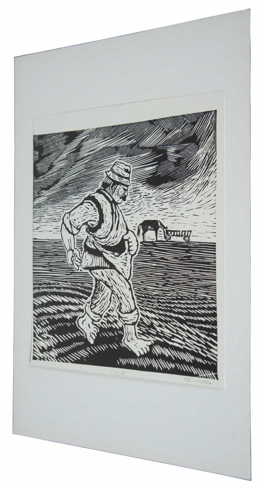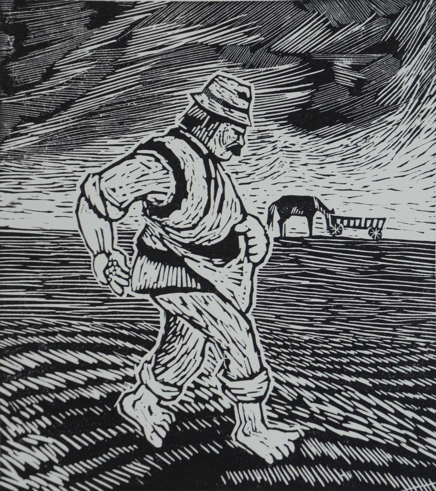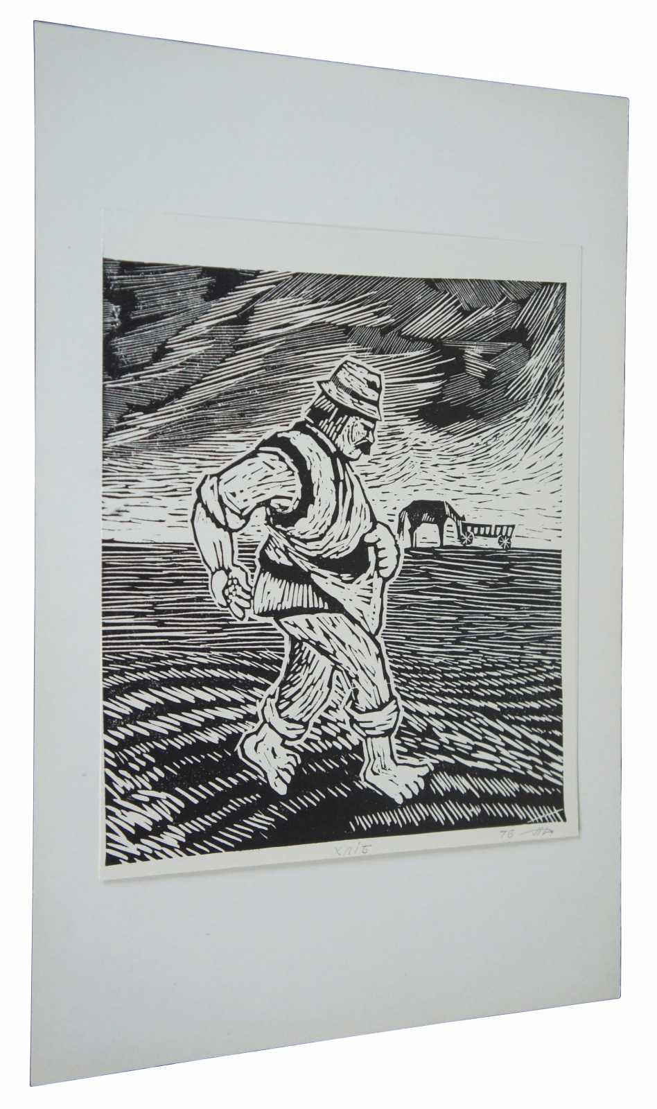 Vintage 1976 black and white Ukrainian etching by Lanyak Dmytro Oleksiiovych showing a barefoot farmer sowing seeds (making bread) in a wheat field with a horse and wagon in the background. Titled and dated in pencil by the artist.