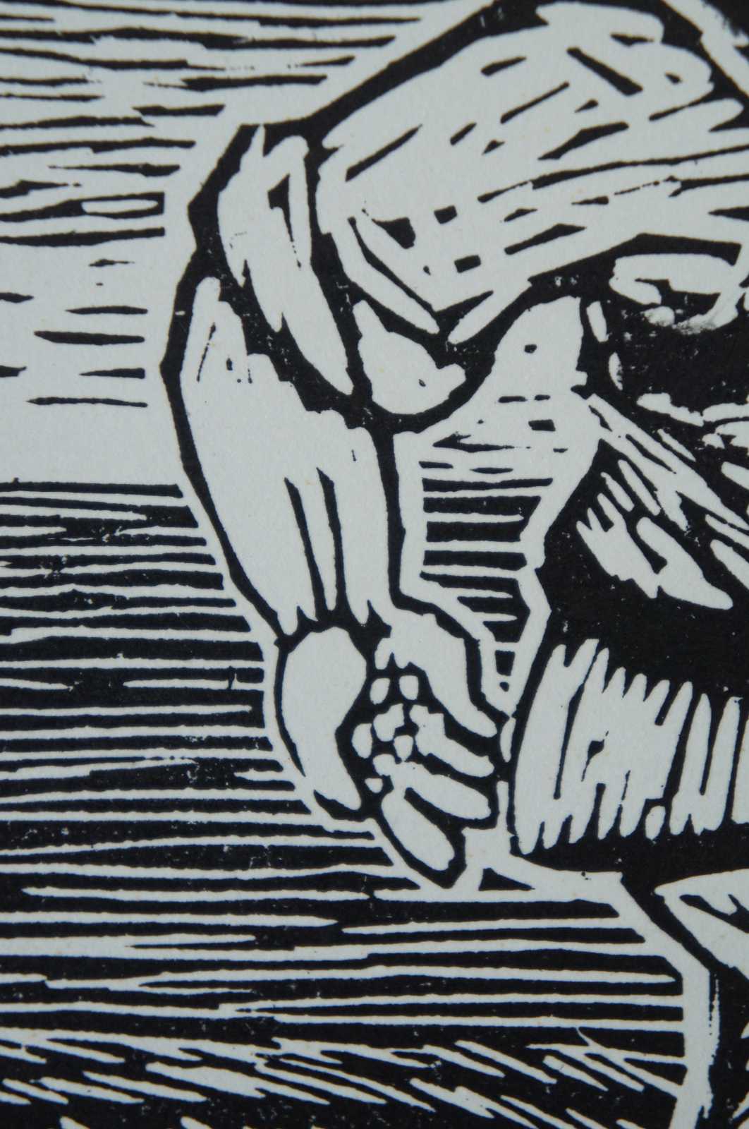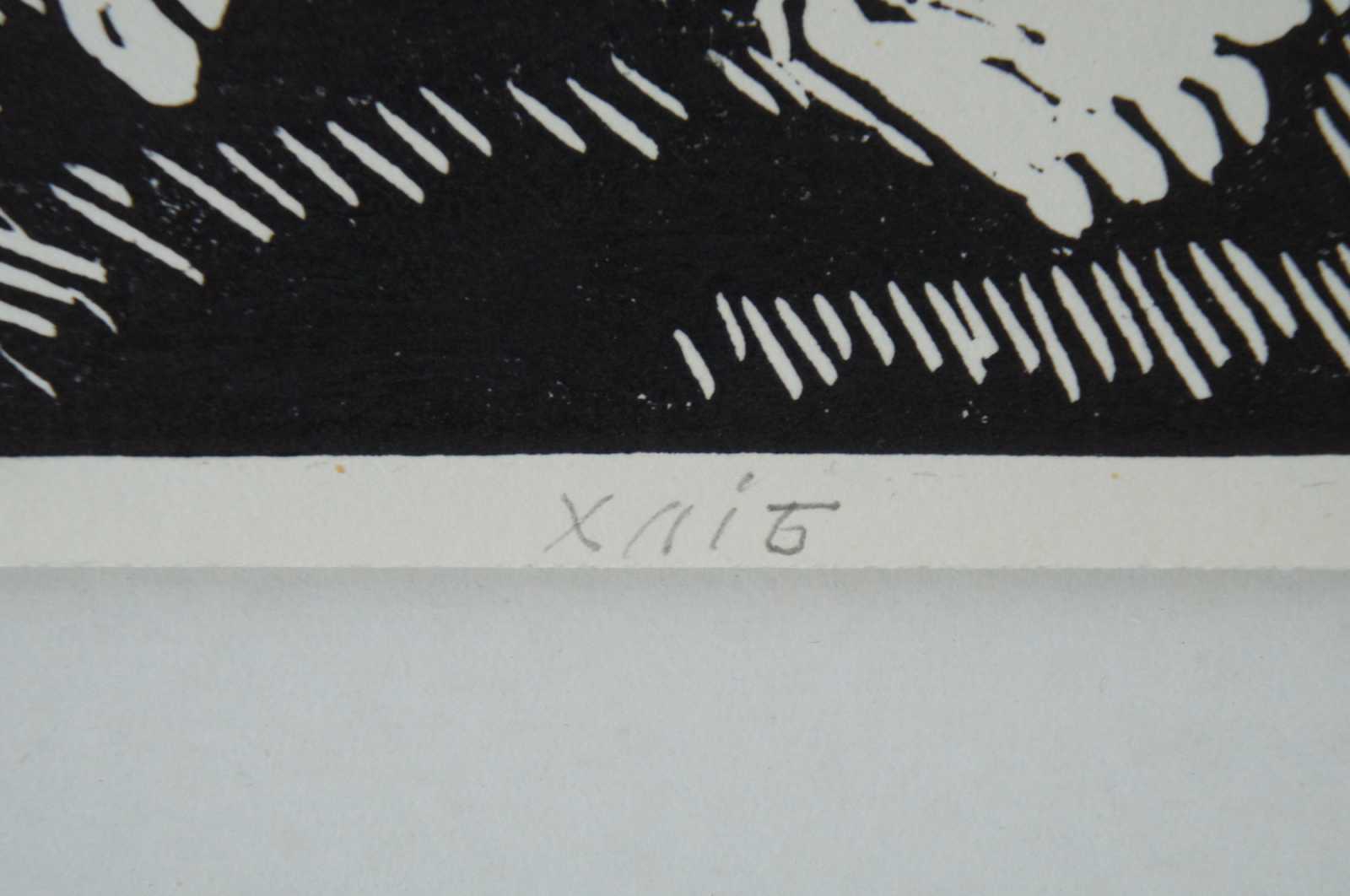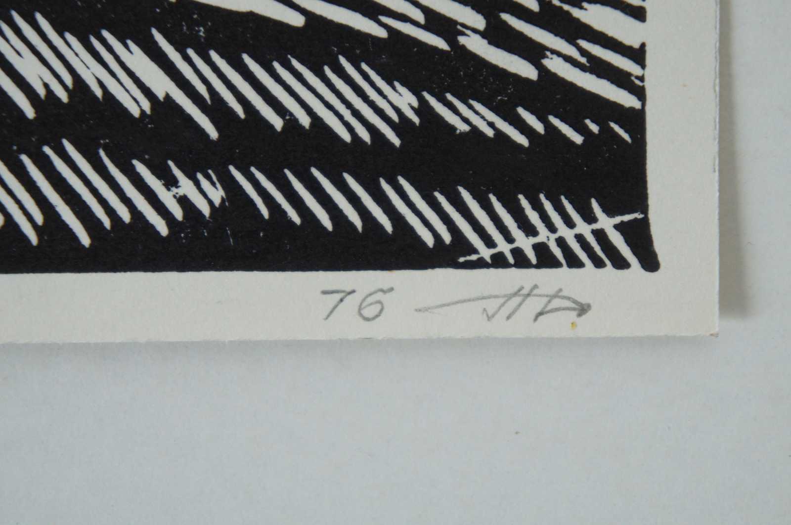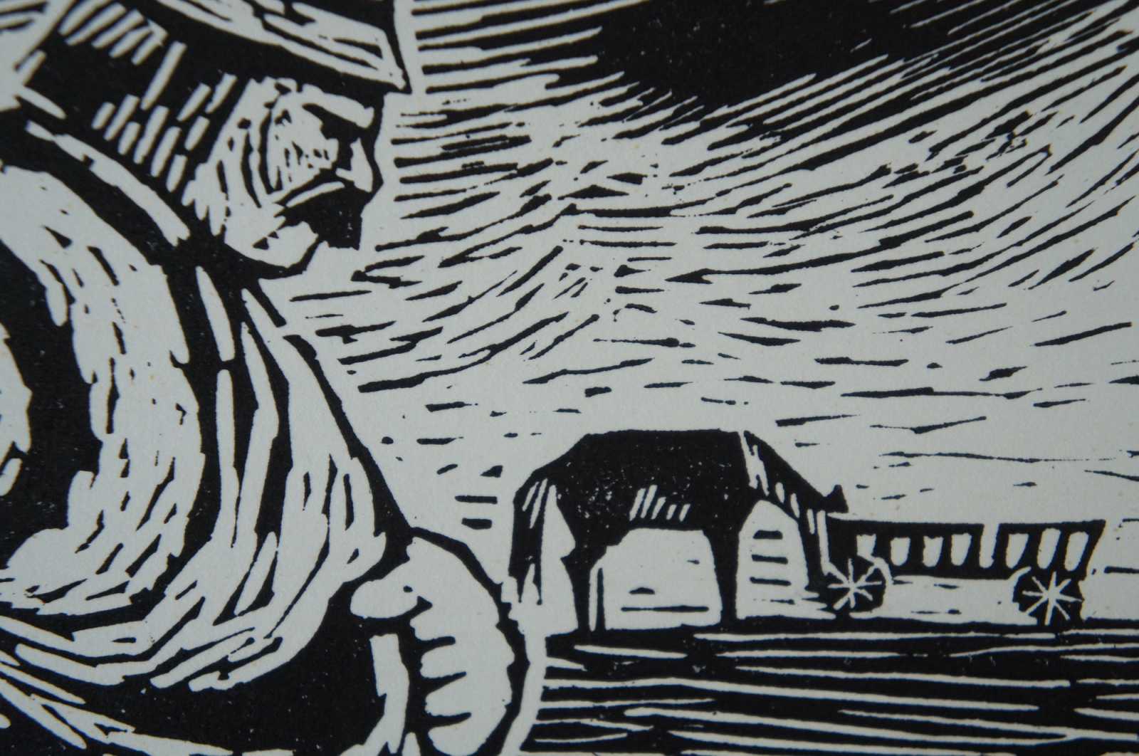 Vintage 1976 black and white Ukrainian etching by Lanyak Dmytro Oleksiiovych showing a barefoot farmer sowing seeds (making bread) in a wheat field with a horse and wagon in the background. Titled and dated in pencil by the artist.