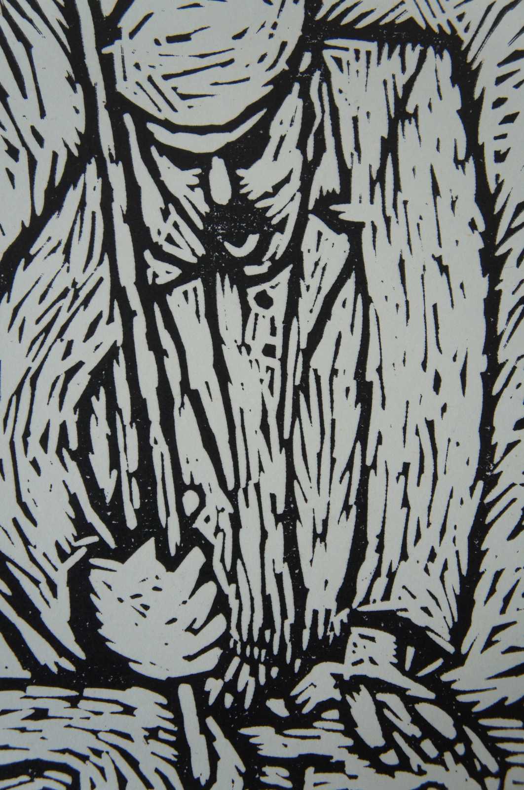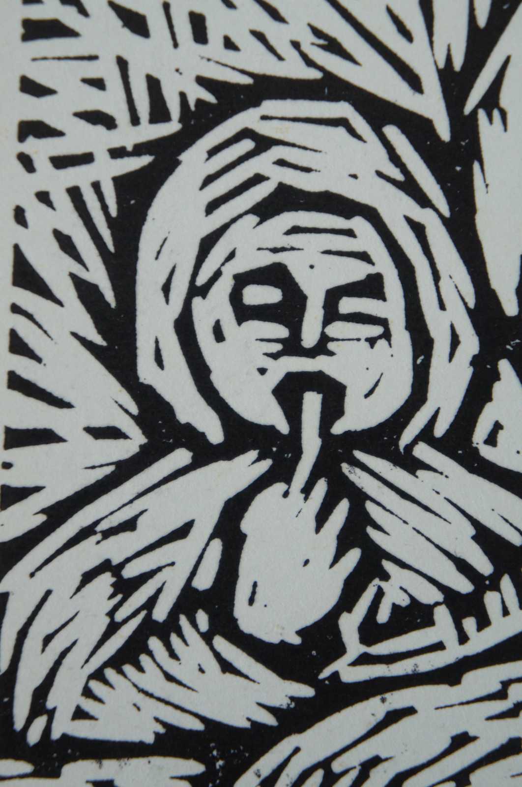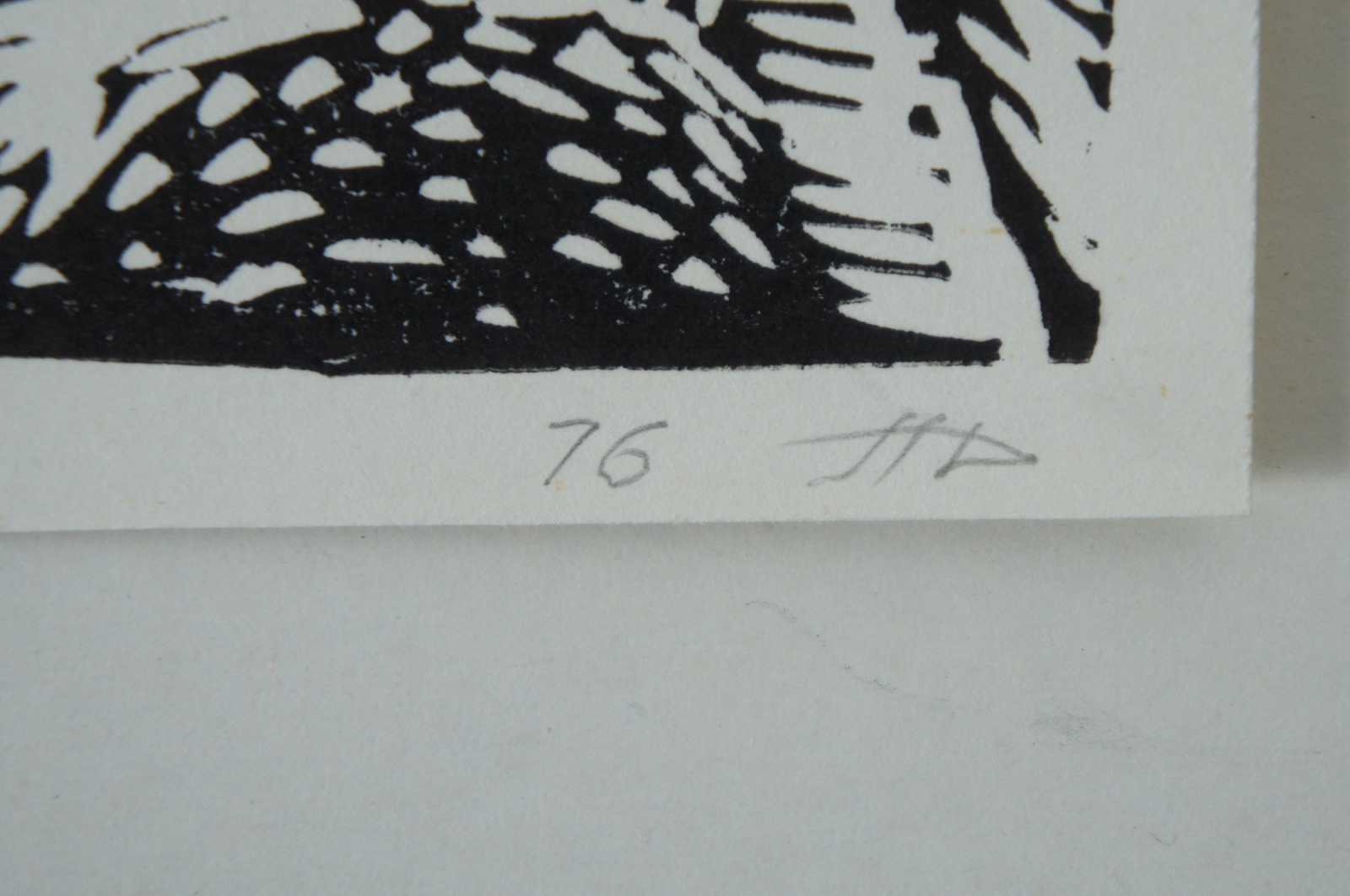 Vintage 1976 black and white Ukrainian etching by Lanyak Dmytro Oleksiiovych showing a man working on harvesting wheat / making bread over a table with a child at his side. Titled and dated in pencil by the artist.