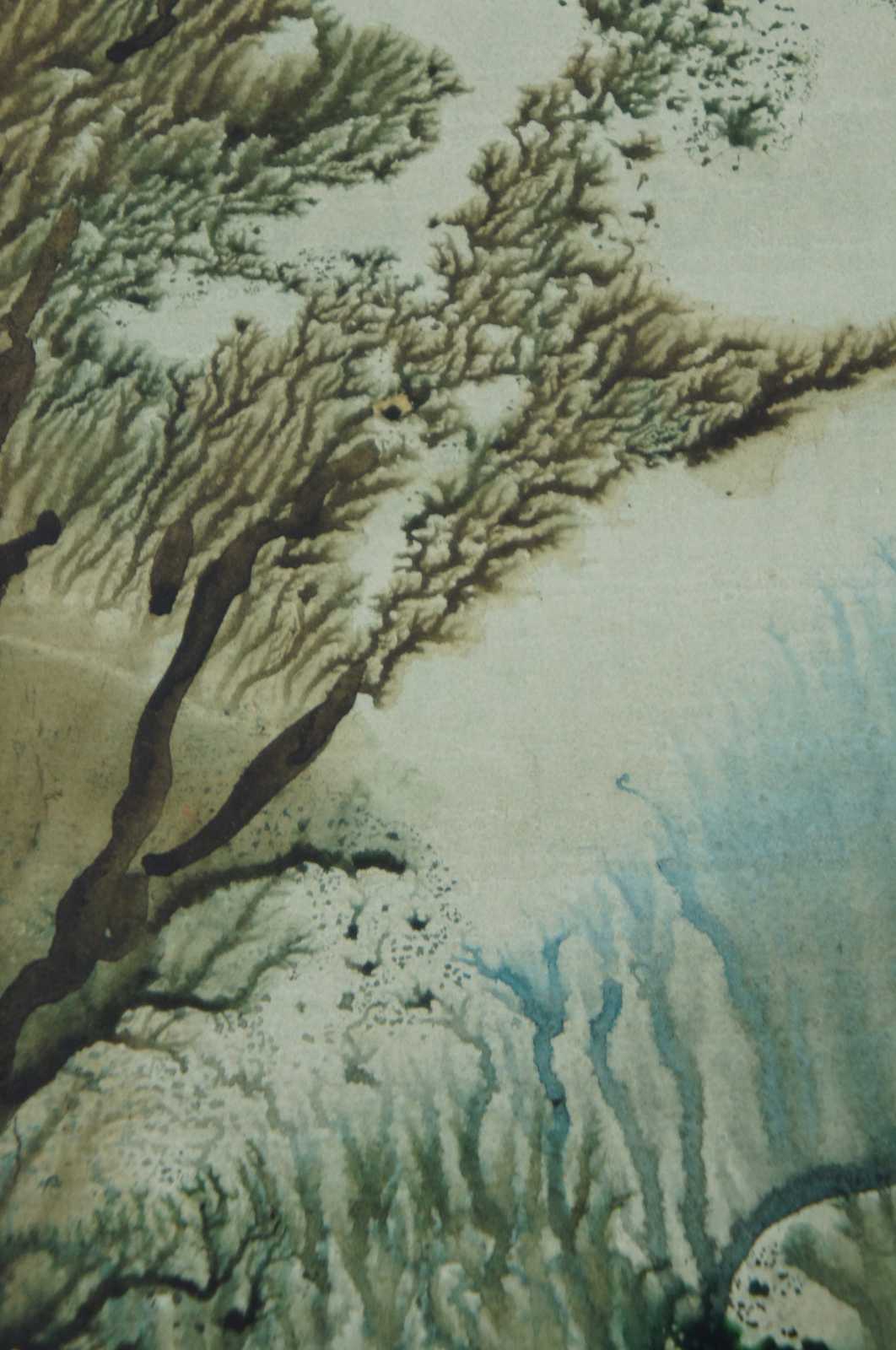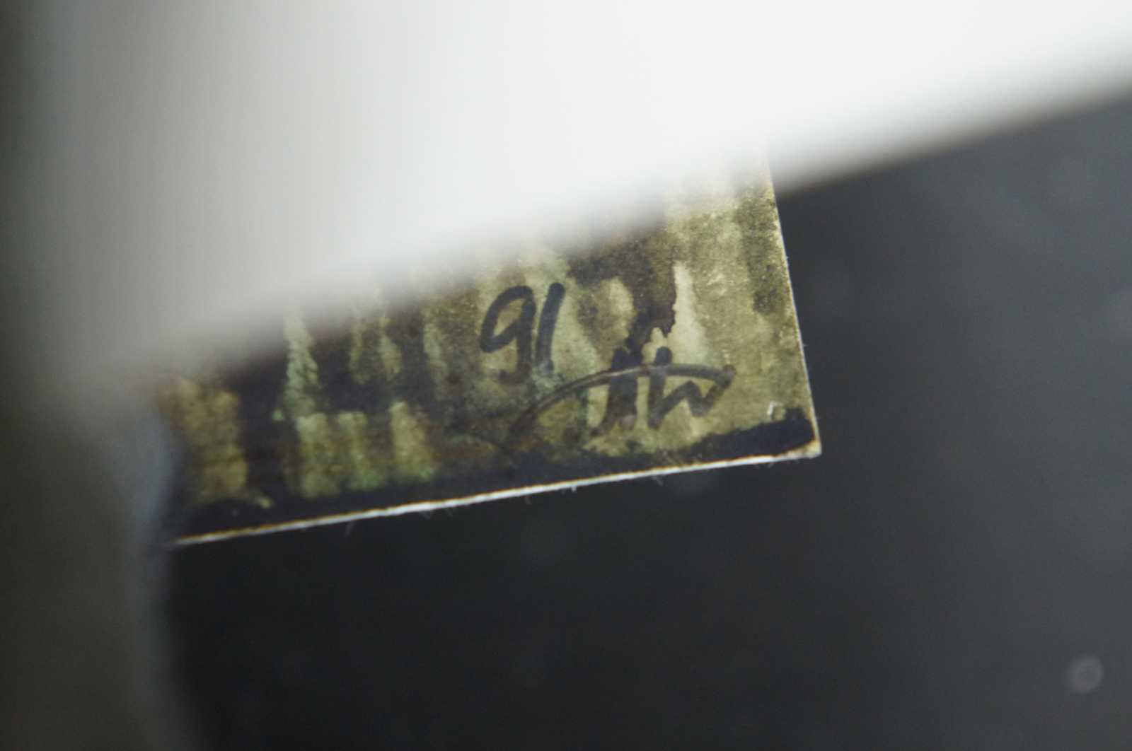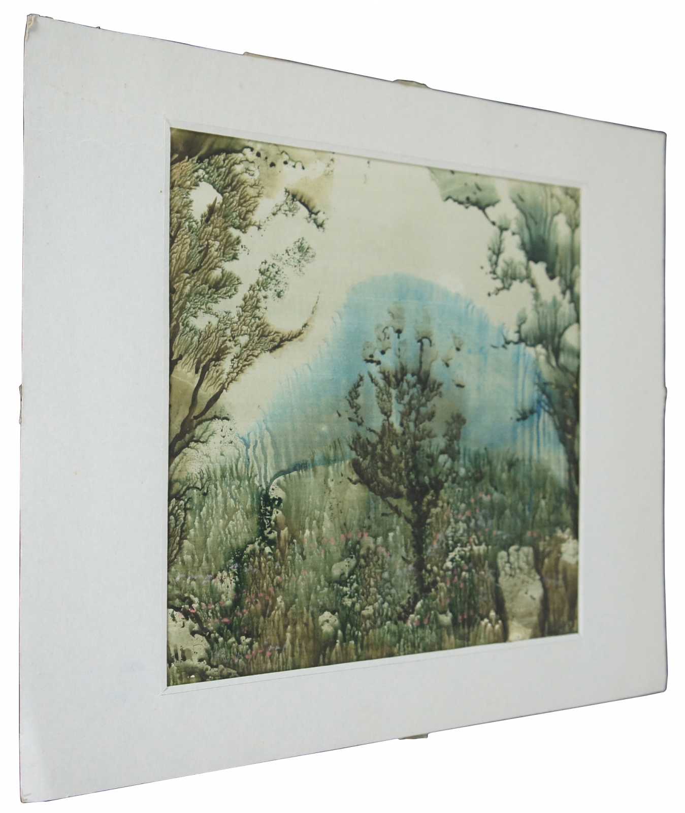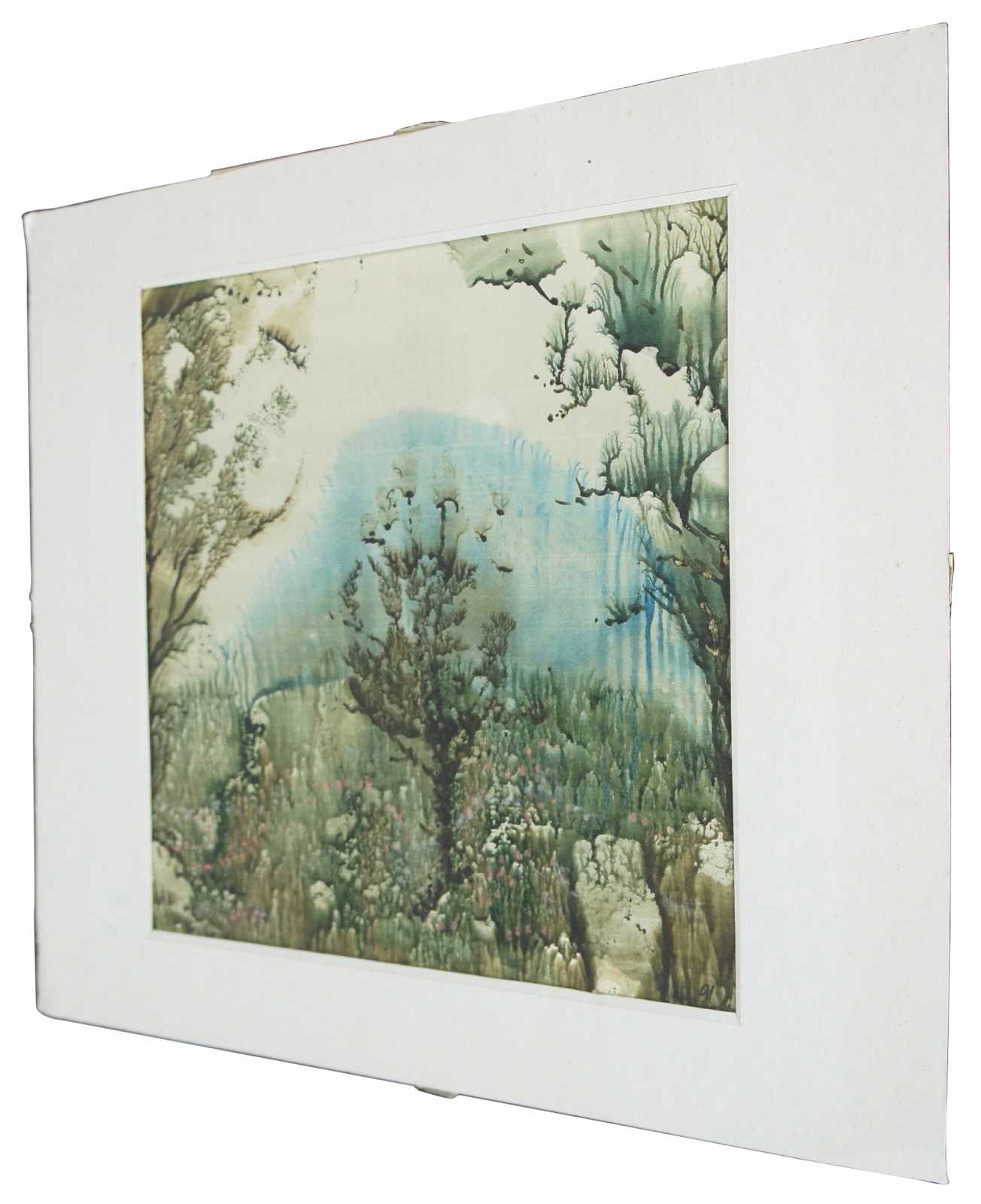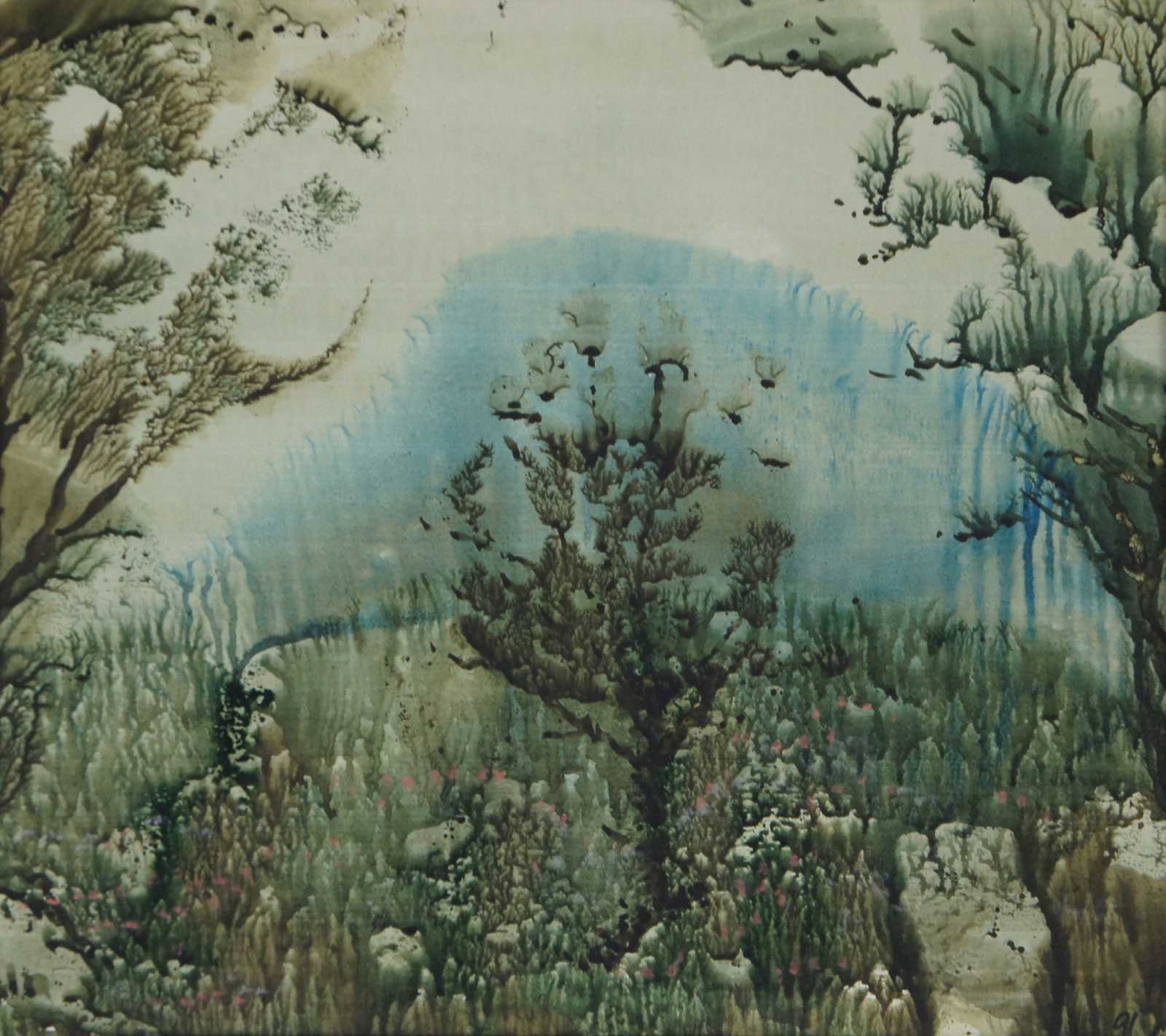 Vintage 1991 watercolor landscape painting by Lanyak Dmytro Oleksiiovych featuring a floral inspired landscape with trees; signed lower right corner.