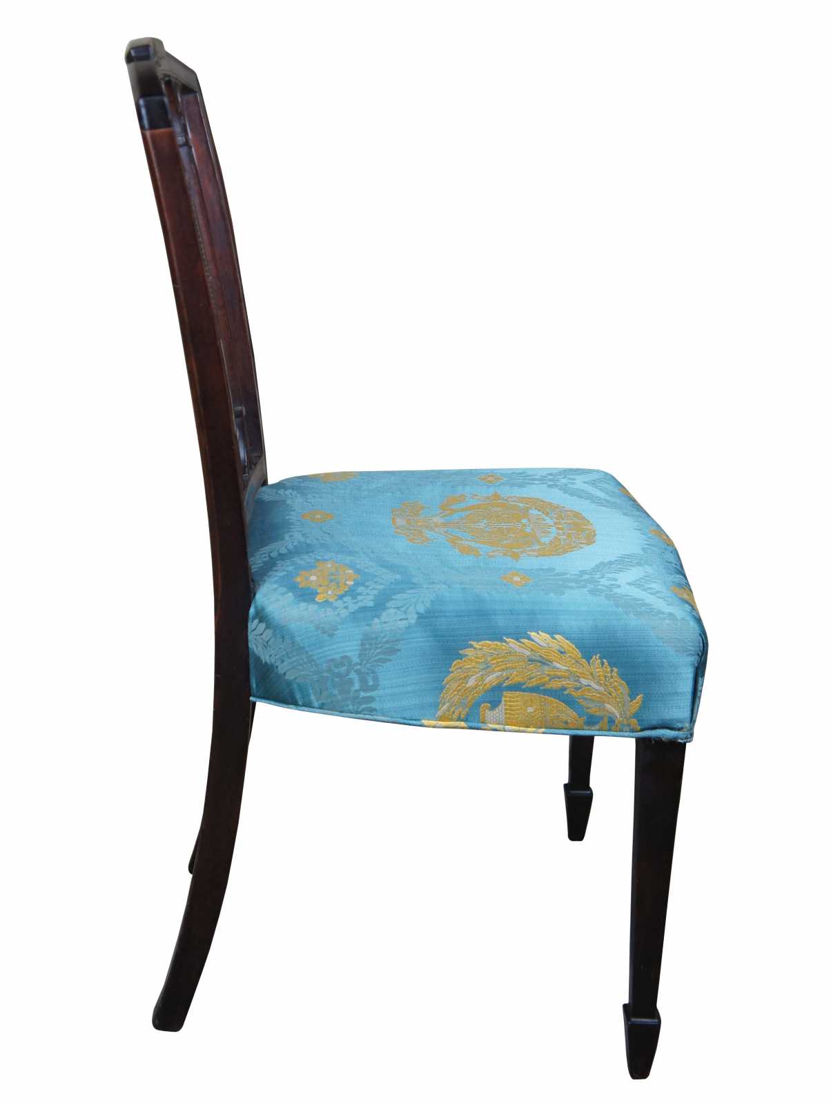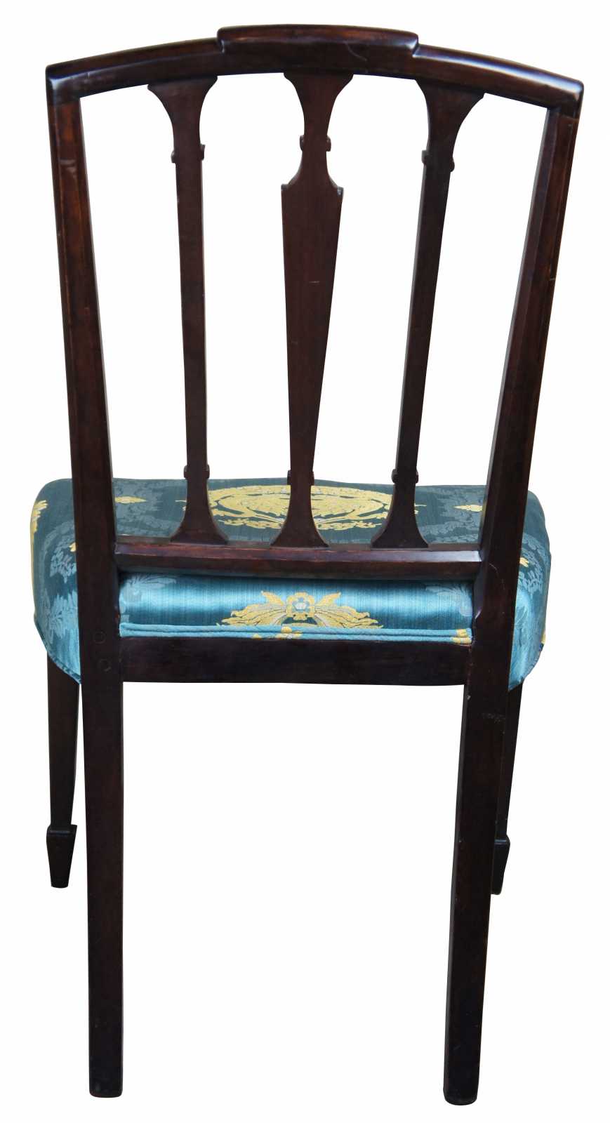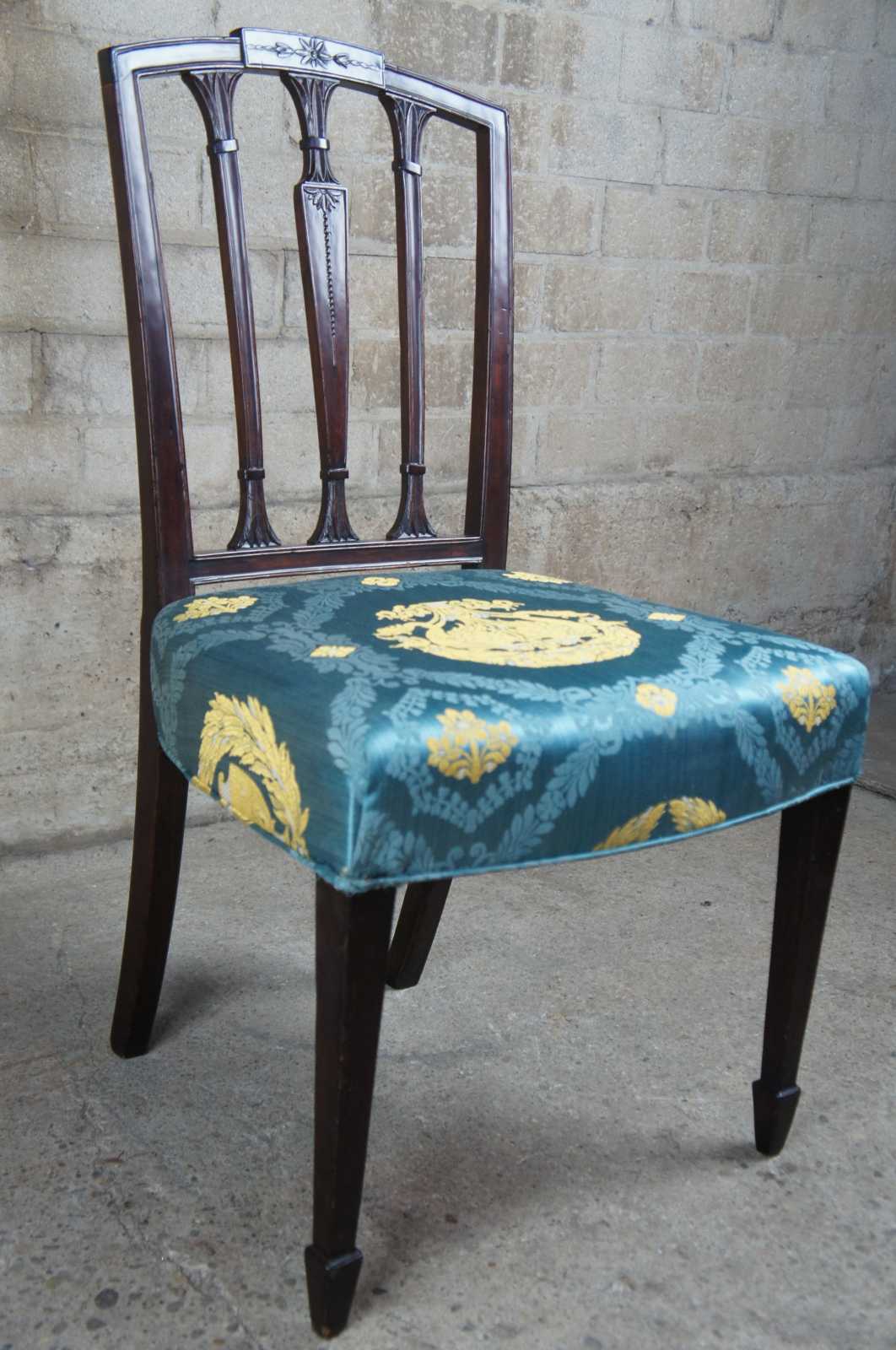 Antique Sheraton side chair. Features a carved and split back with Neoclassical elements, leading to scalamadre seat with square tapered legs that lead to a spade foot.
