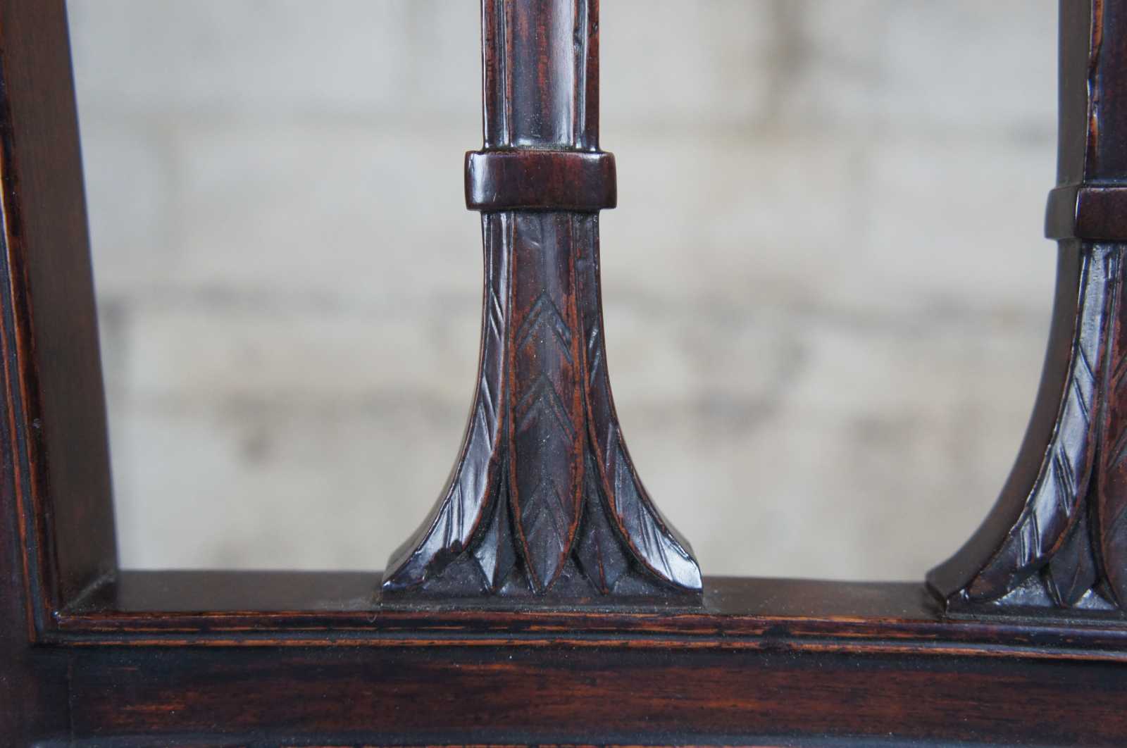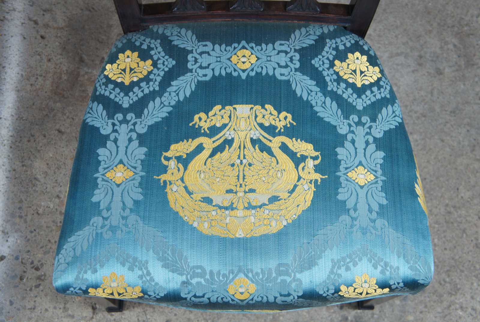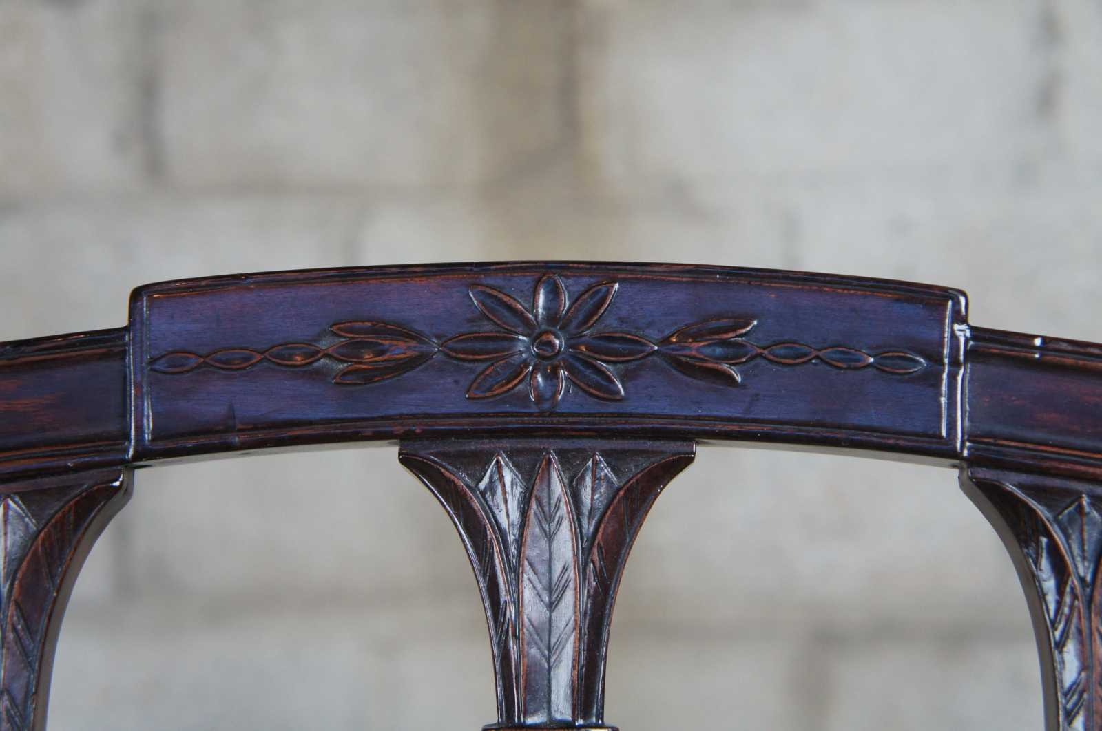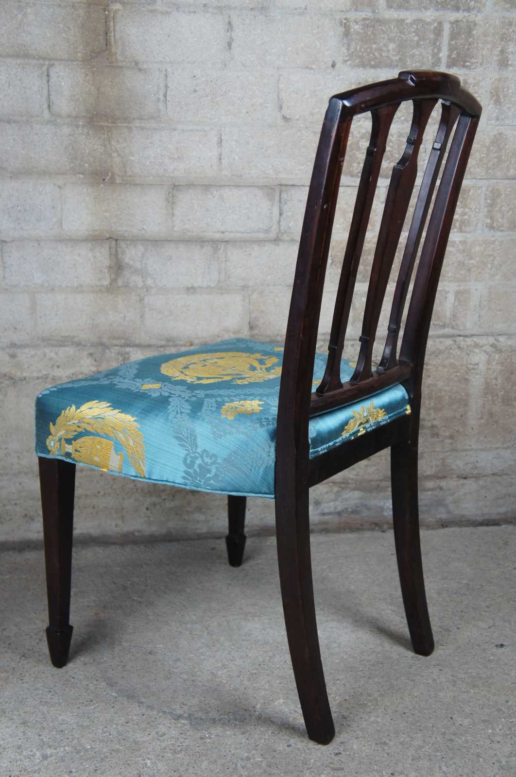 Antique Sheraton side chair. Features a carved and split back with Neoclassical elements, leading to scalamadre seat with square tapered legs that lead to a spade foot.